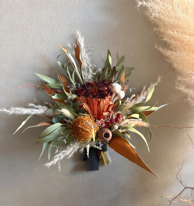 プロテアネリフォリアとパンパスグラスのスワッグ。 リューカデンドロン、グレビレアゴールド、ベルガムナッツ、アンバーナッツ、ブルニアなどネイティブフラワーをたっぷり束ねました。サンキライも添えて季節感のあるスワッグに仕上げました。 縦、横、斜めとお好みの角度に調節可能。 ブーケとしてもお楽しみいただけます。 size 縦約32㎝ 横約29㎝ 【お取り扱いについて】 自然素材の特性により、日々色味の変化が見られます。ドライフラワーならではの風合いや色合いの深まりを、ぜひお楽しみください。 直射日光や湿気が苦手な商品ですので、湿気の多い場所での使用や保管には十分にご注意いただけますようお願い申し上げます。カビが発生する可能性もあるため、心配される方は特にご注意ください。 配送時やディスプレイ時には、花や葉が落ちる場合がございます。この点についても、あらかじめご理解いただけますようお願い申し上げます。