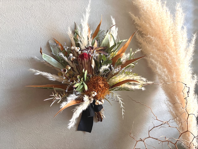プロテアとパンパスグラスのスワッグ。 ふわふわのパンパスグラスにプロテア、フォルモーサ、グレビレアゴールド、リューカデンドロン、アンバーナッツなどネイティブプランツを束ね、暖かみのあるスワッグに仕上げました。 お正月飾りにもおすすめです。 縦、横、斜めとお好みの角度に調節可能。 ブーケとしてもお楽しみいただけます。 size 縦約34㎝ 横約32㎝ 【お取り扱いについて】 自然素材の特性により、日々色味の変化が見られます。ドライフラワーならではの風合いや色合いの深まりを、ぜひお楽しみください。 直射日光や湿気が苦手な商品ですので、湿気の多い場所での使用や保管には十分にご注意いただけますようお願い申し上げます。カビが発生する可能性もあるため、心配される方は特にご注意ください。 配送時やディスプレイ時には、花や葉が落ちる場合がございます。この点についても、あらかじめご理解いただけますようお願い申し上げます。