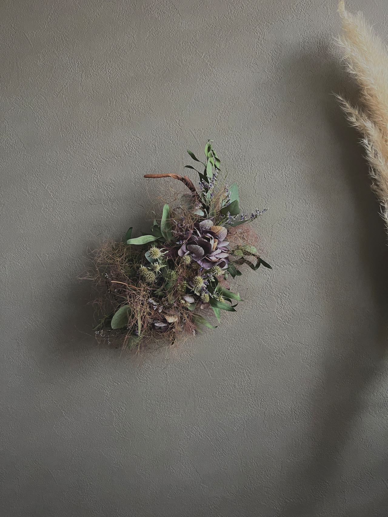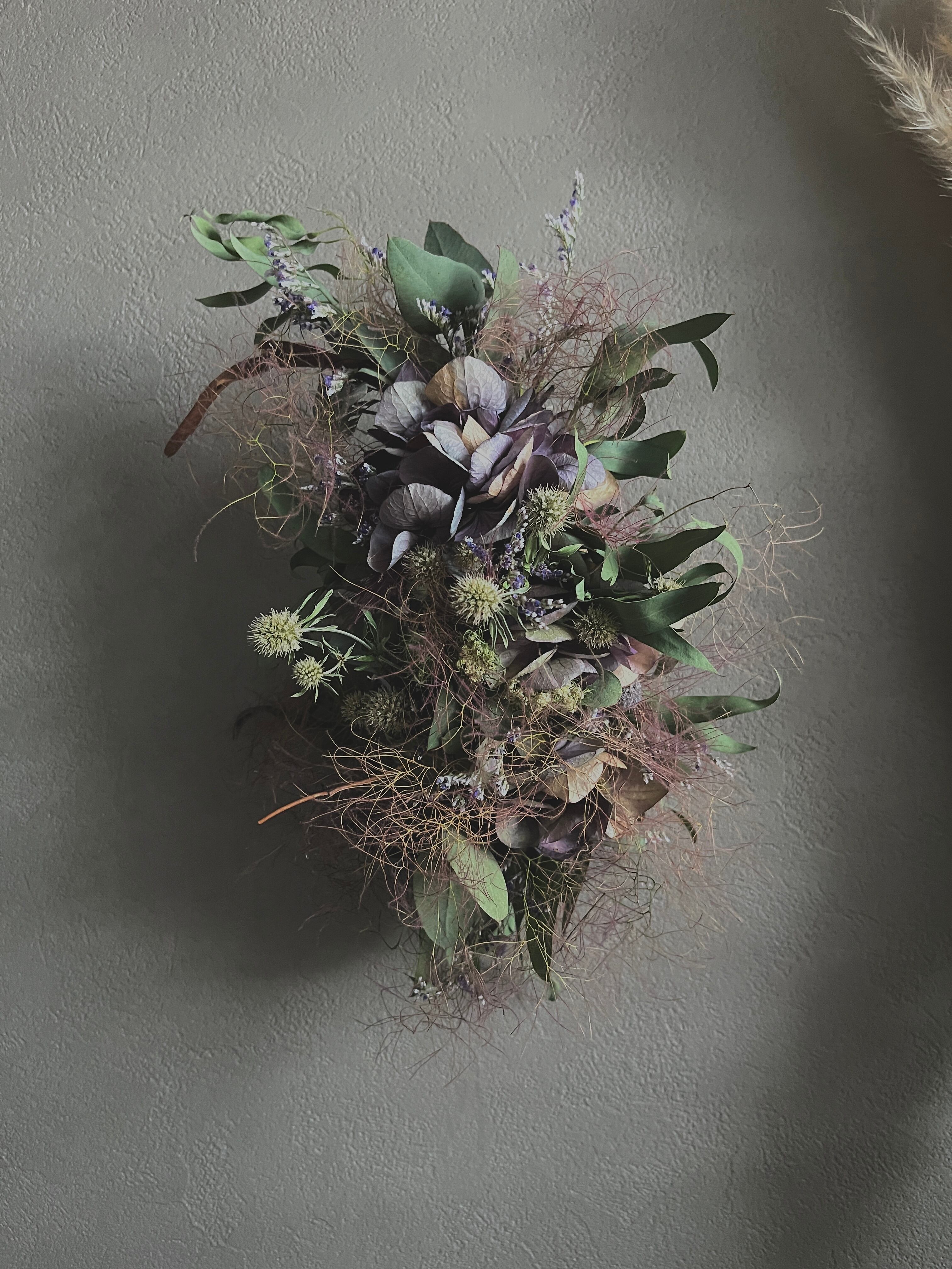 スモークツリーと紫陽花を美しく束ねたドライフラワースワッグです。優しい風合いを持つスモークツリーと、シャビーな雰囲気を持つ紫陽花が織りなすハーモニー。玄関やリビングのインテリアにいかがでしょうか。特別な日のギフトに、誕生日や記念日、友人への思いを込めたサプライズにも重宝します。