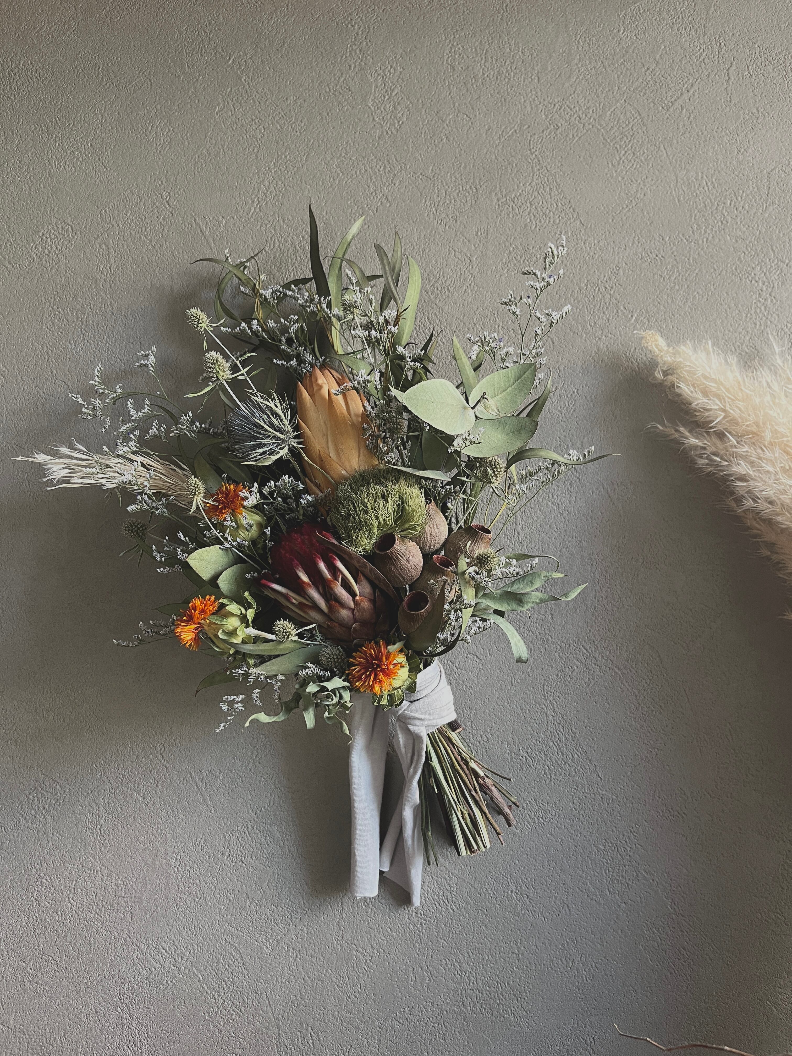 プロテアとユーカリを美しく束ねたスワッグです。存在感のあるプロテアと、心地よい香りが漂うユーカリは絶妙なコントラストは、玄関やリビングに飾れば、空間に華やかさを添え、リラックスした雰囲気を演出します。お気に入りの角度で、縦、横、斜めと様々なスタイルでお楽しみいただけます。