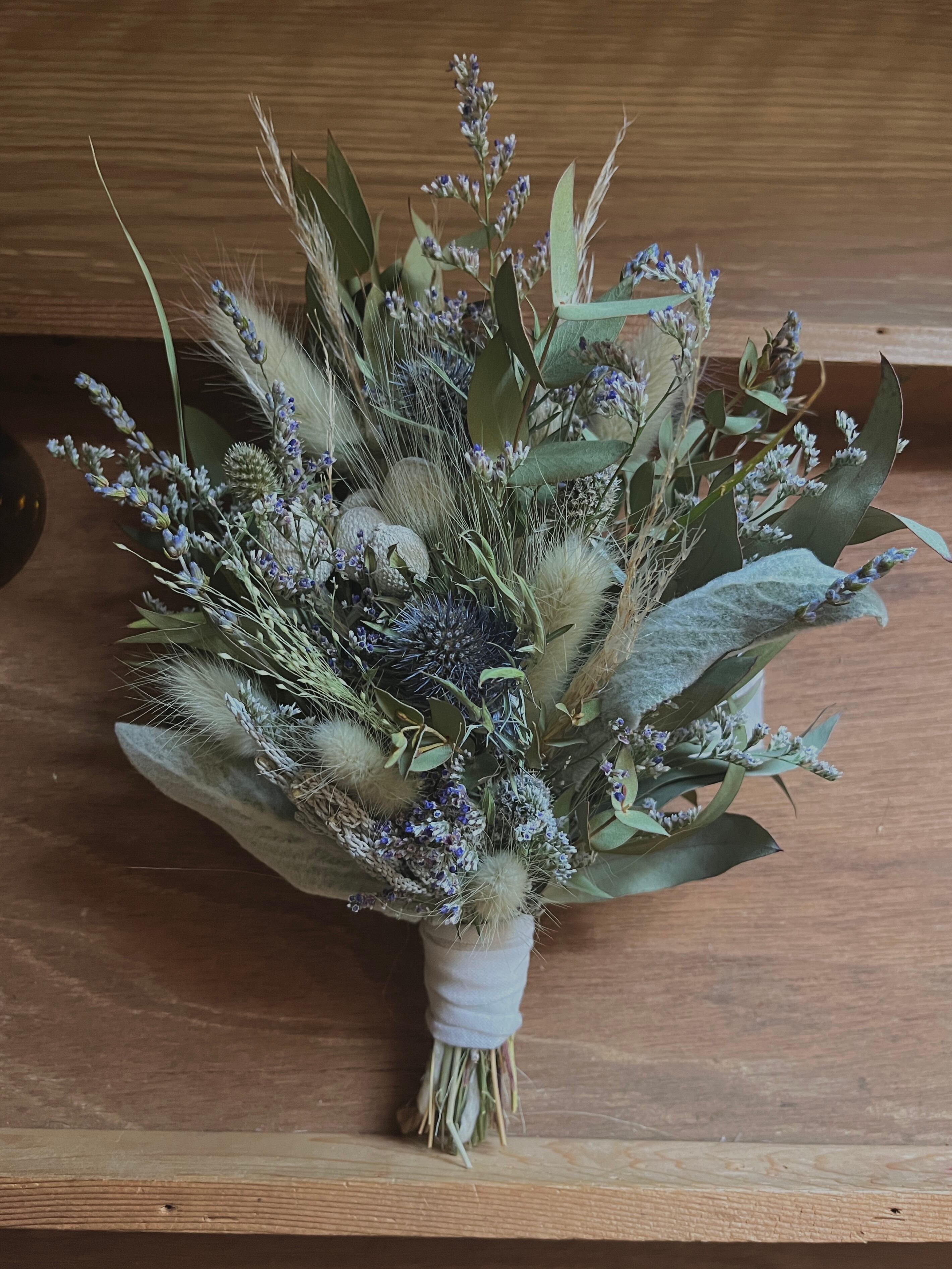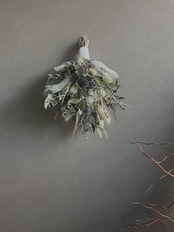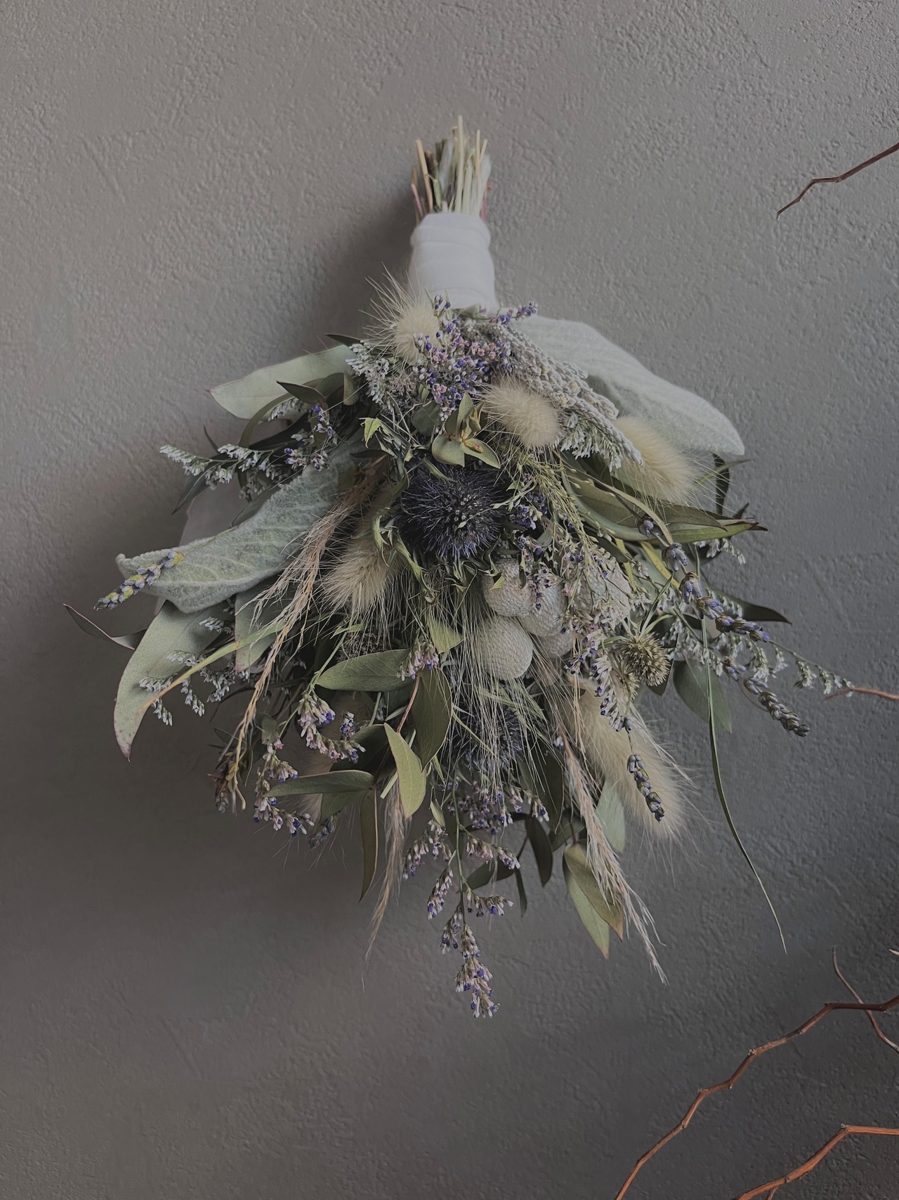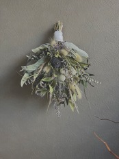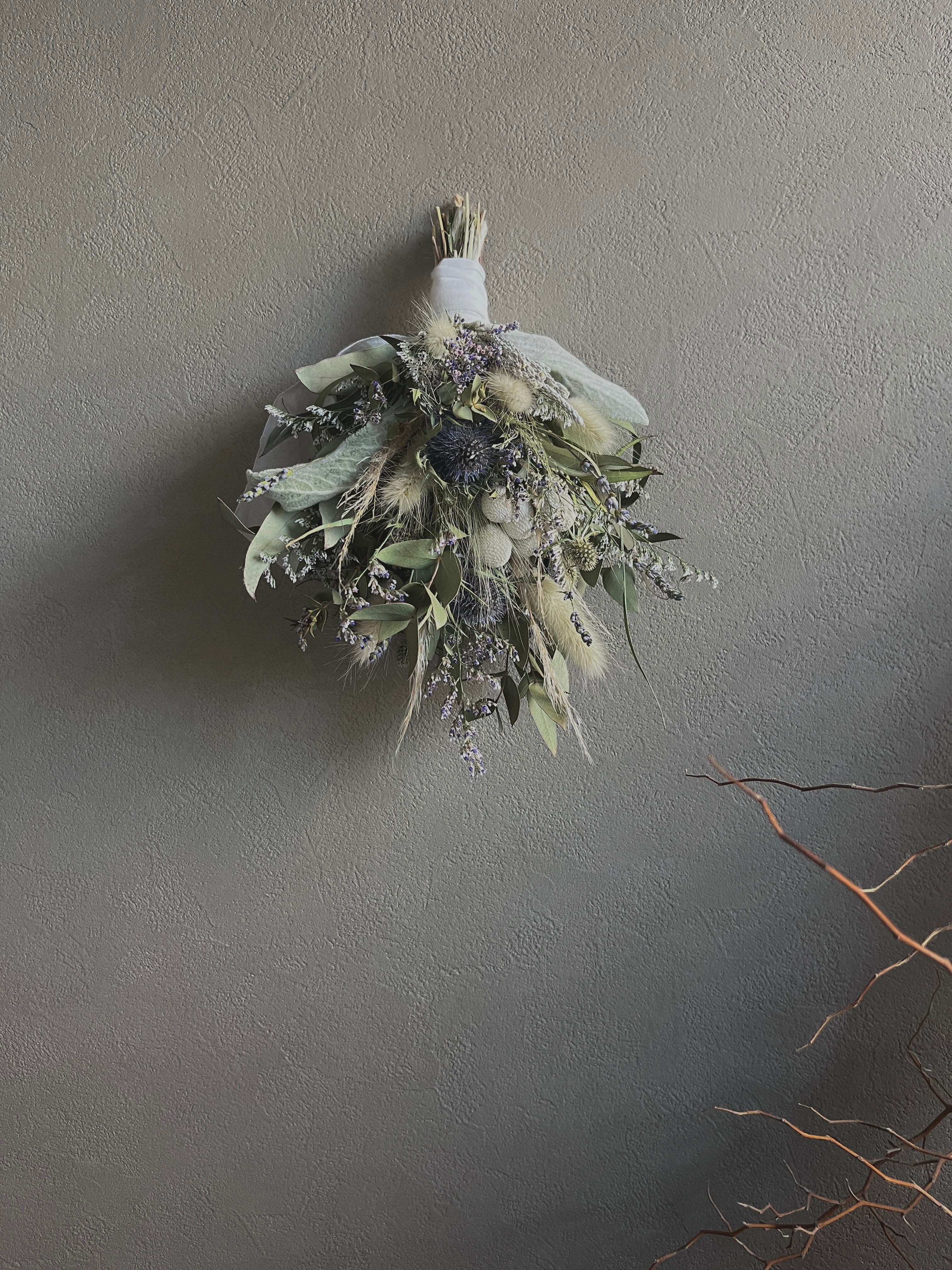 ユーカリとエリンジウムを束ねた夏にぴったりな涼しげなスワッグです。ラベンダーやブルーファンタジアなども添えて。