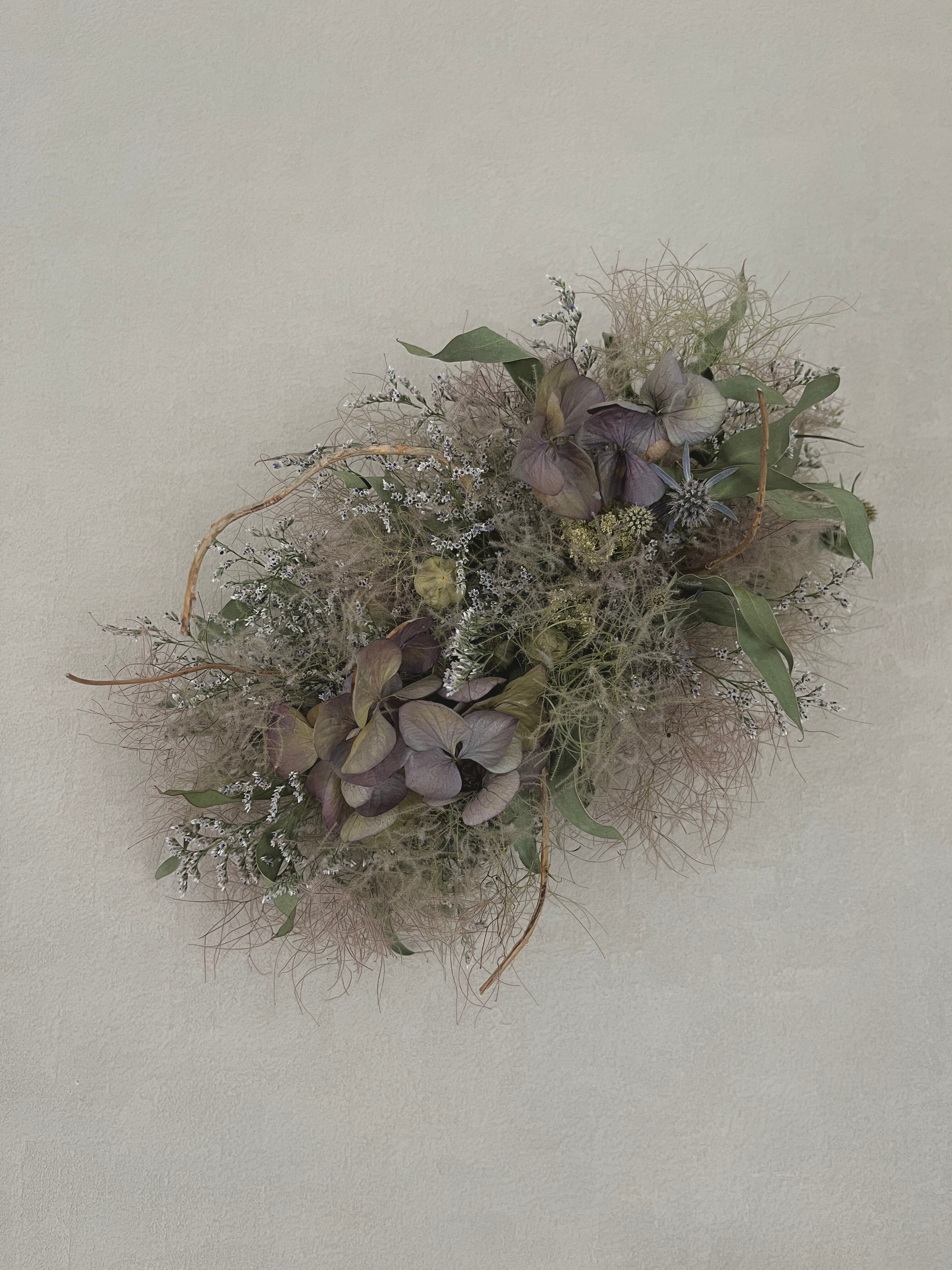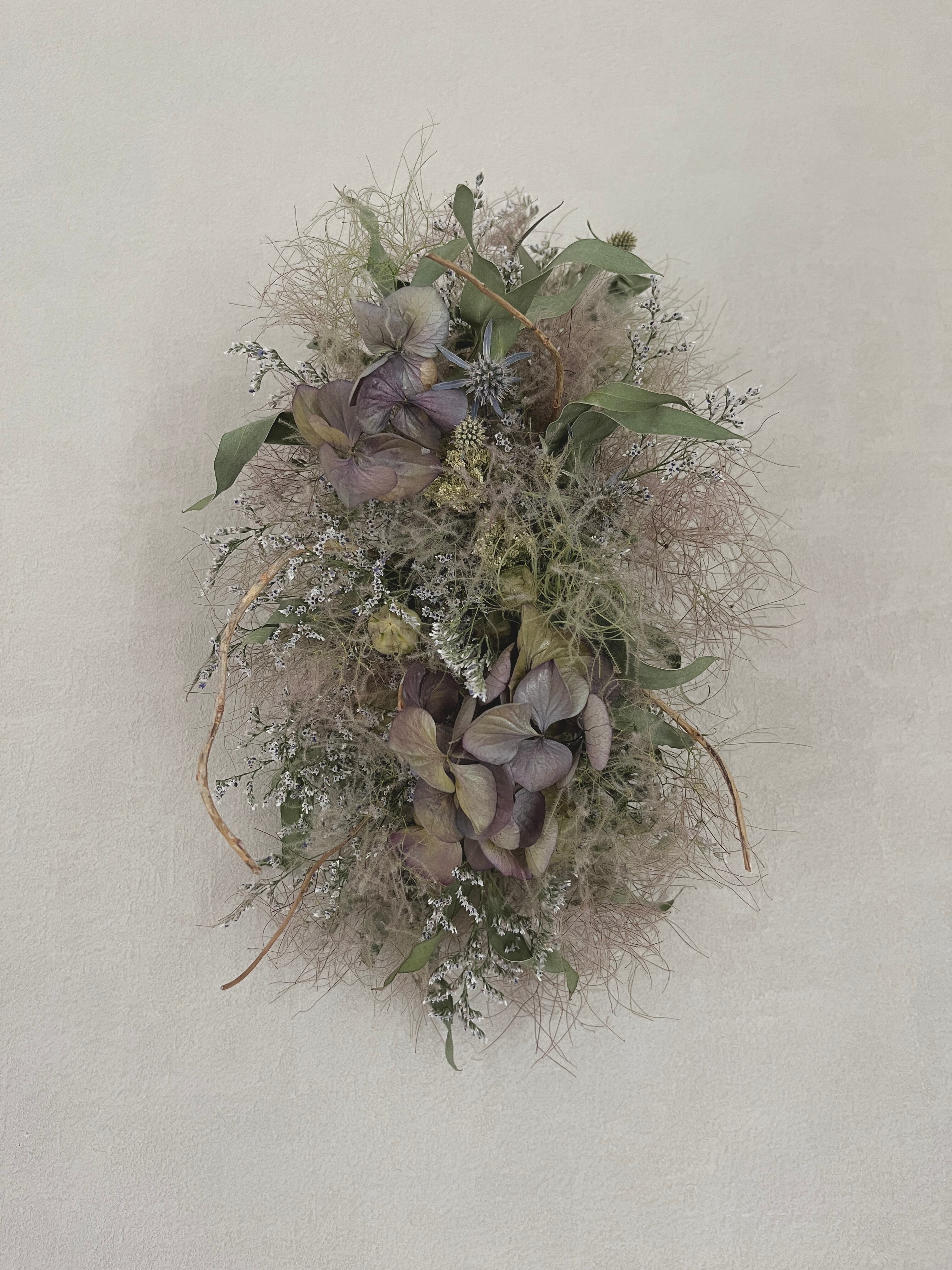 紫陽花の繊細な色合いと、エアリーなスモークツリーとの組み合わせが、優雅で穏やかな雰囲気を醸し出します。リビングや玄関に飾れば、心地よい癒しの空間を演出し、訪れる人々を和ませます。