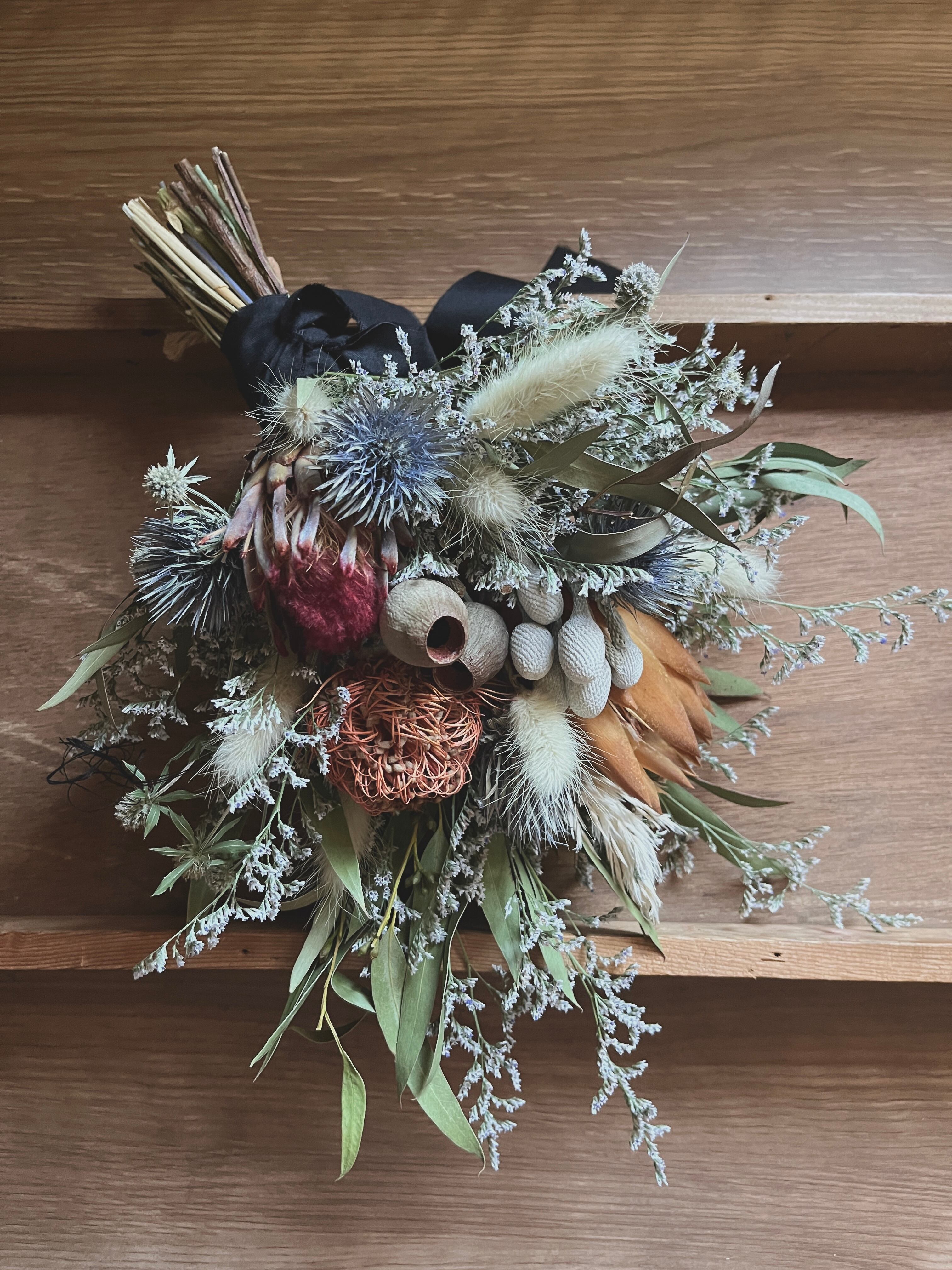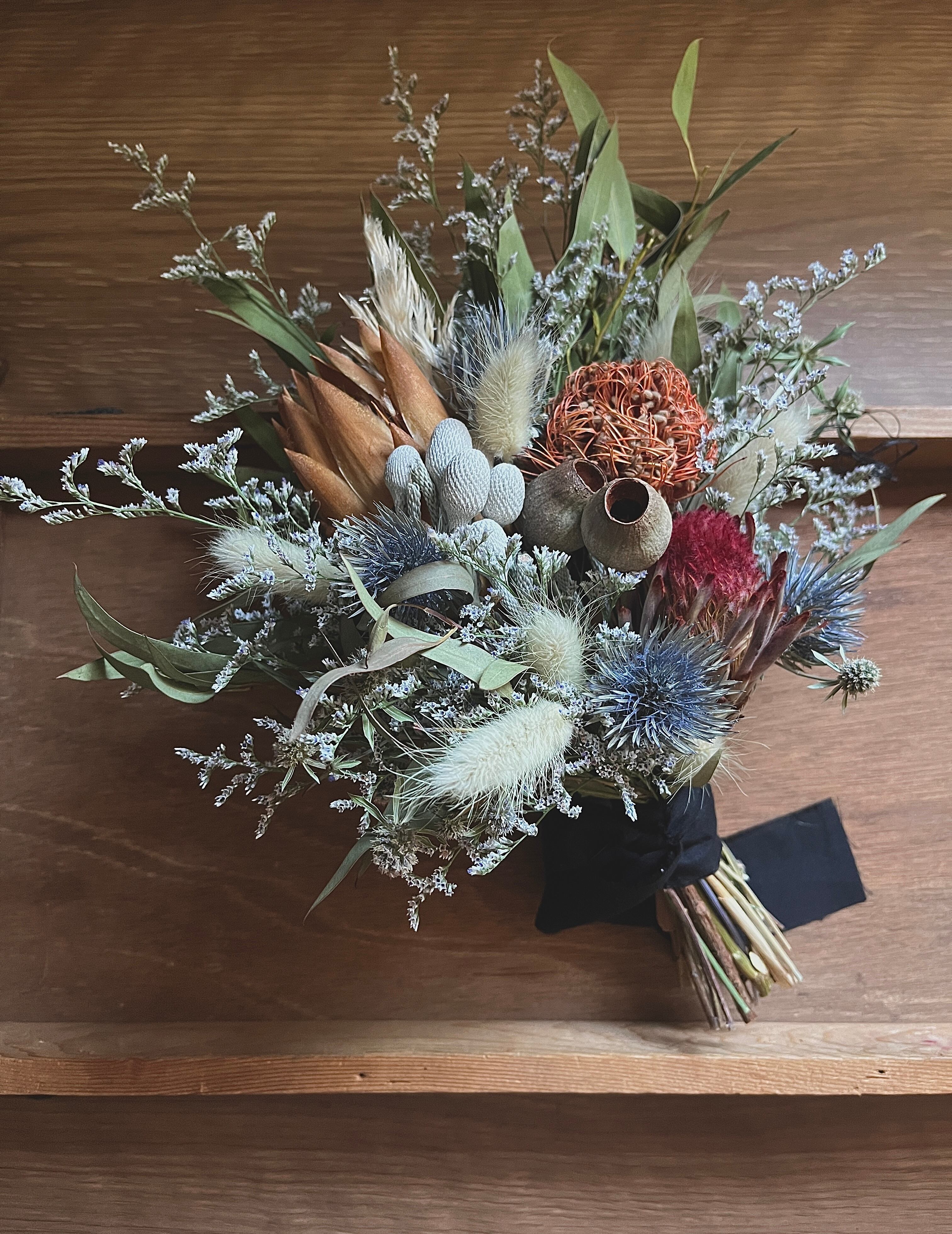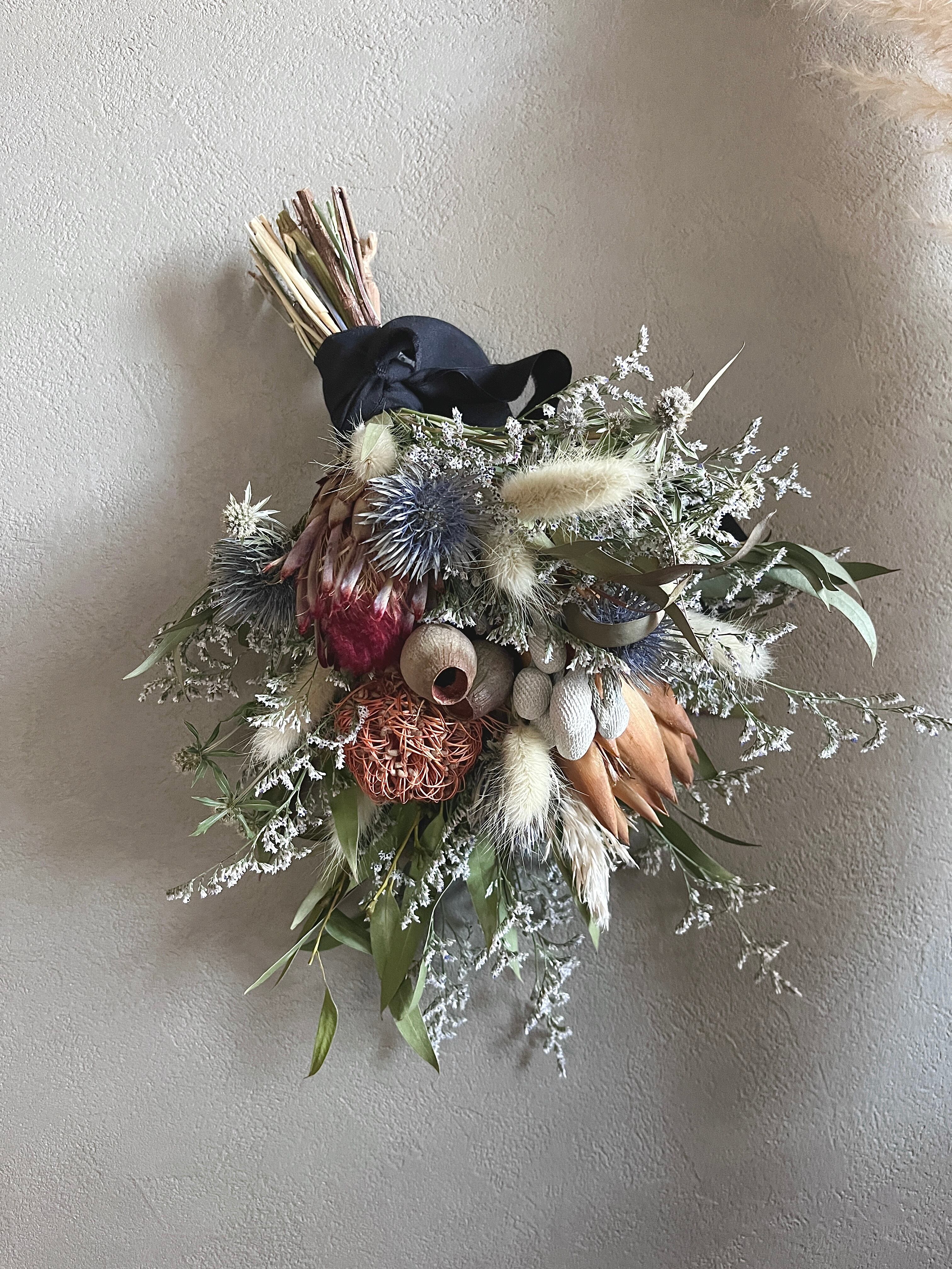 プロテアの存在感あふれる姿と、他のワイルドフラワーとの調和が、自然の美しさを引き立てます。