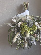 瑠璃玉アザミと季節の草花スワッグです。