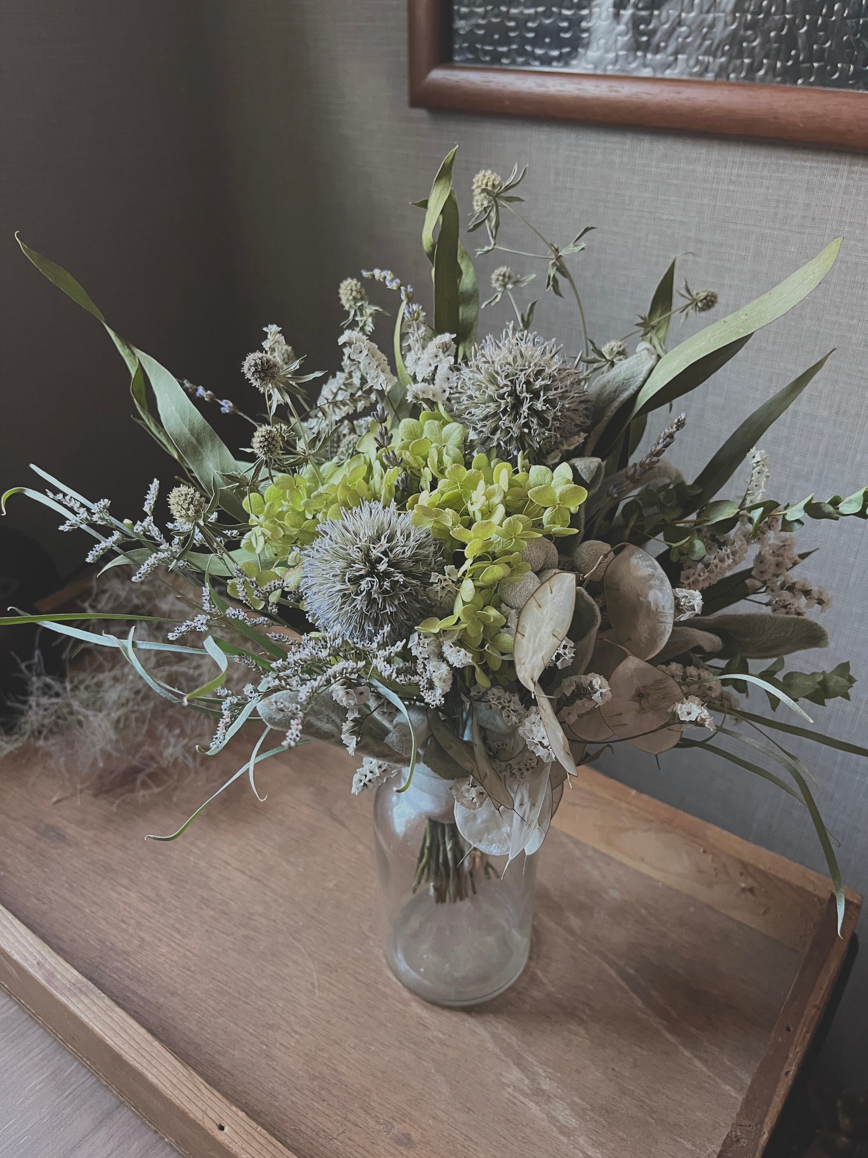 瑠璃玉アザミのブルーと、ルナニアの透き通る美しさが調和し、心地よい癒しの空間を演出します。