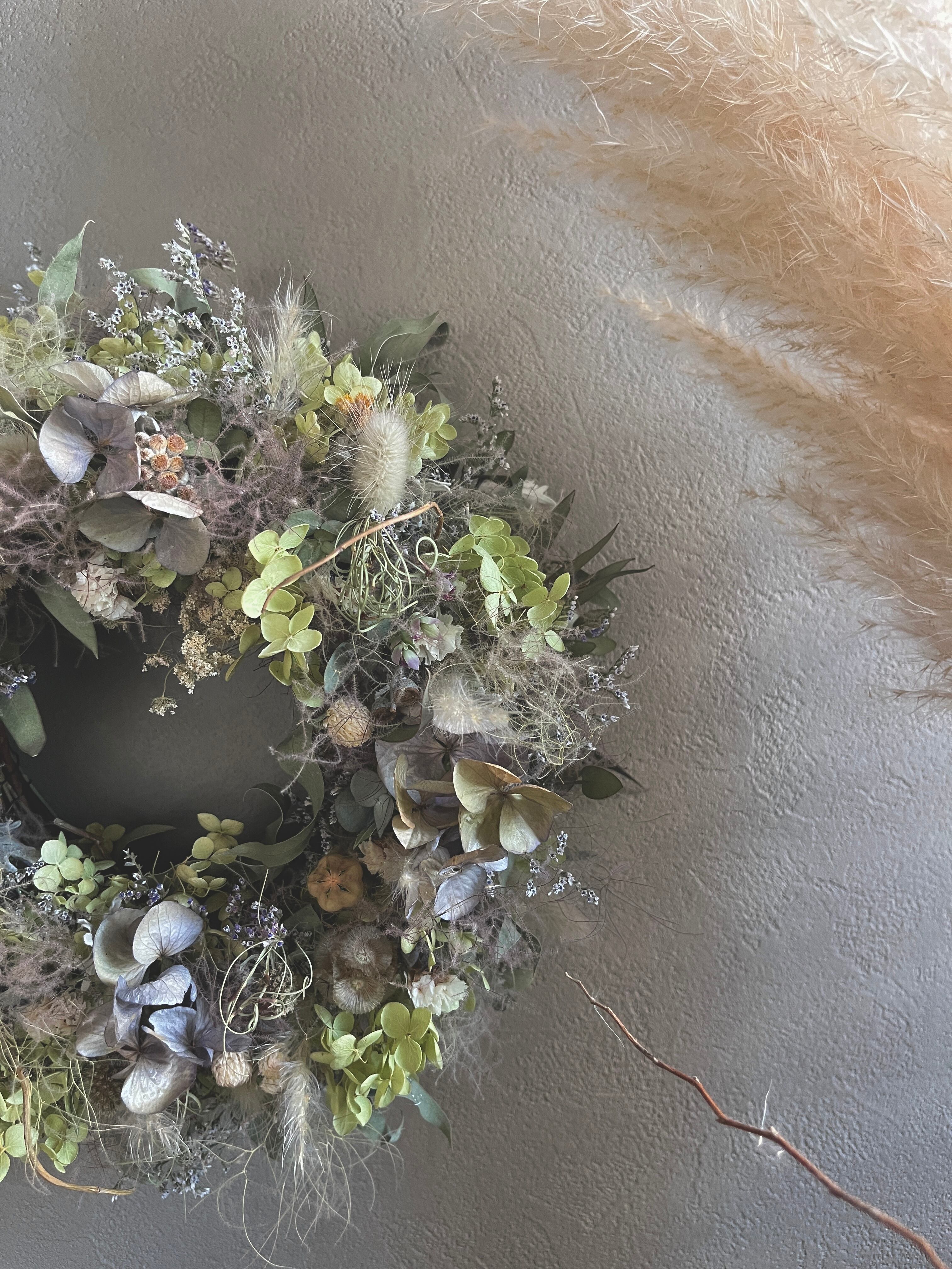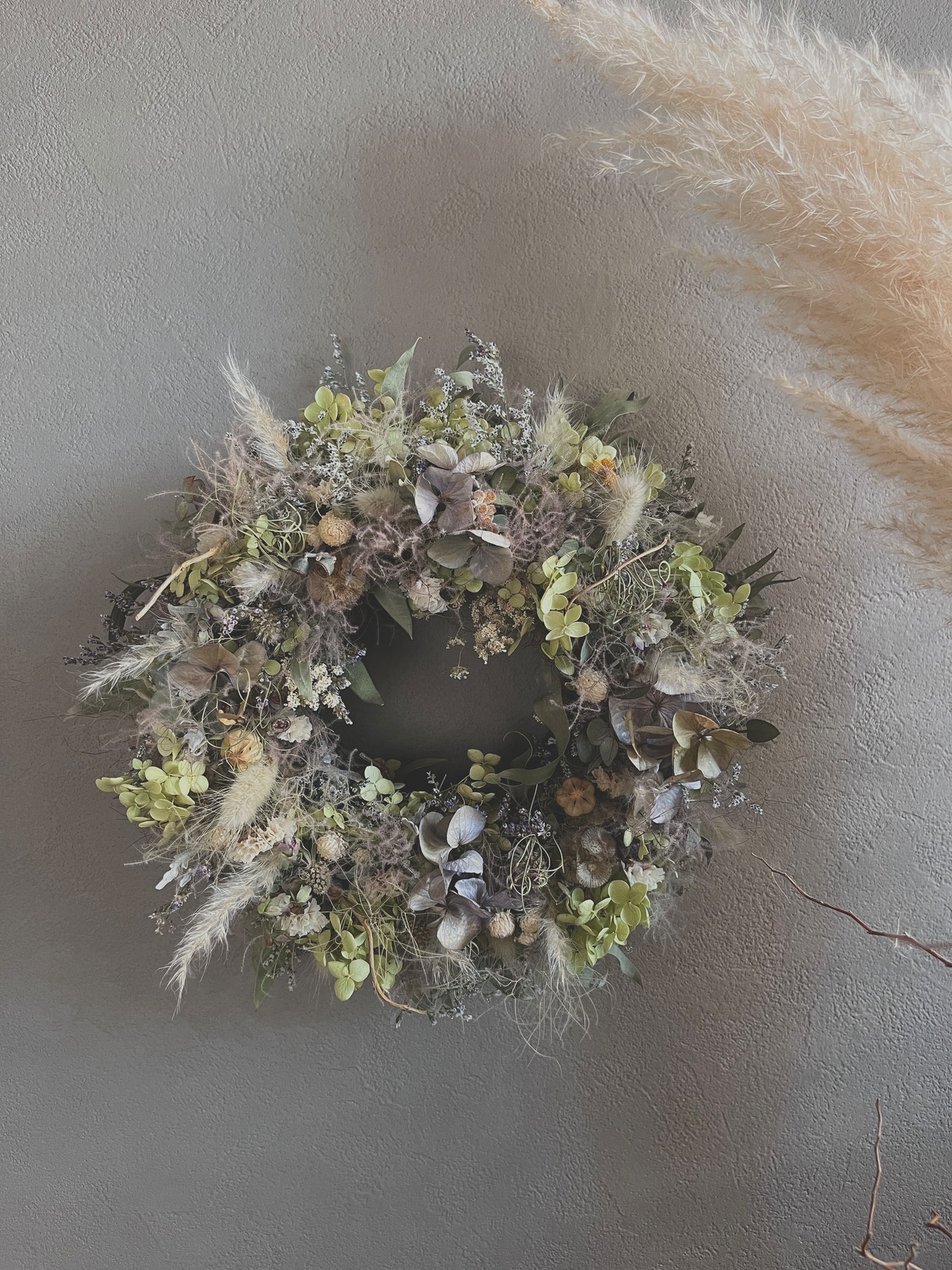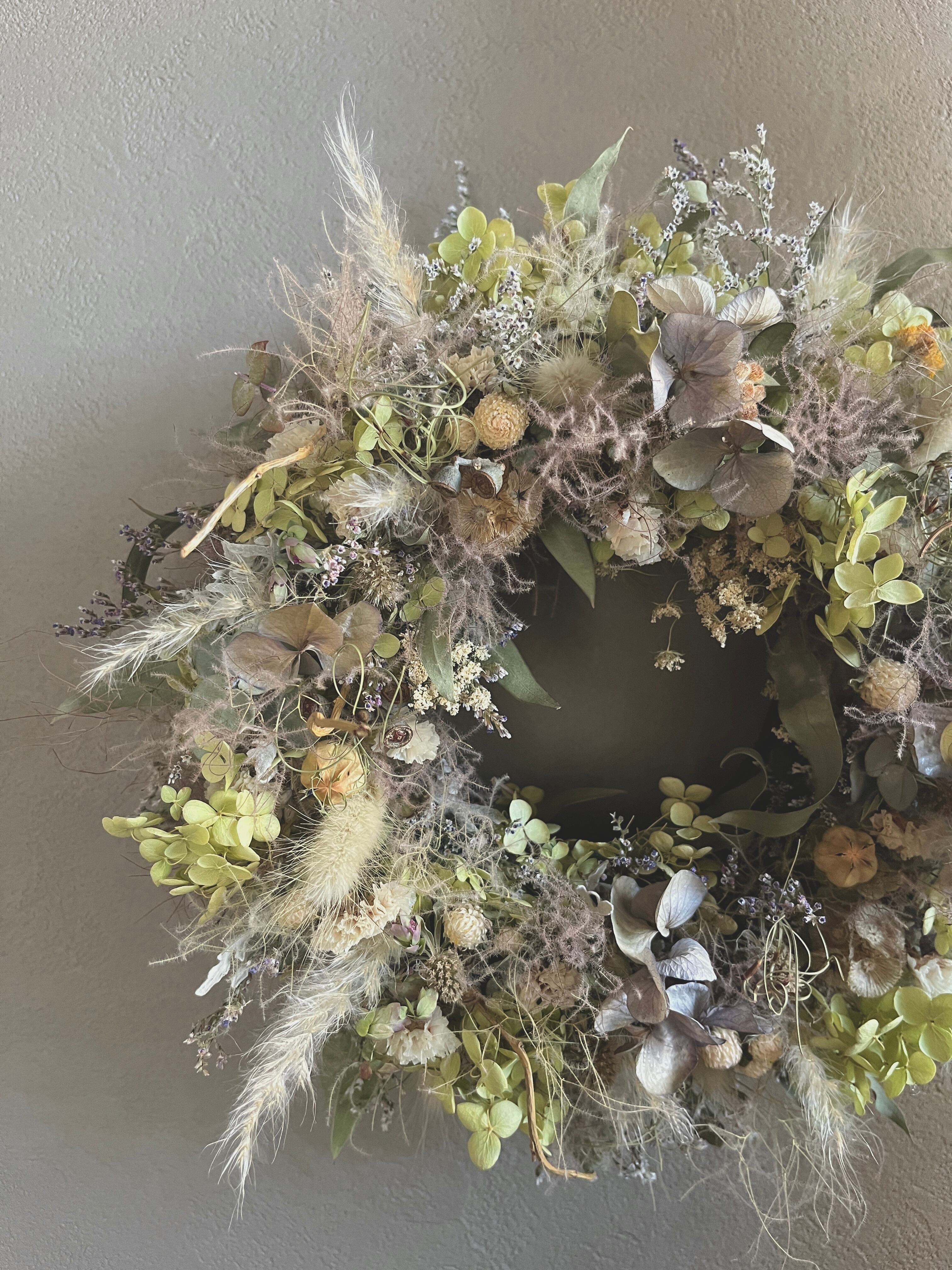 優しいグリーンのアナベルと深みのある秋色紫陽花を合わせた、季節感溢れるリースです。