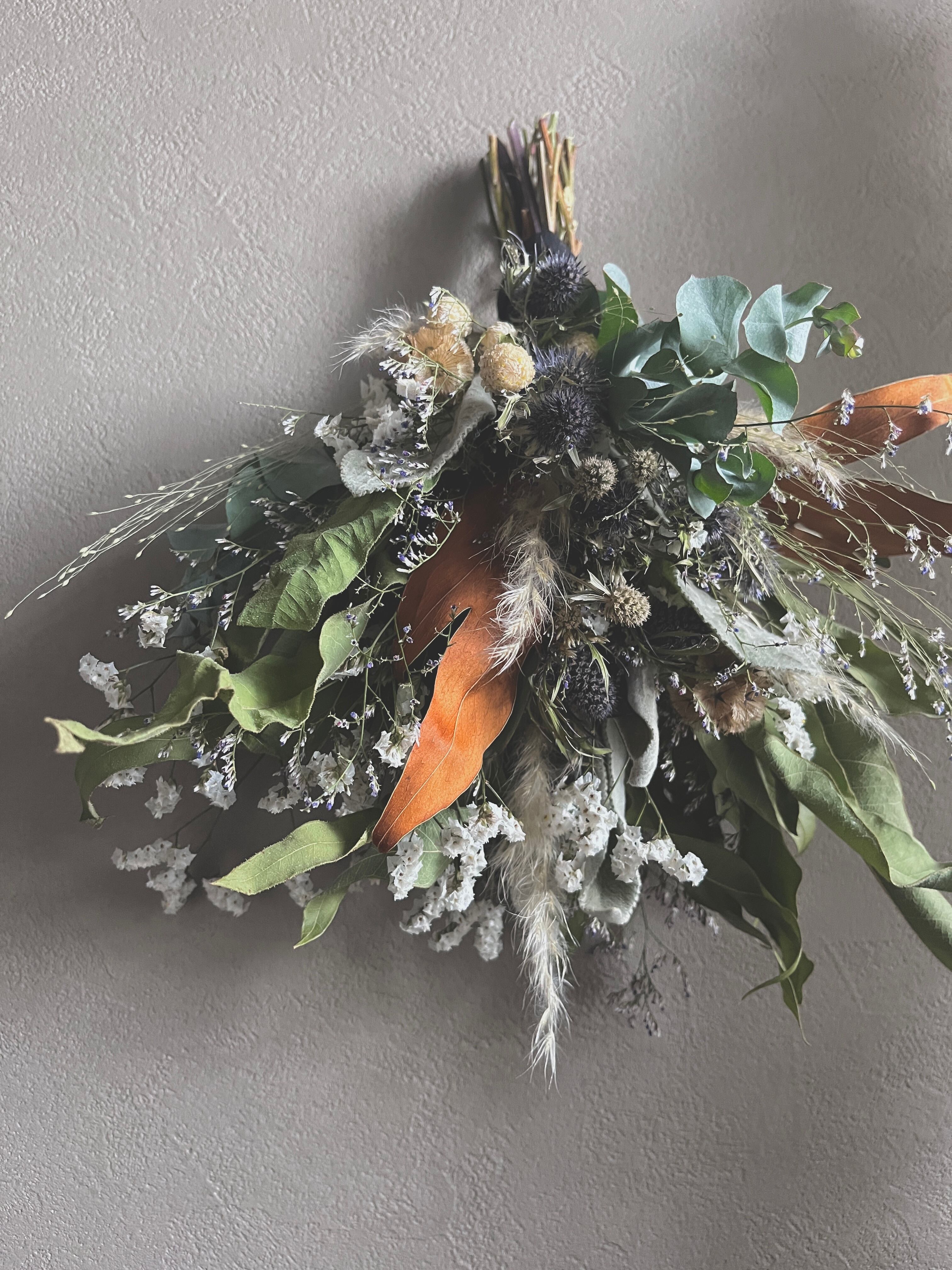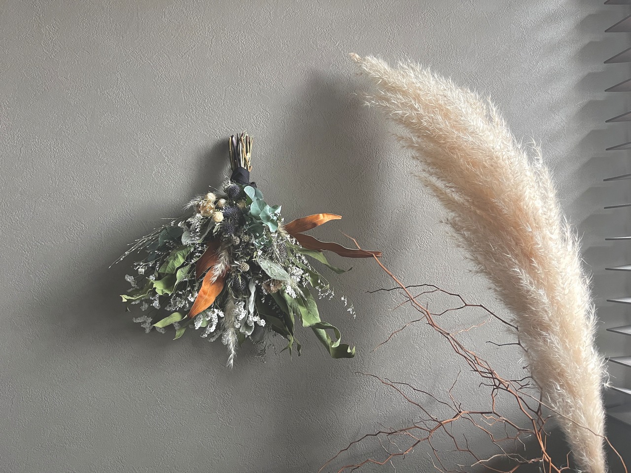 エリンジウムと、パンパスグラス、グレビリアゴールドなど暖かみある秋色の草花を合わせました。