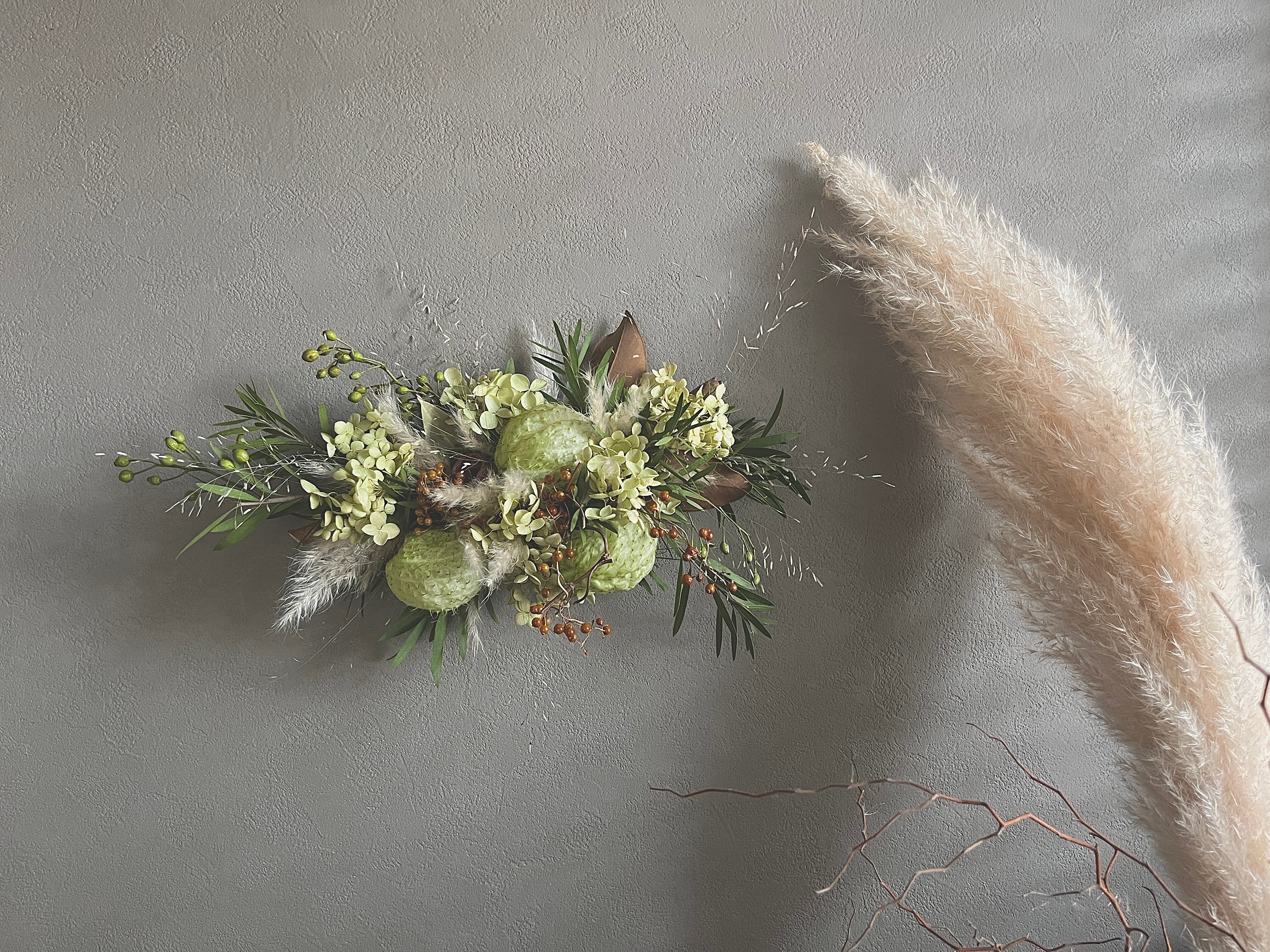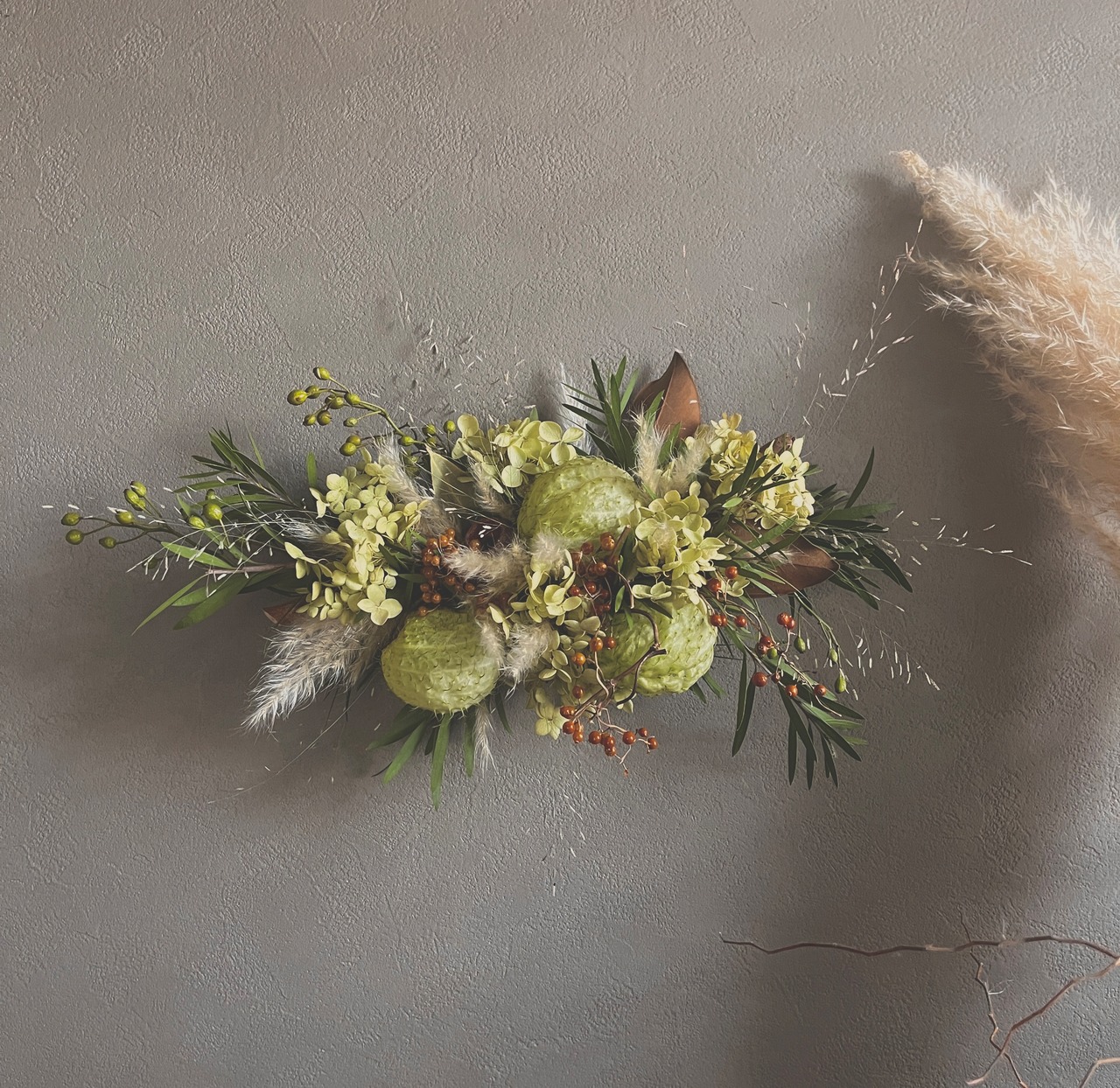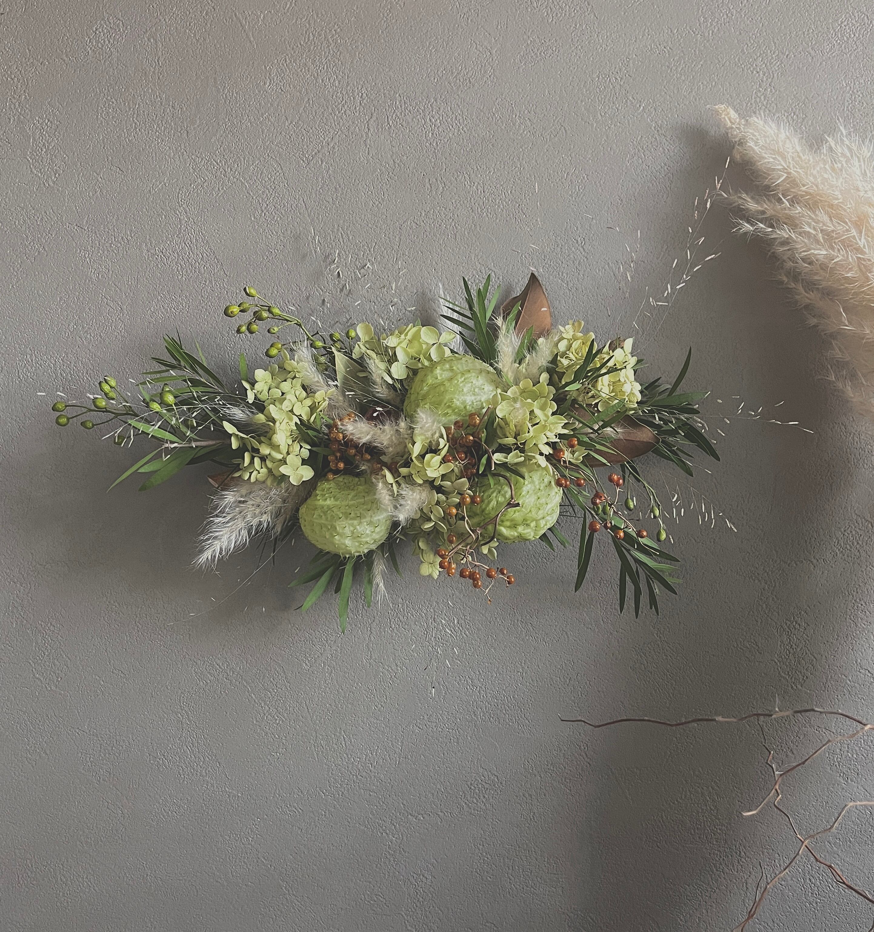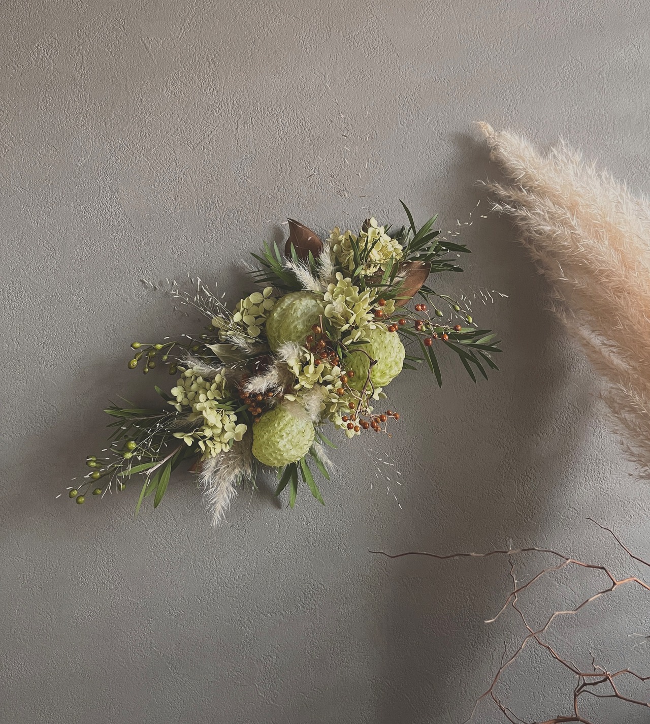 アナベルのグリーンと暖かみのある秋色の草花を合わせた、心安らぐ秋のスワッグです。