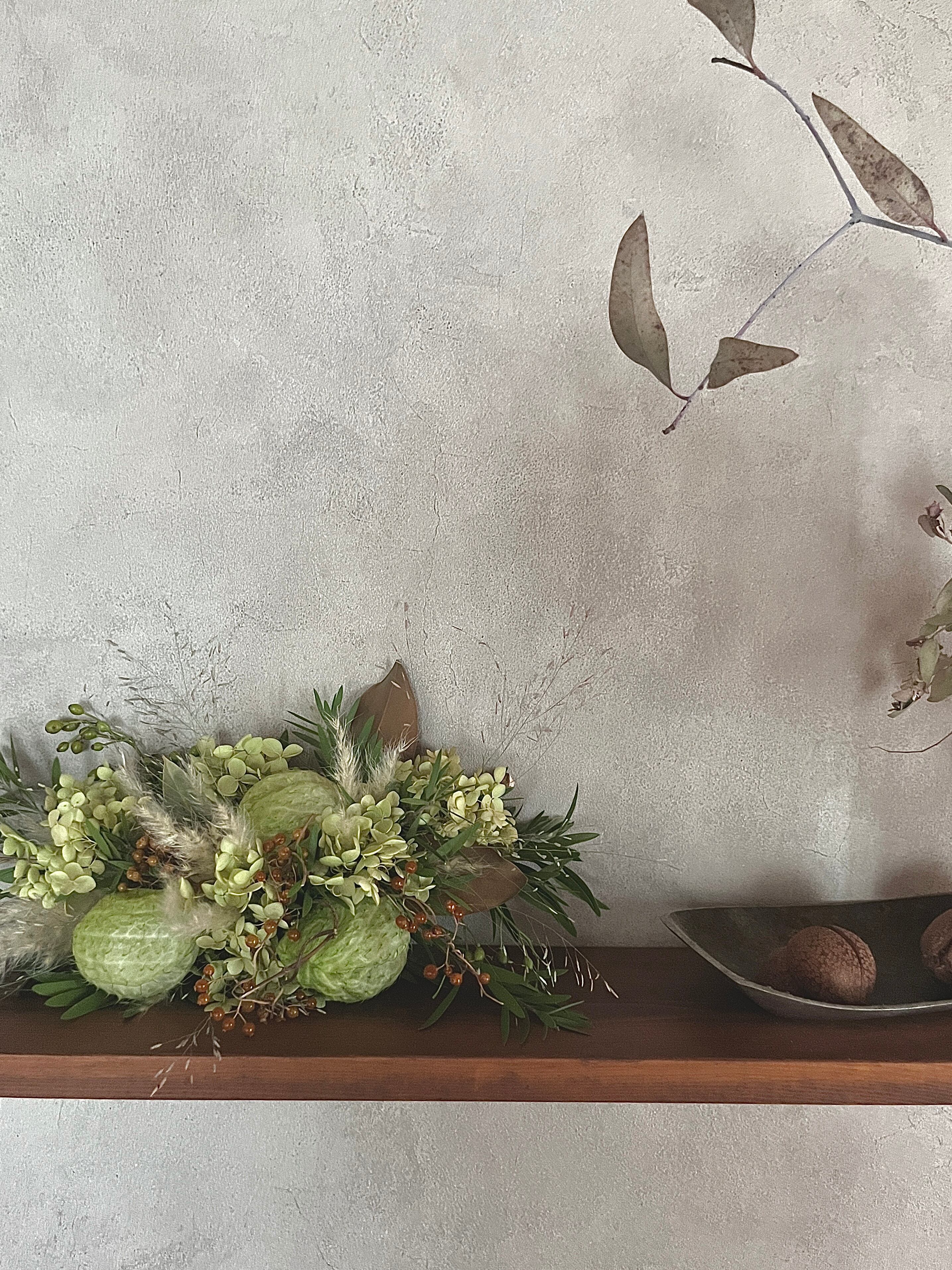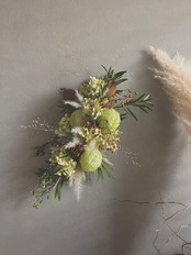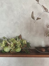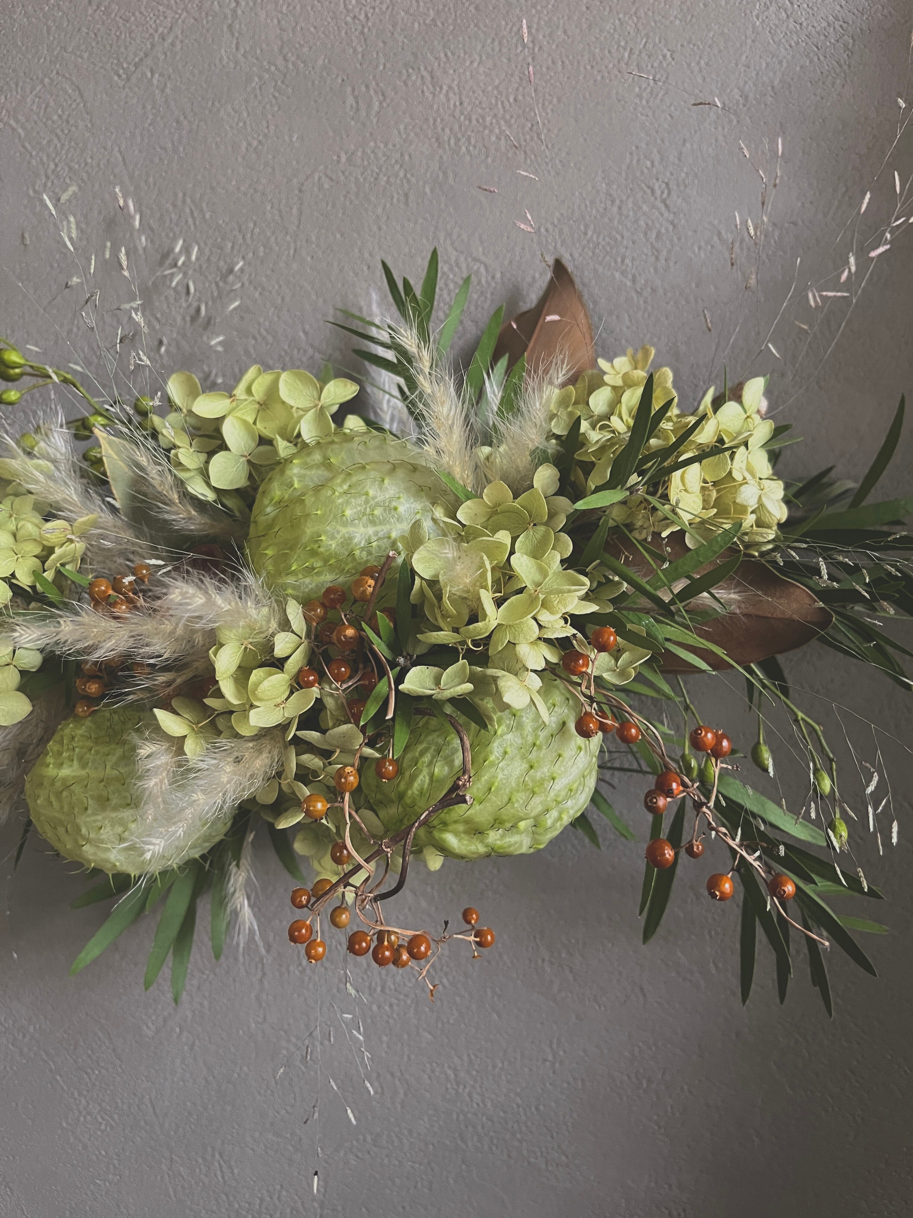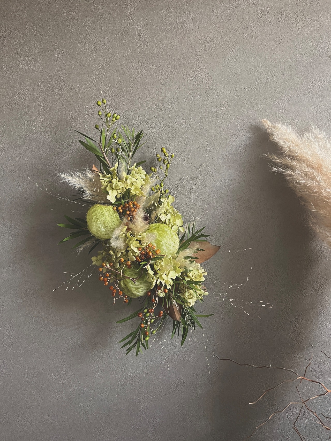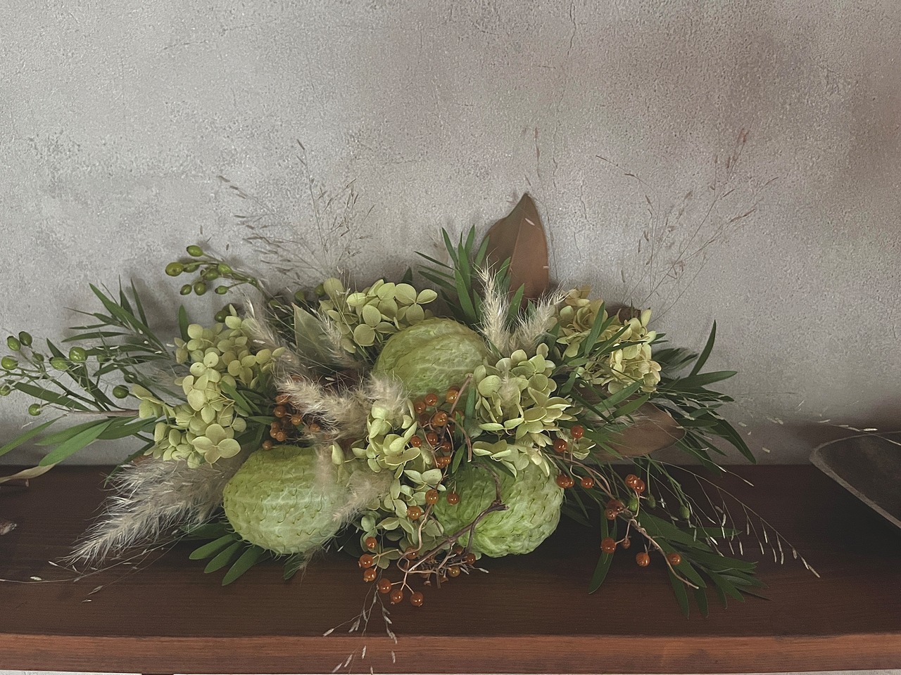 アナベルのグリーンと暖かみのある秋色の草花を合わせた、心安らぐ秋のスワッグです。