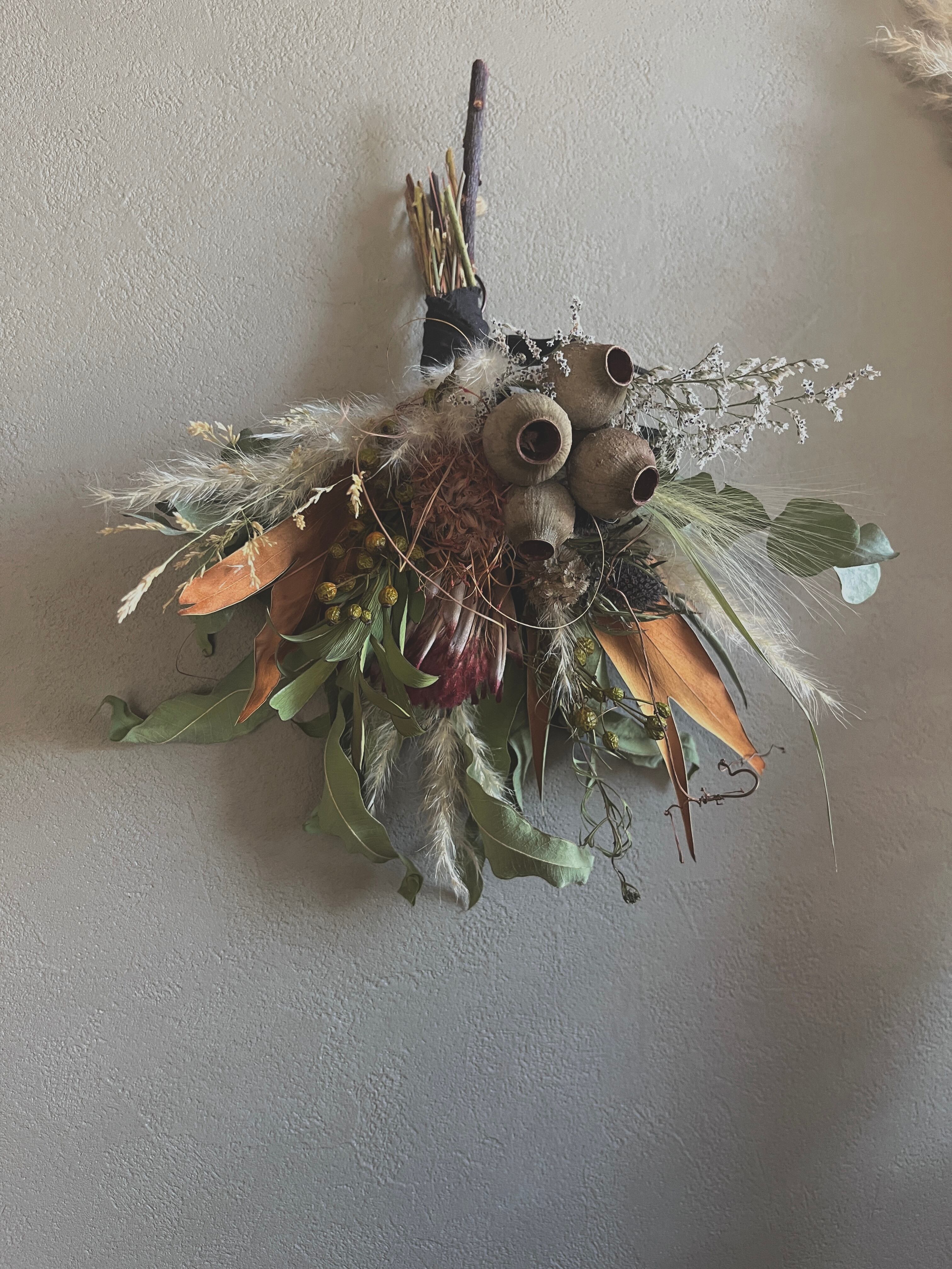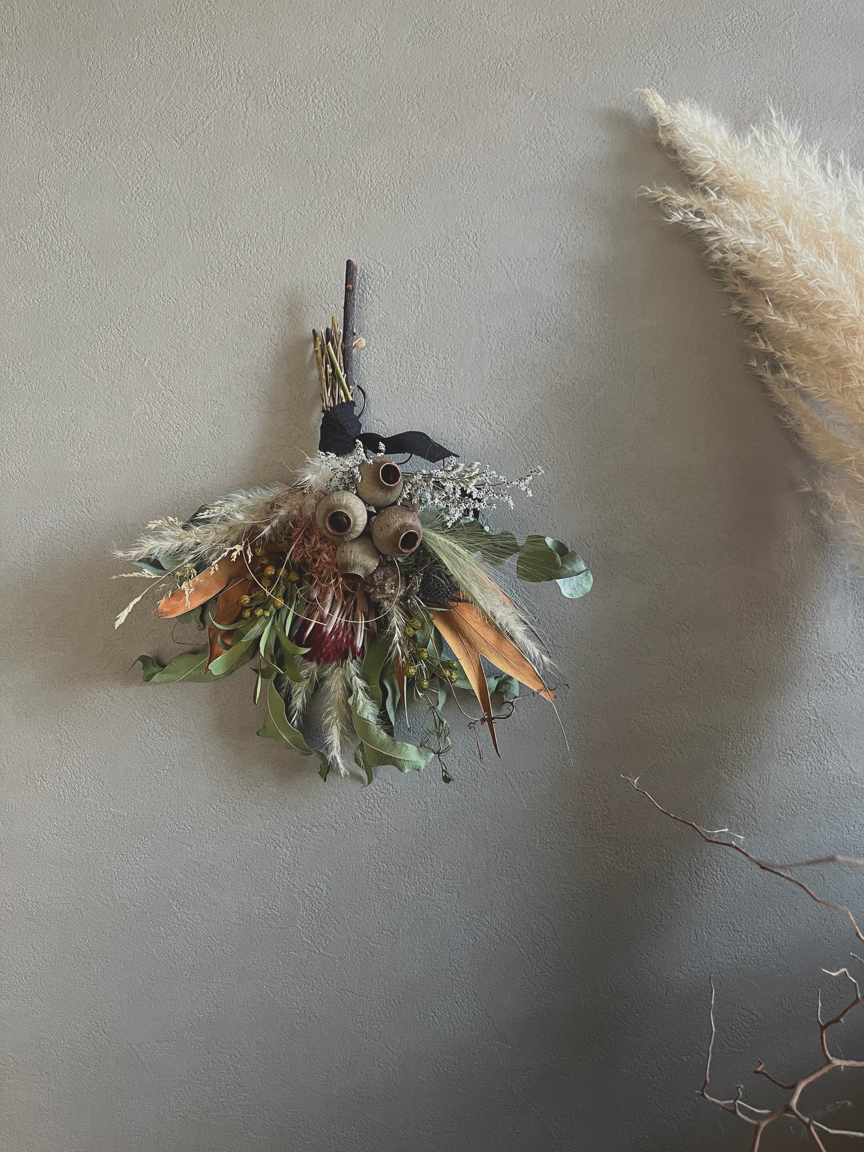 ユーカリ、ピンクッション、ベルガムナッツなど季節を感じる秋色スワッグです。ナチュラルな雰囲気でお部屋に彩りを。