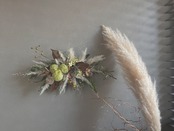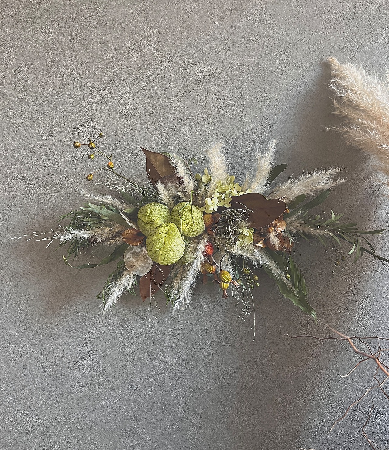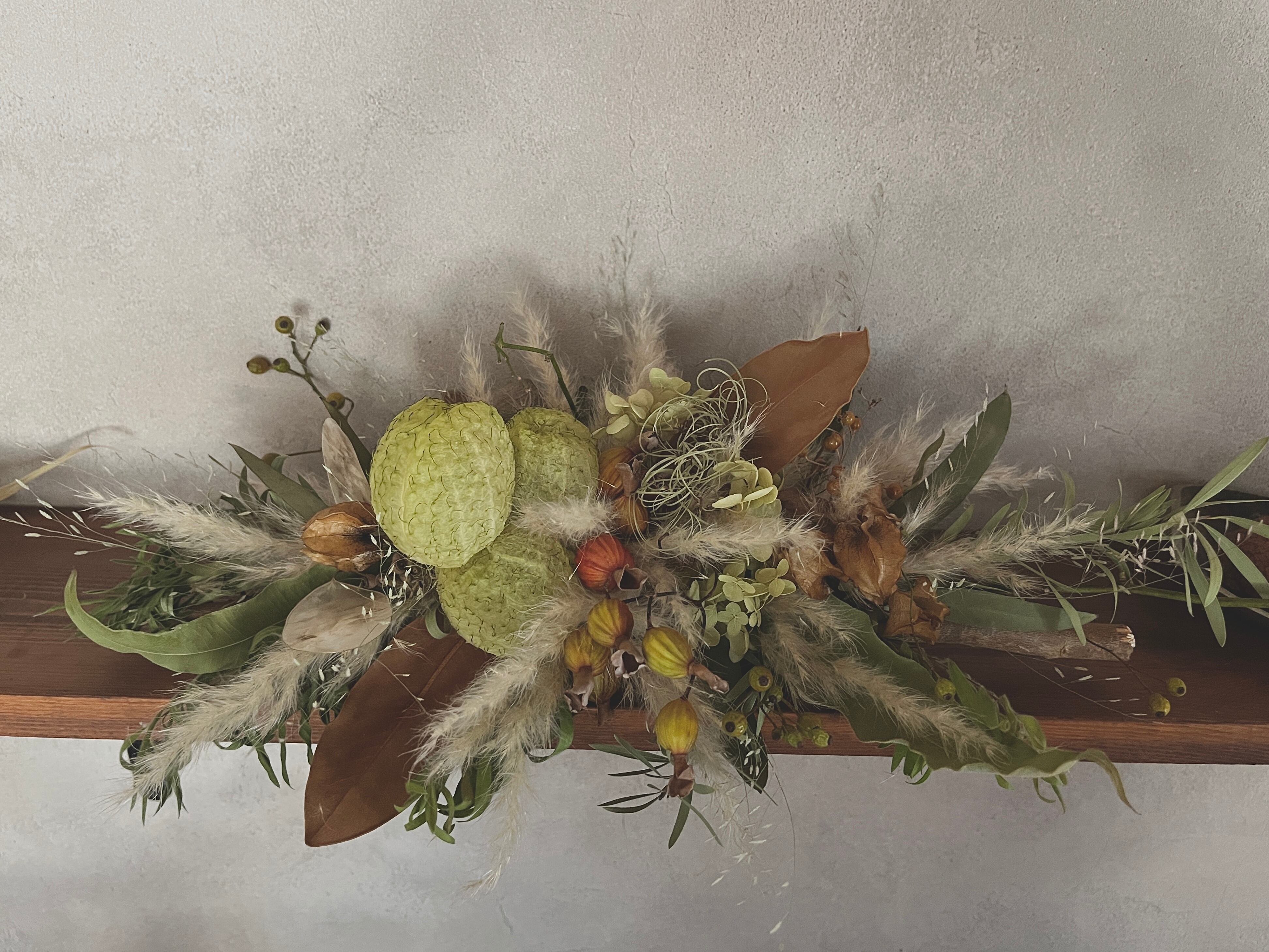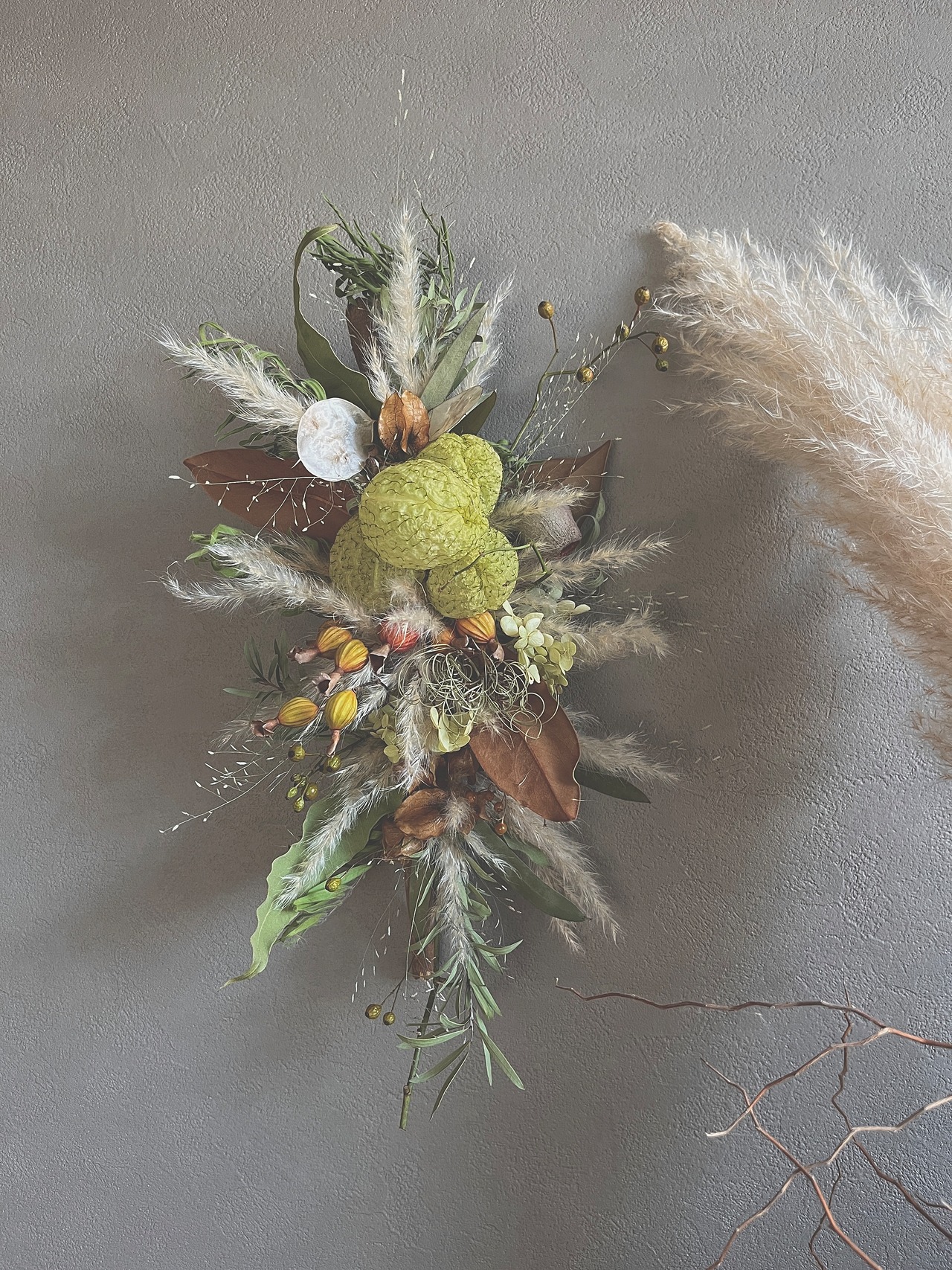 アナベルのグリーンと秋のぬくもりを感じる野バラの実、パンパスグラス、マグノリア、金峰樹、ルナニアなど季節の草花を合わせました。