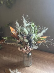 パンパスグラス、ラグラス、グレビレアゴールドなど秋色を沢山束ねました。