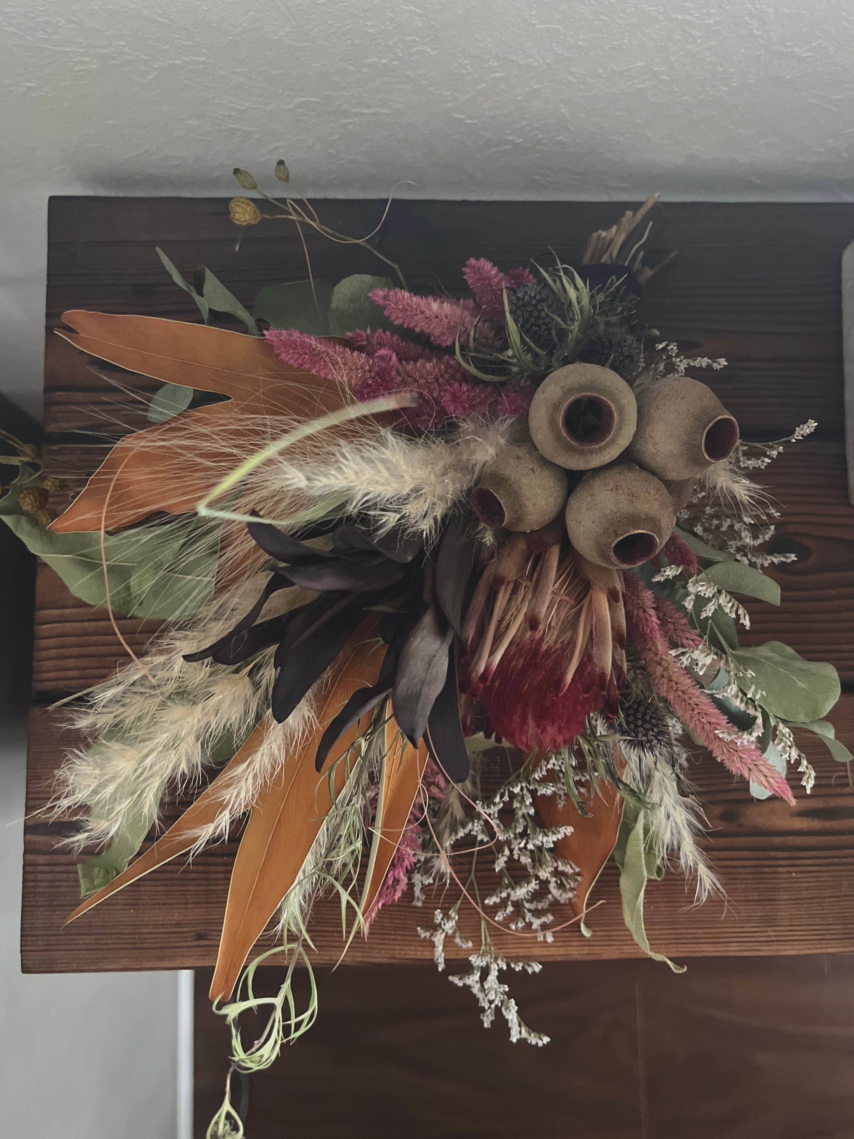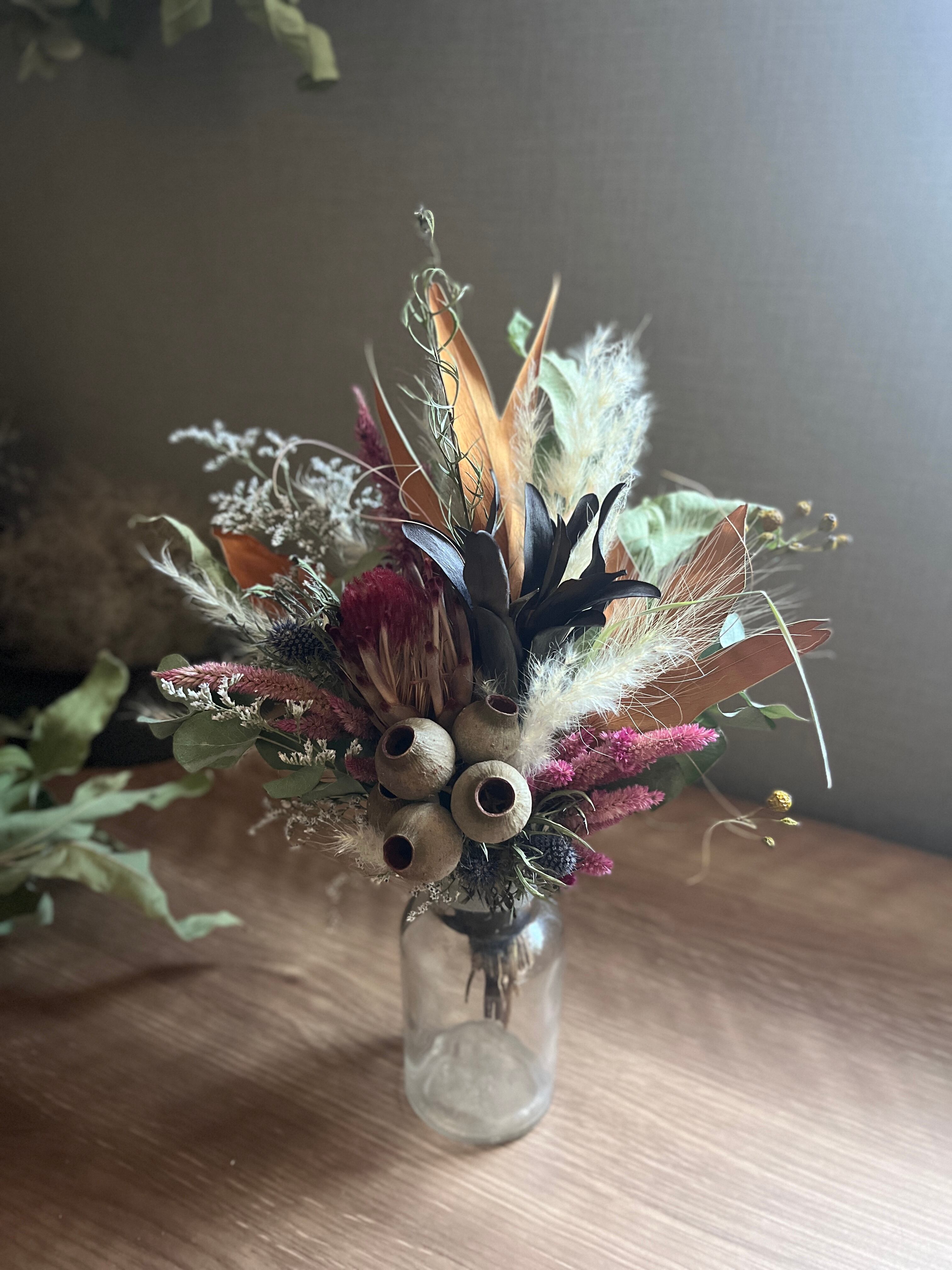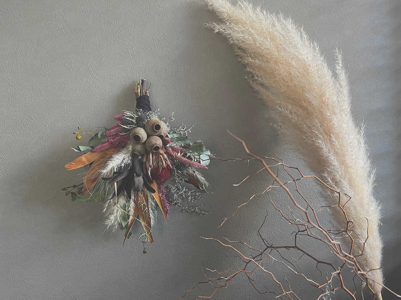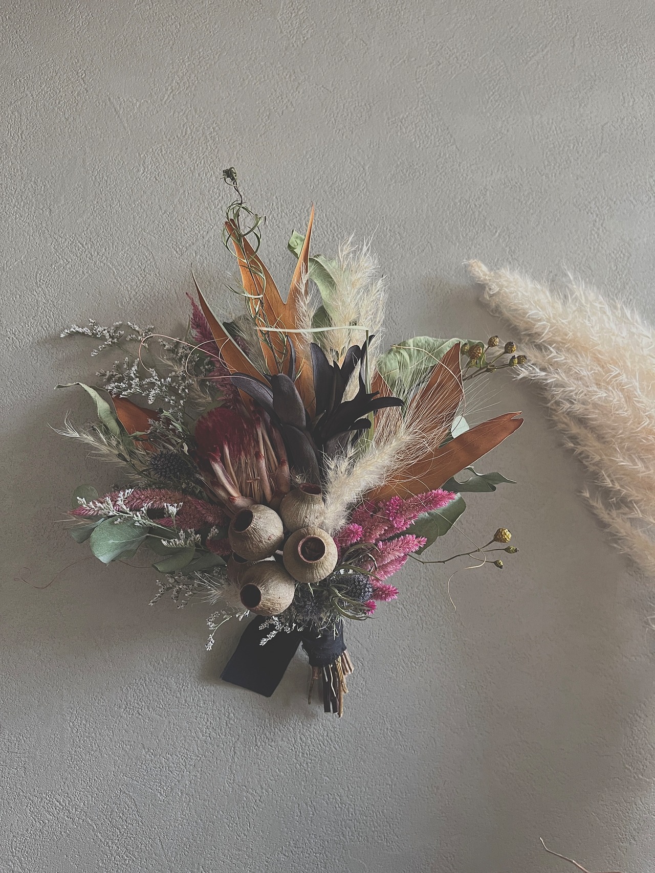 鮮やかなプロテアに柔らかいパンパスグラスを合わせました。深みのあるケイトウ、グレビレアゴールド、ベルガムナッツなどと共に秋のインテリアに。