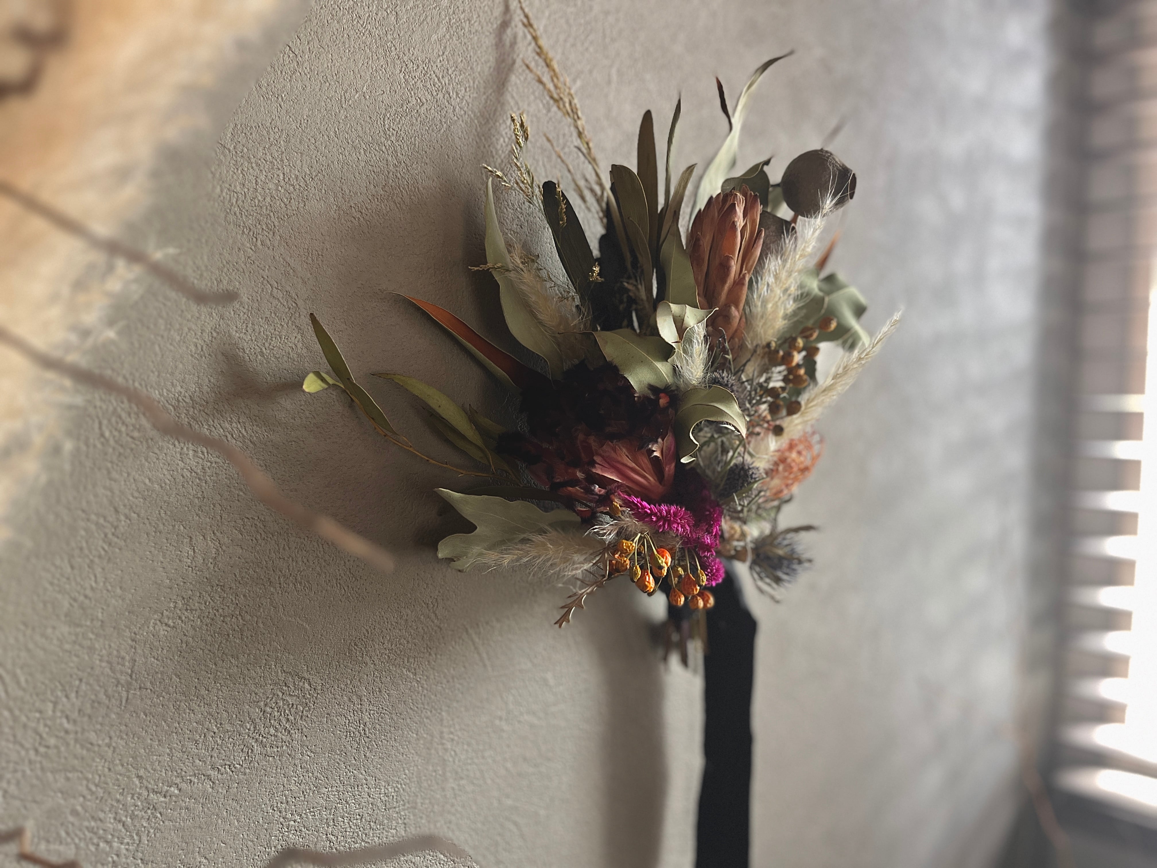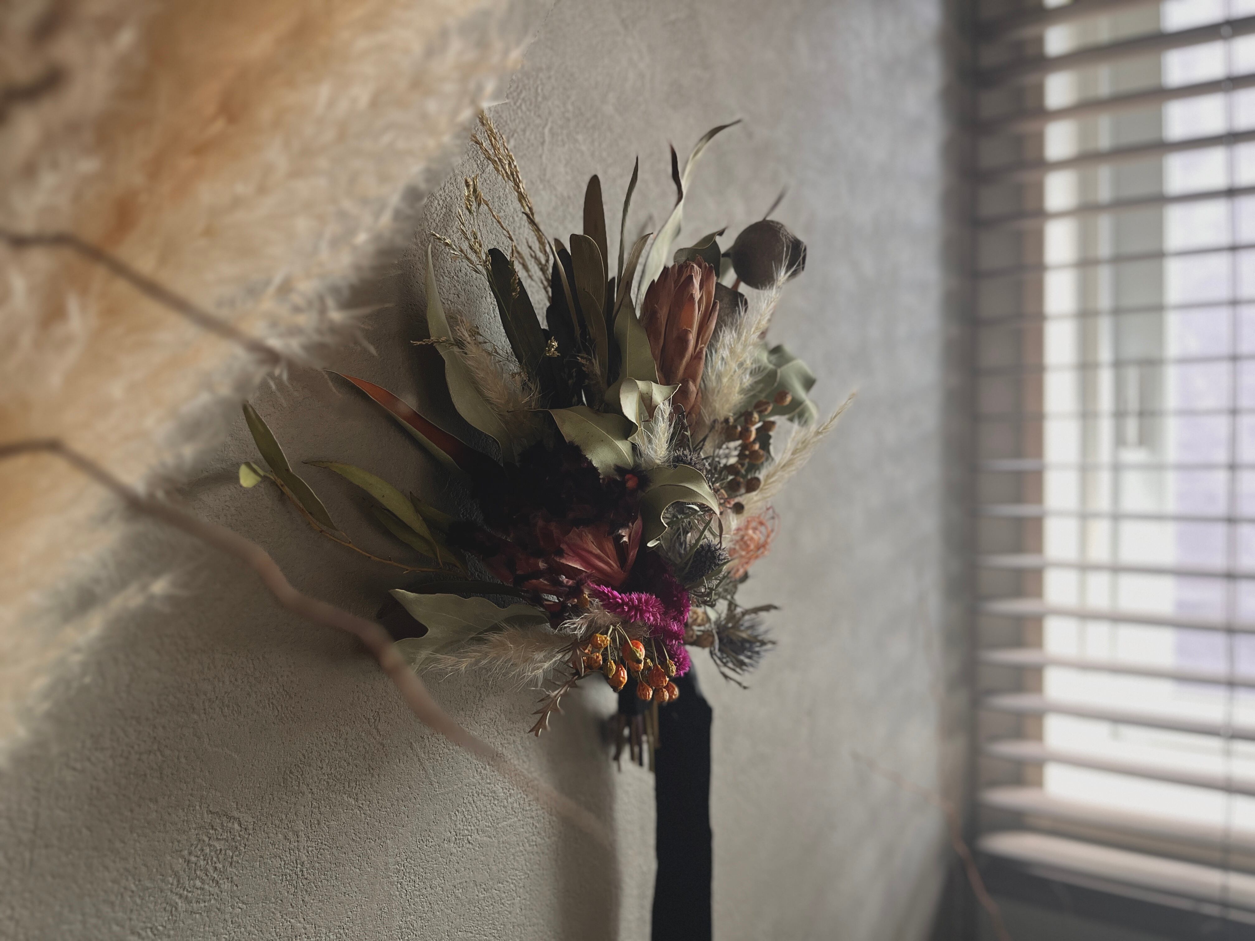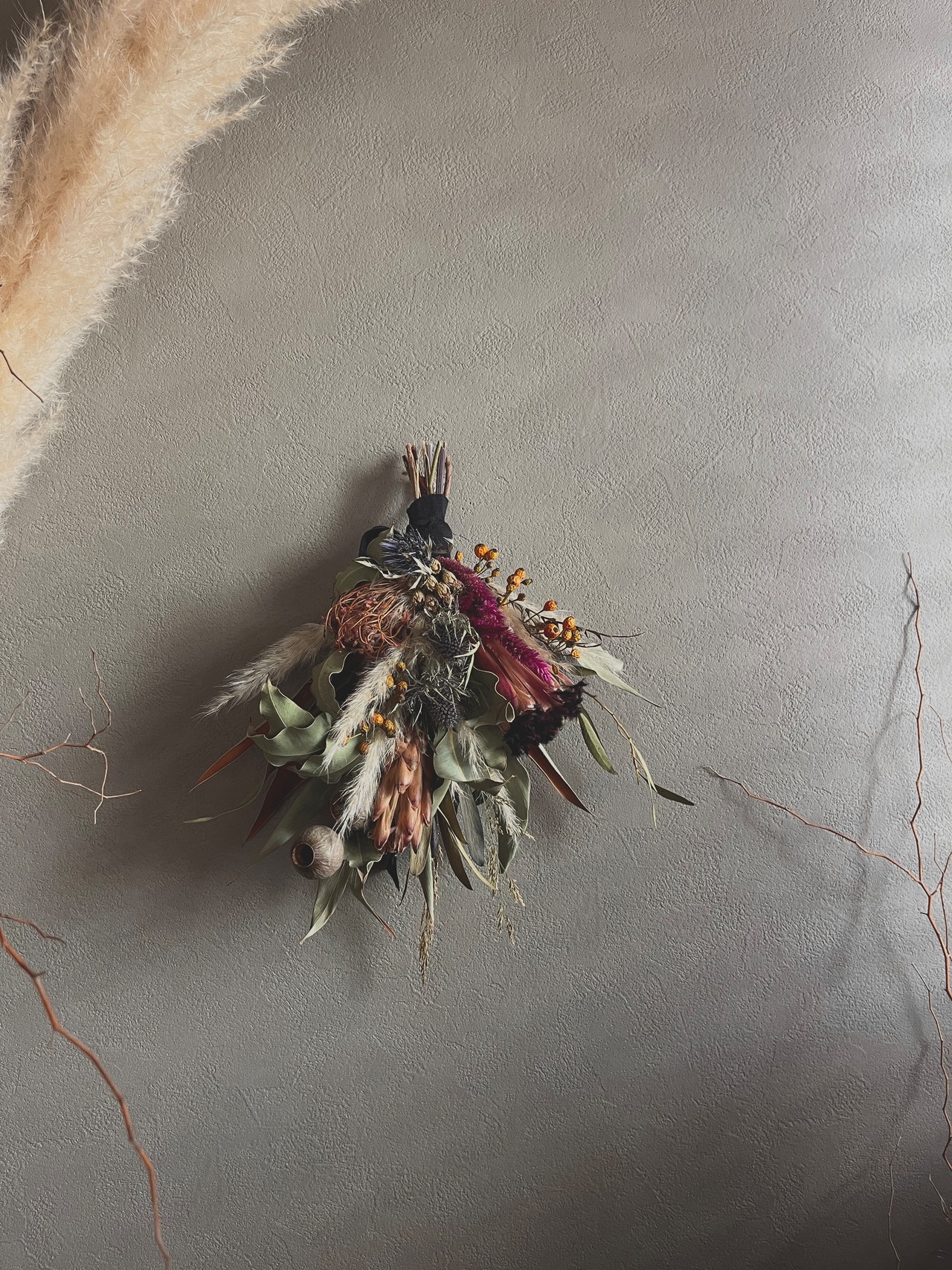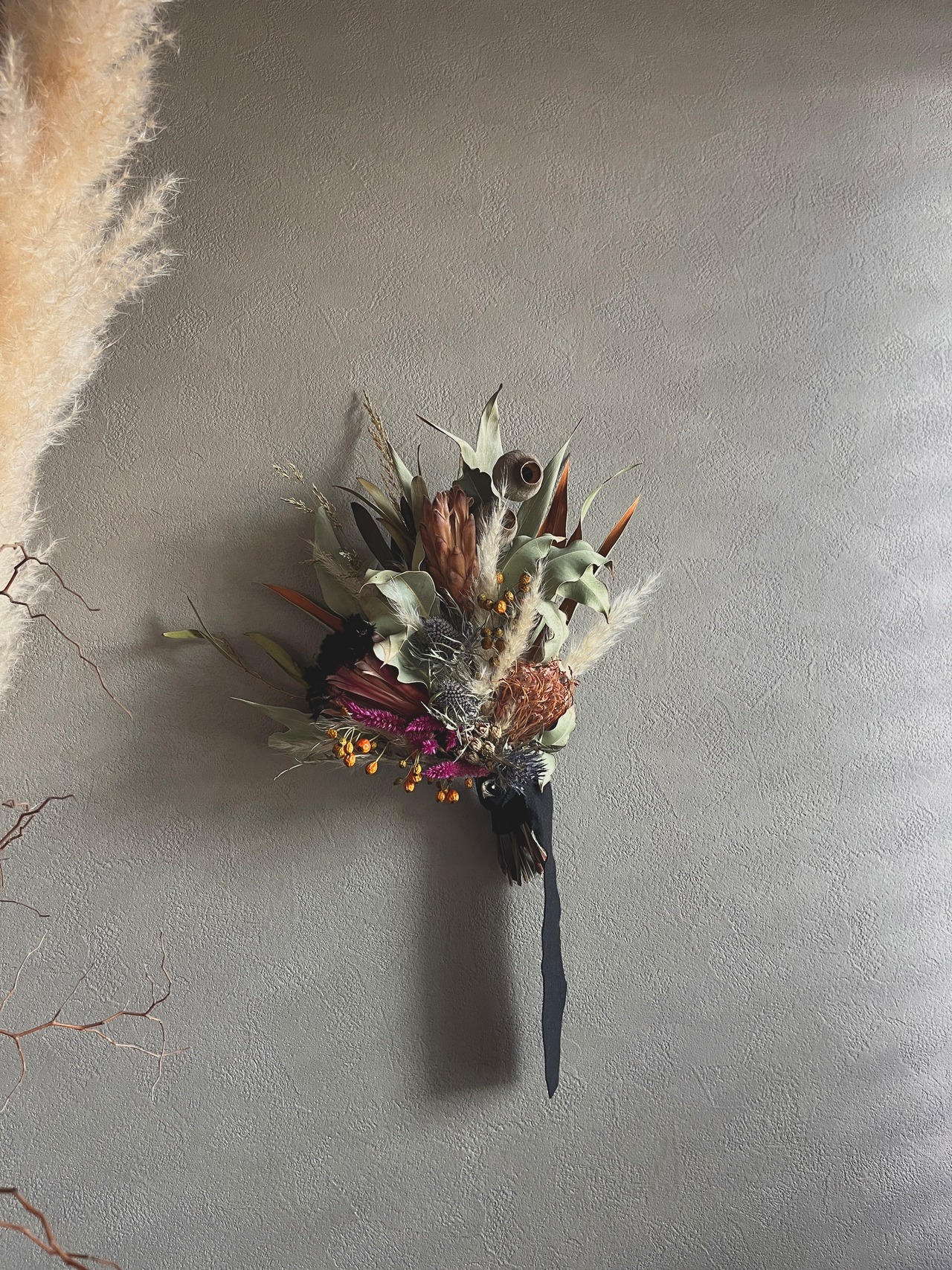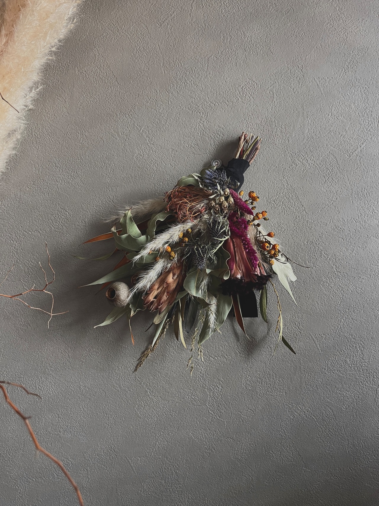深いお色味のケイトウやグレビレアゴールド、ベルガムナッツなどと共に、豊かな秋の雰囲気を。