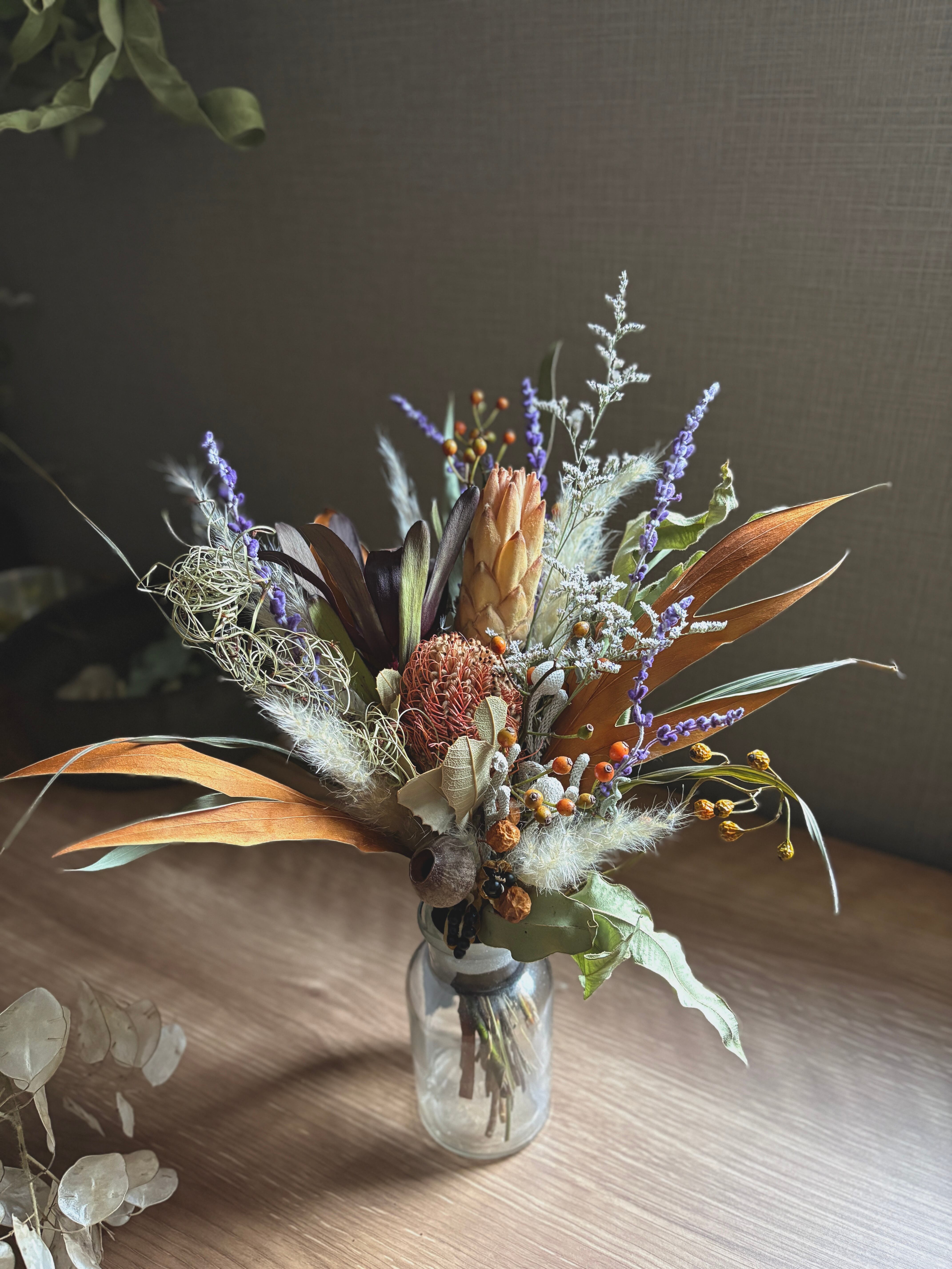 アメジストセージを差し色に。リューカデンドロン、リペンズ、グレビレアゴールドなどワイルドフラワーと共に束ねました。