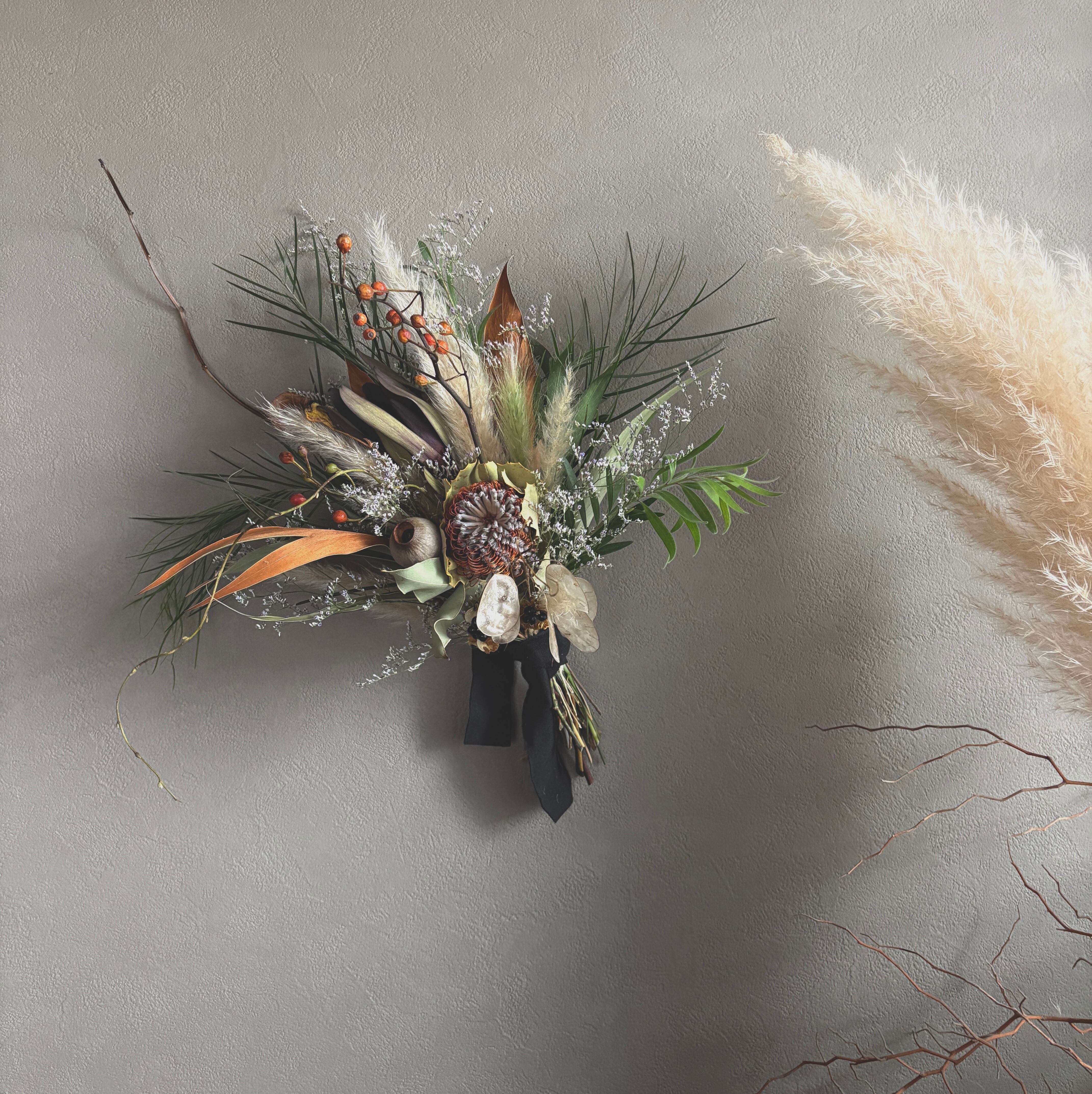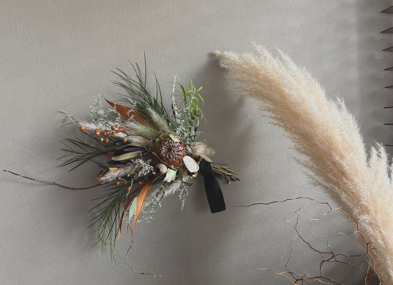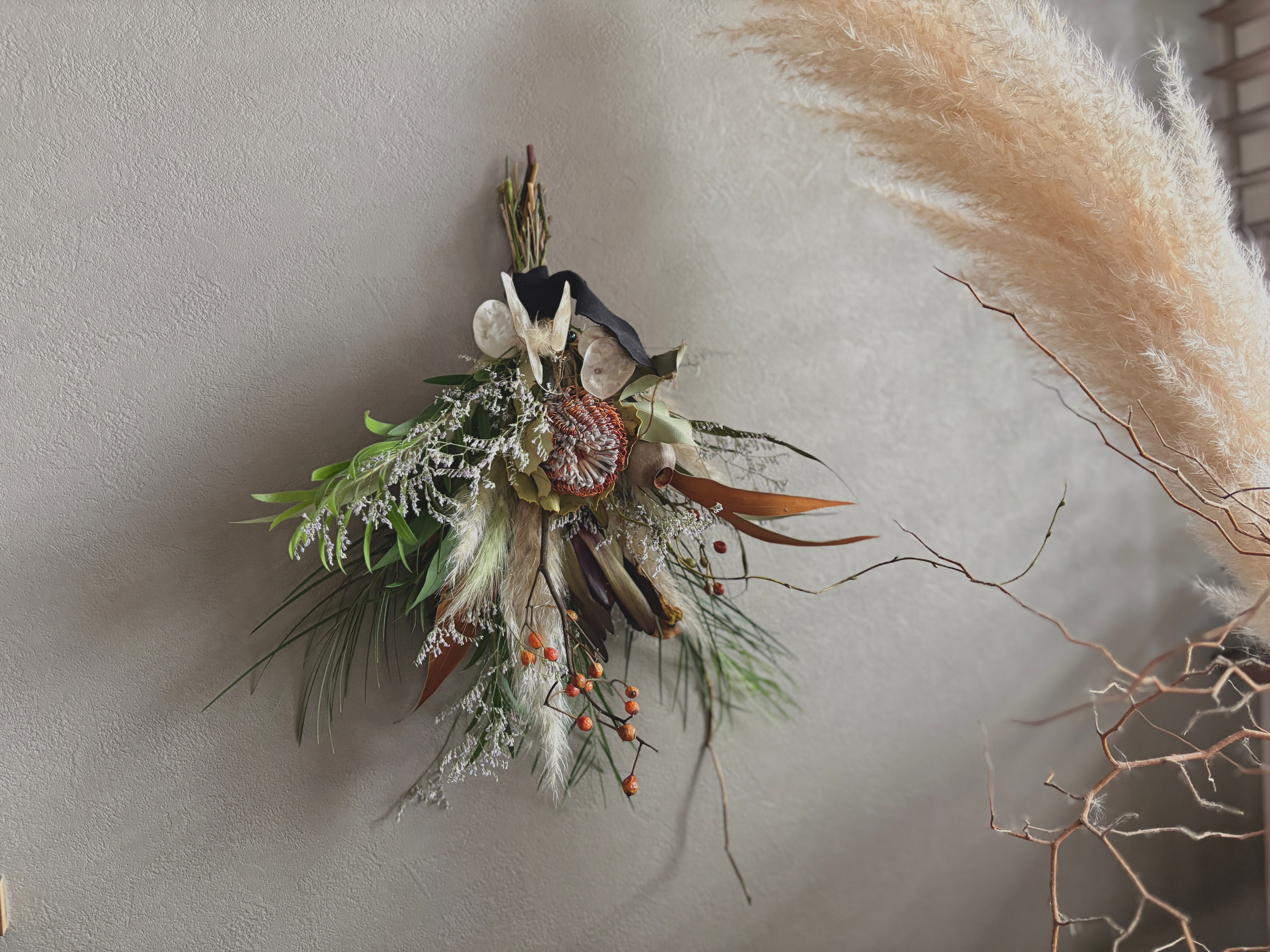 バンクシアと温もりのある柔らかなパンパスグラスを束ねました。ベルガムナッツやグレビレアゴールド、リューカデンドロン、季節の実などと合わせ暖かい秋のスワッグにしました。