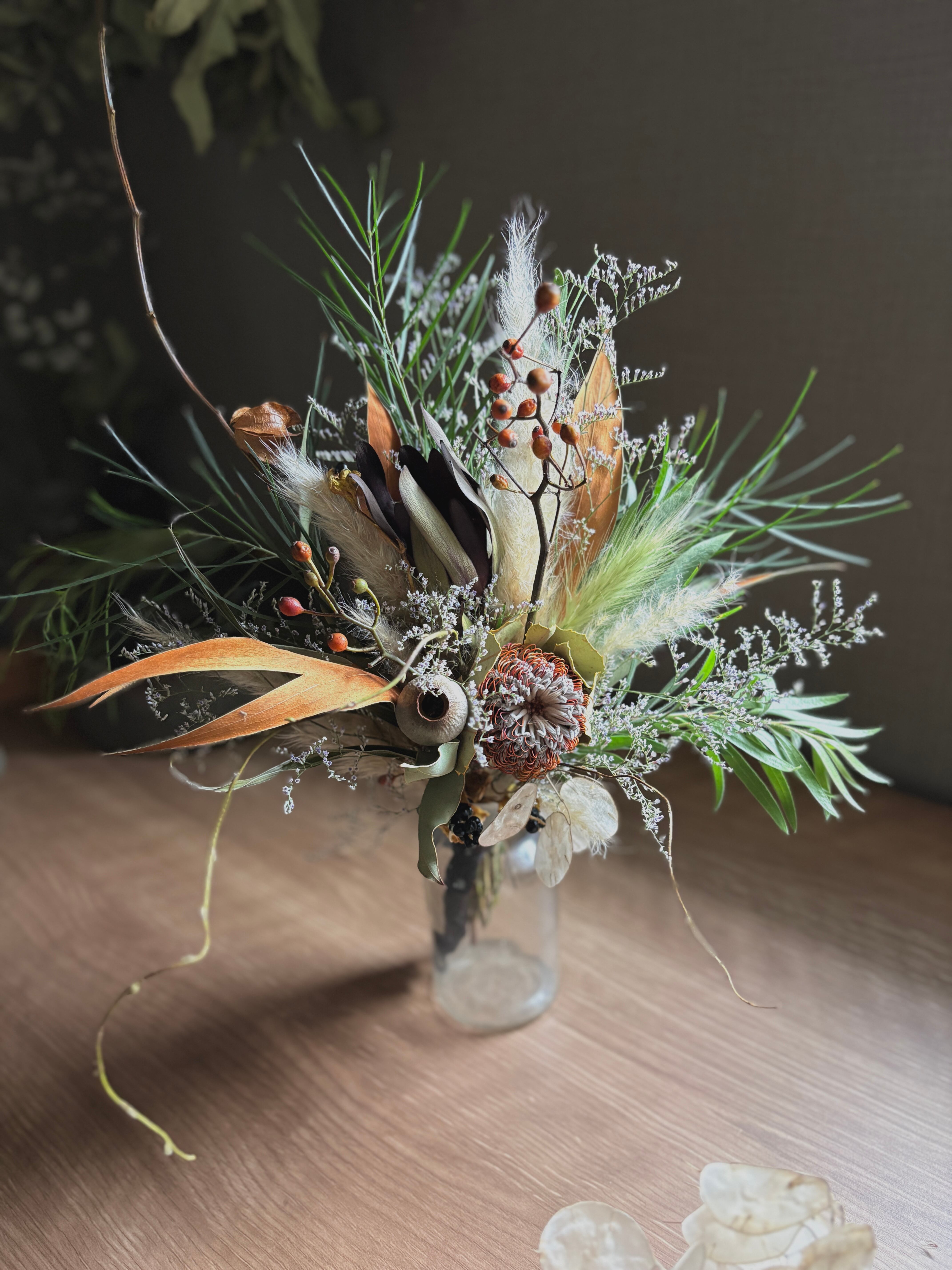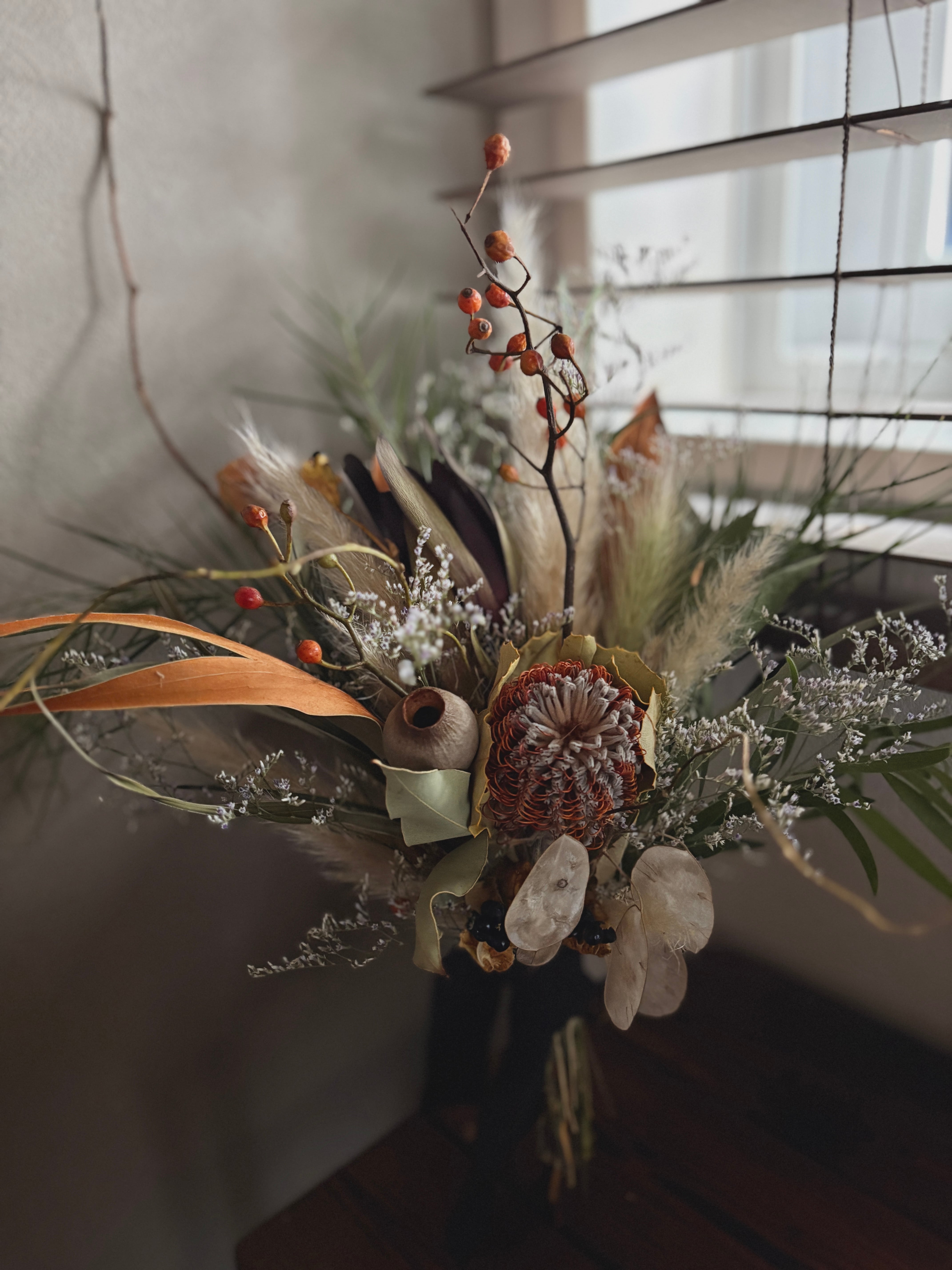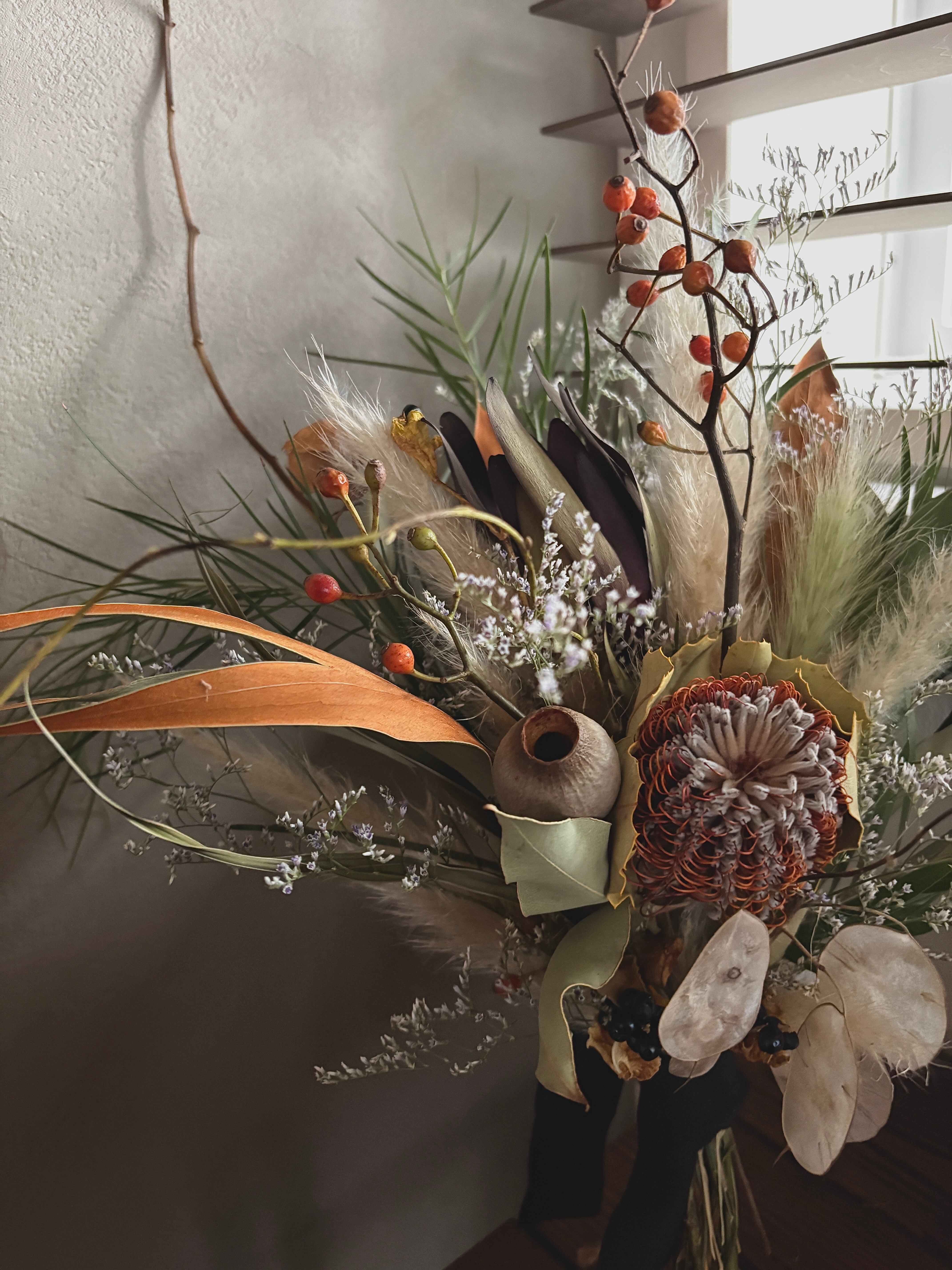 バンクシアと温もりのある柔らかなパンパスグラスを束ねました。ベルガムナッツやグレビレアゴールド、リューカデンドロン、季節の実などと合わせ暖かい秋のスワッグにしました。