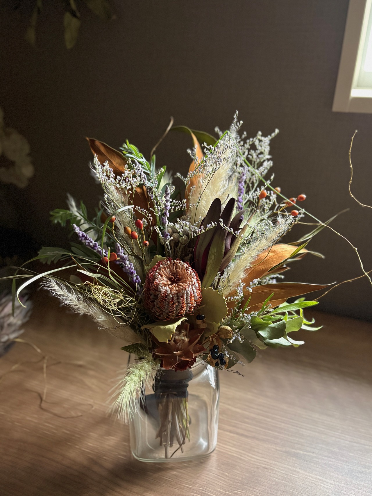 自然素材のため、日々色味が変わっていく特性があります。特にドライフラワーならではの色合いの深まりを、ぜひお楽しみください。