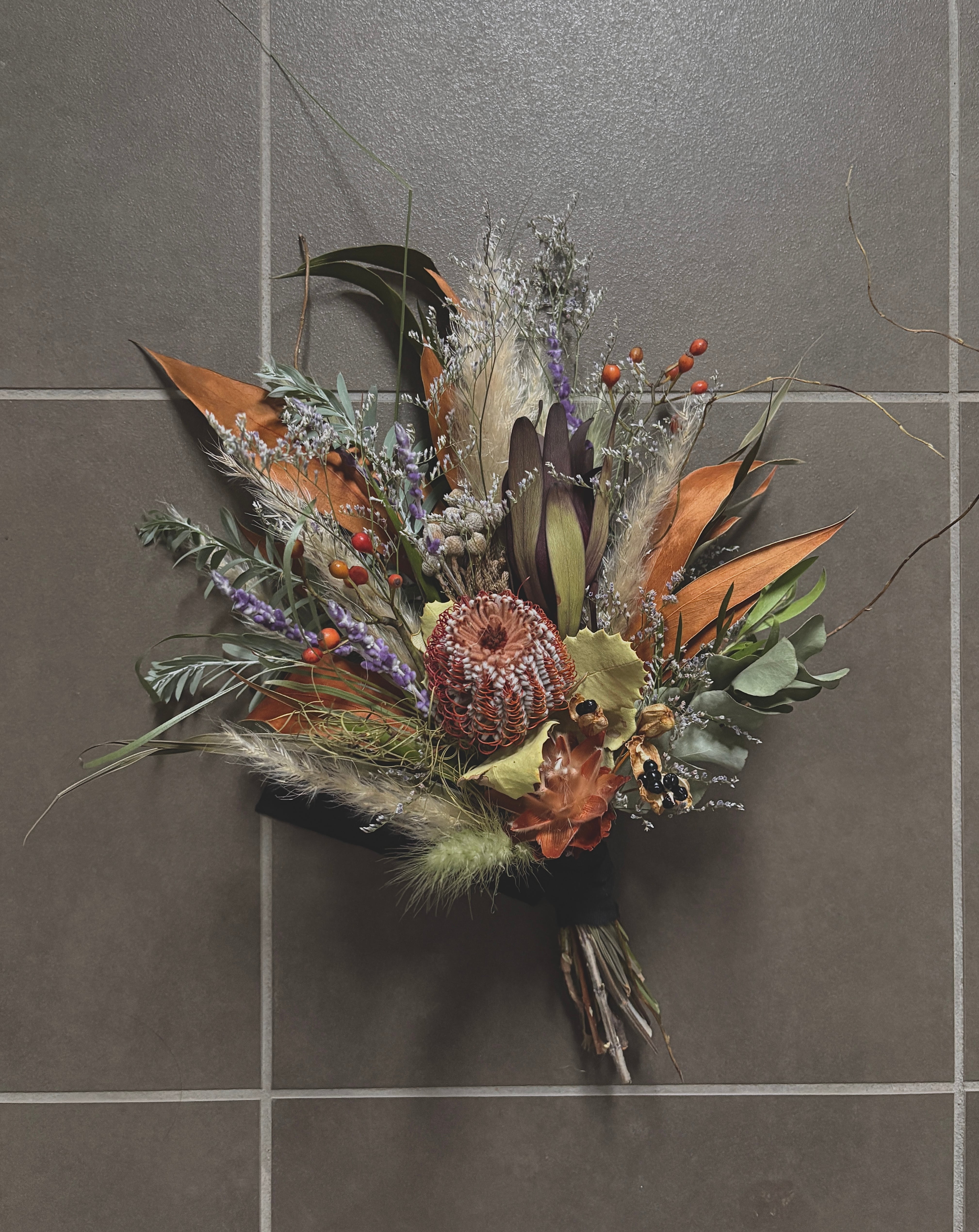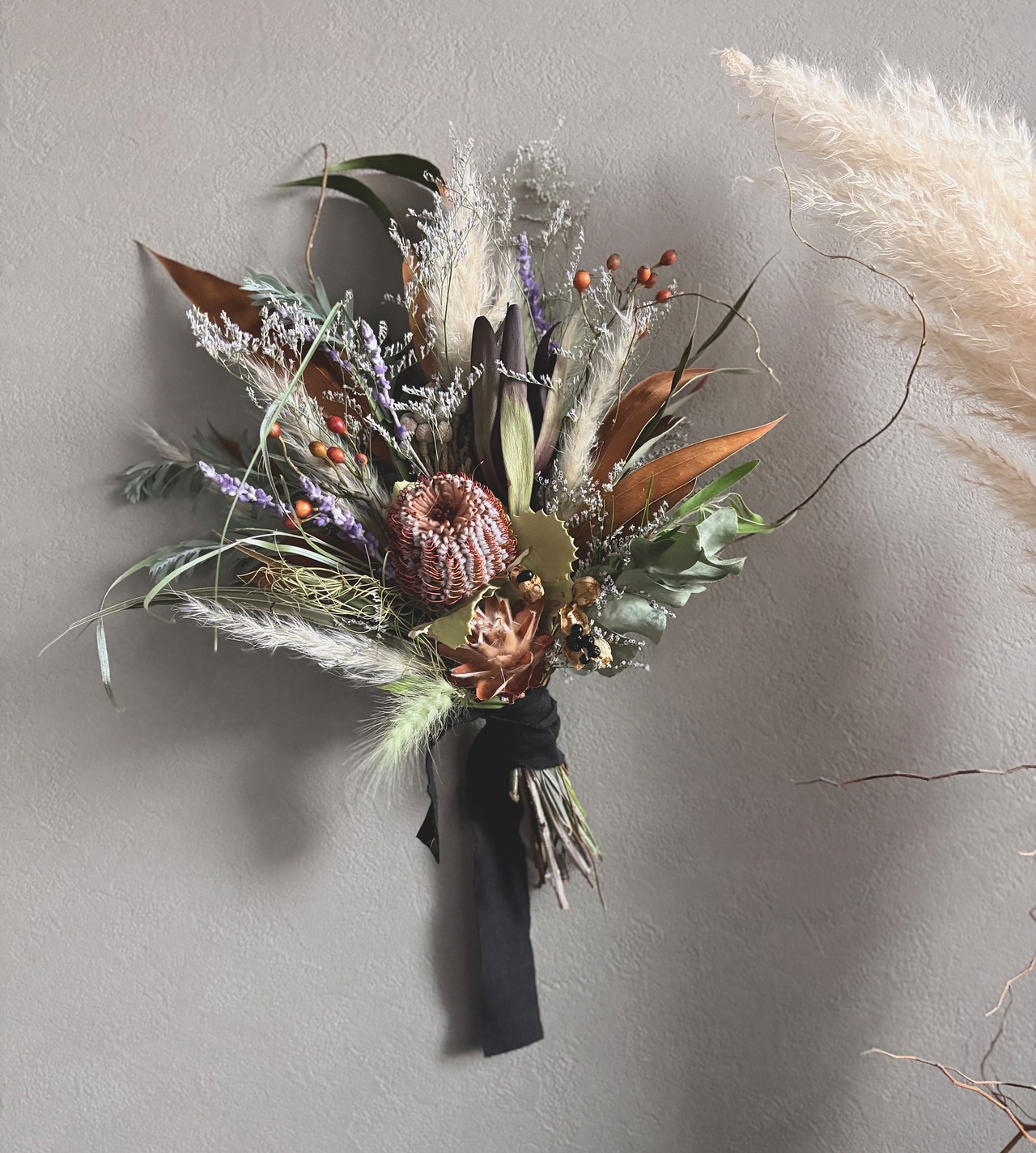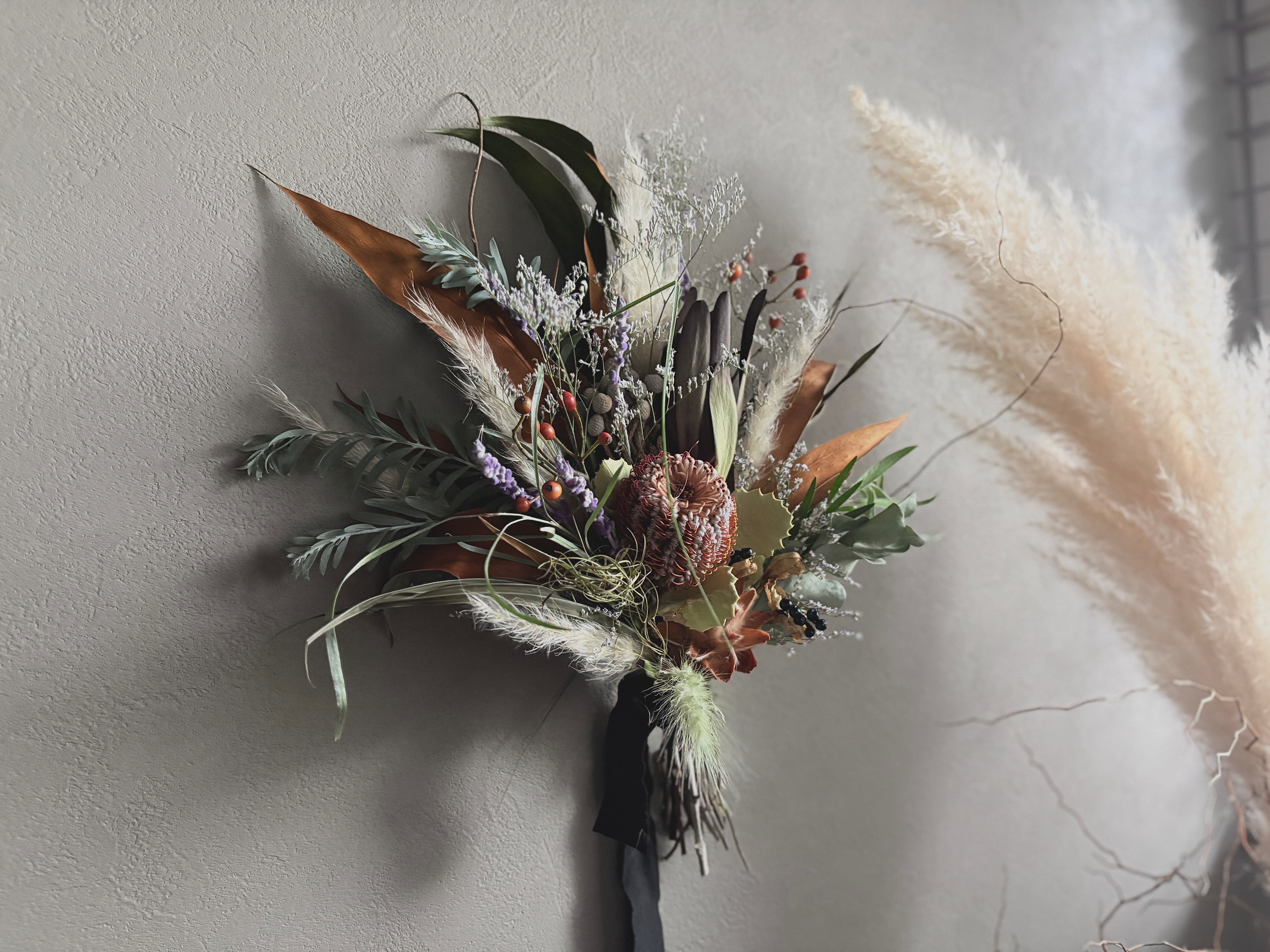 バンクシアの独特なフォルムと、ふんわりとしたパンパスグラスを合わせました。