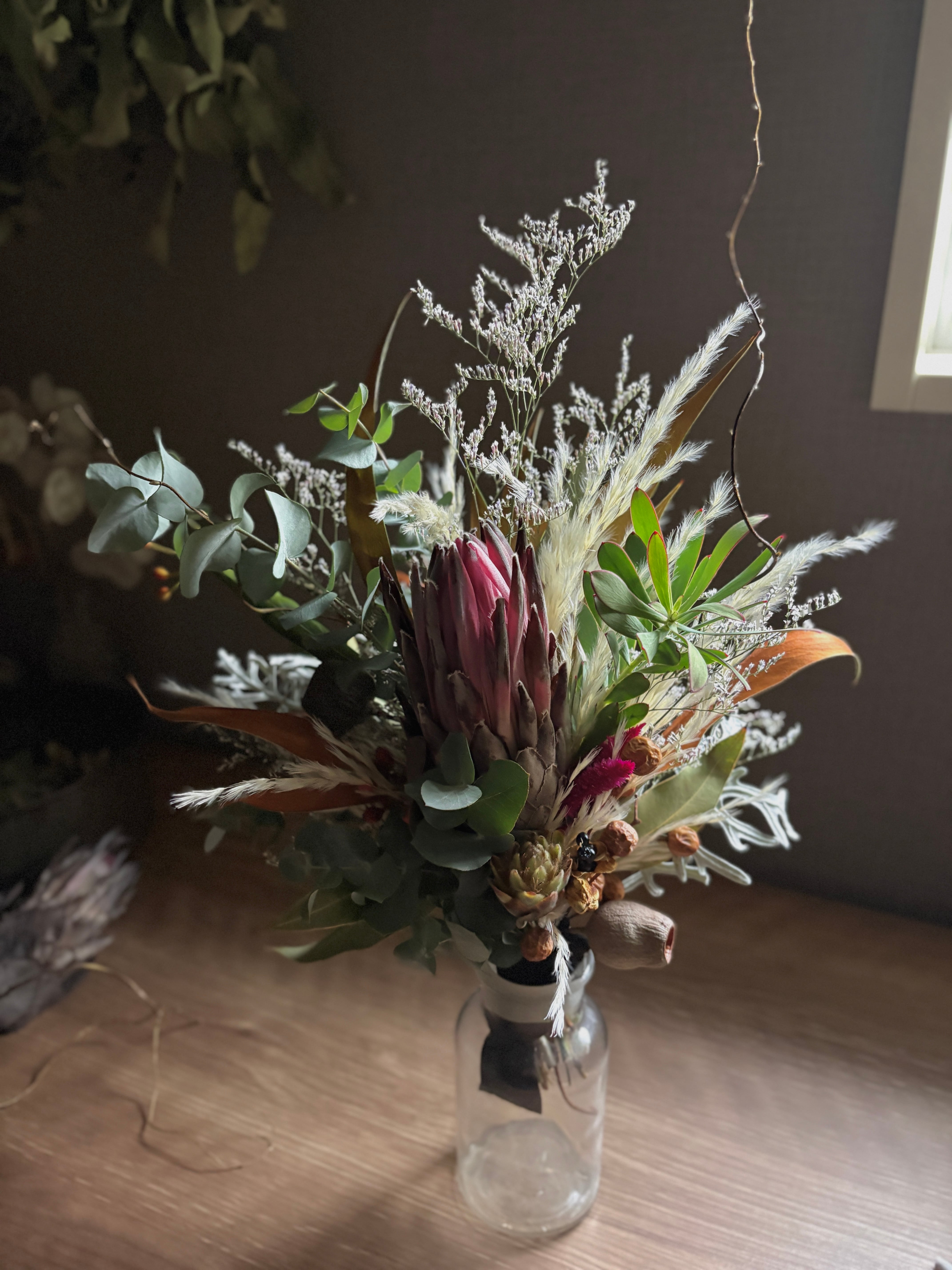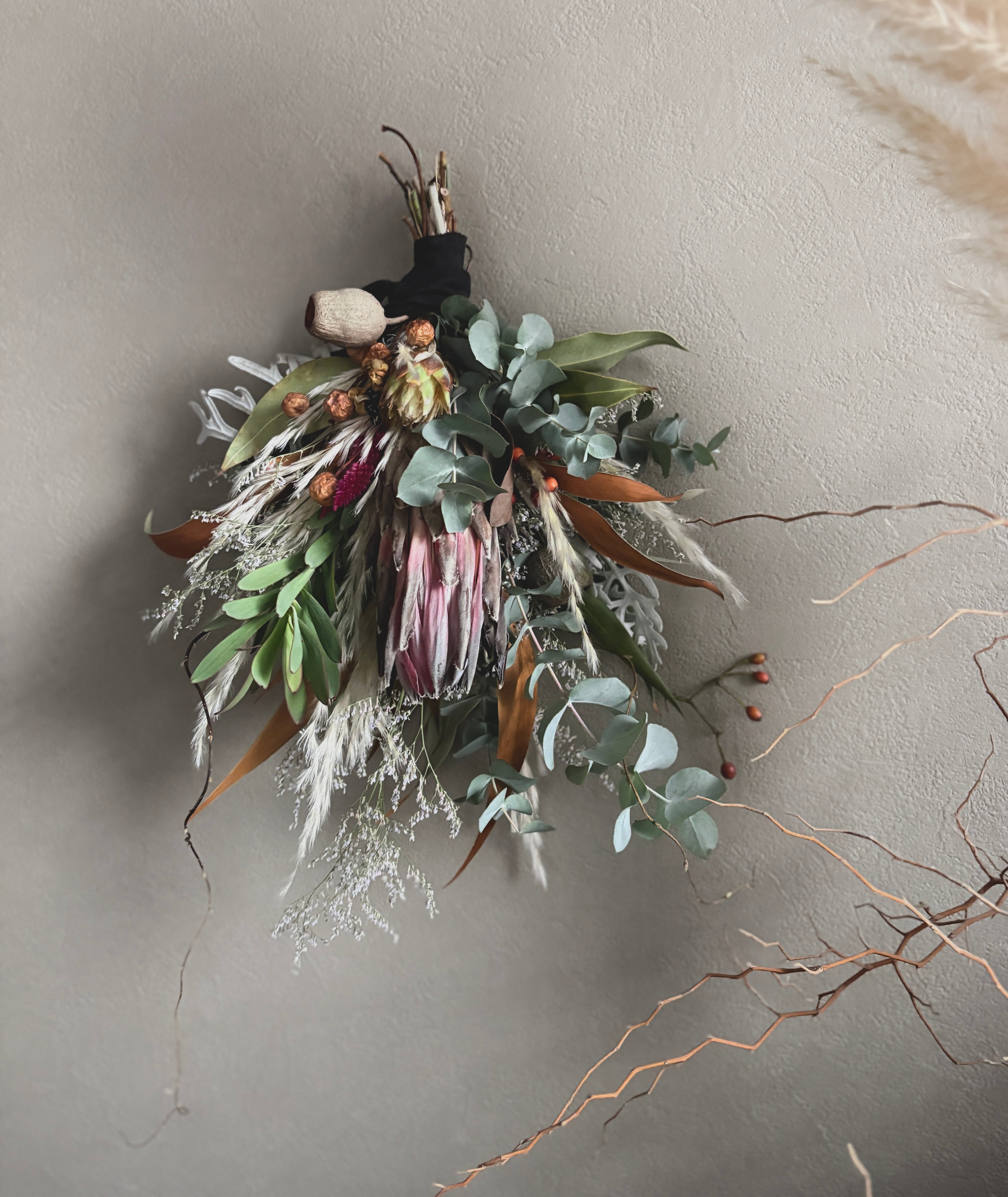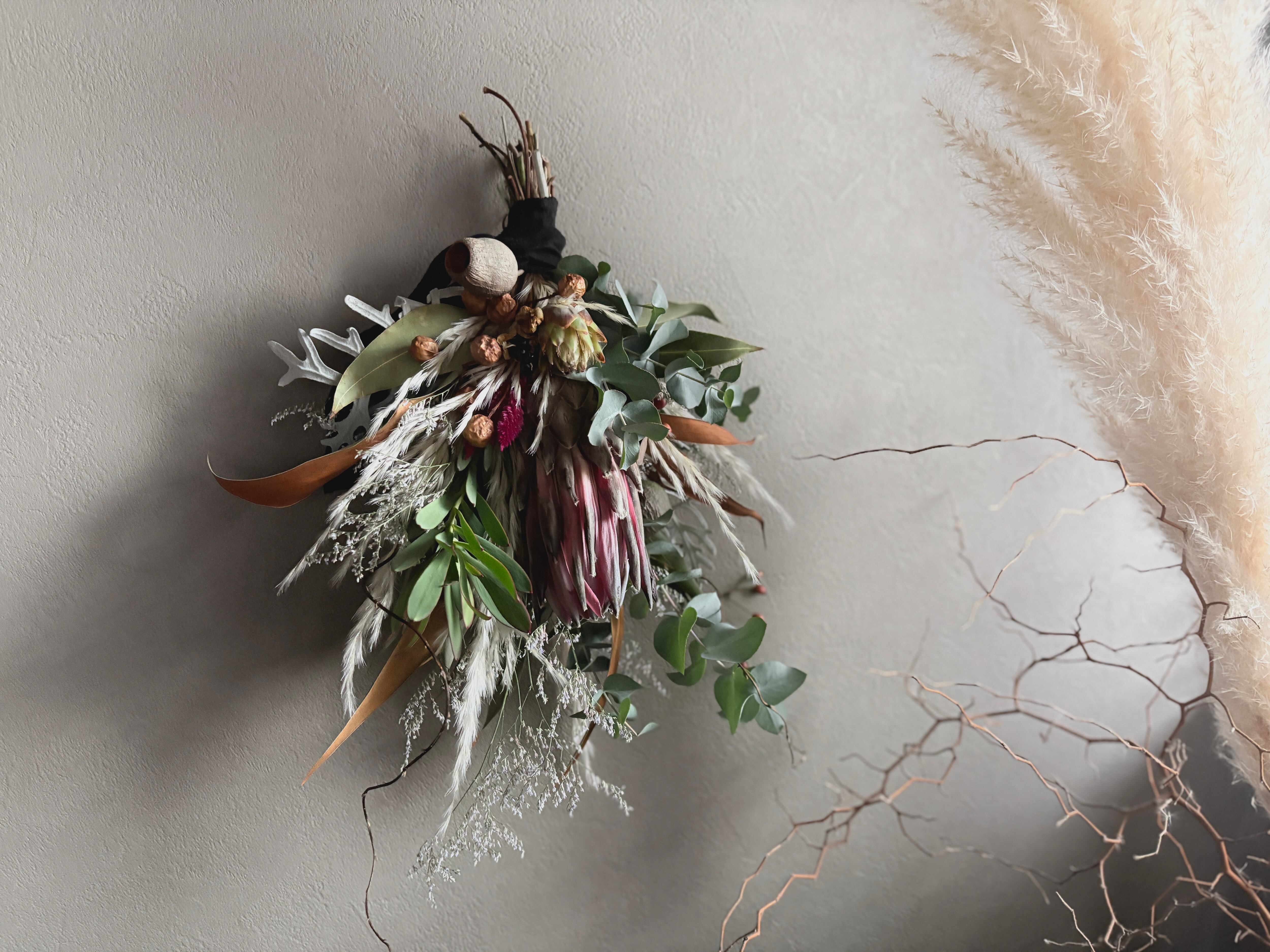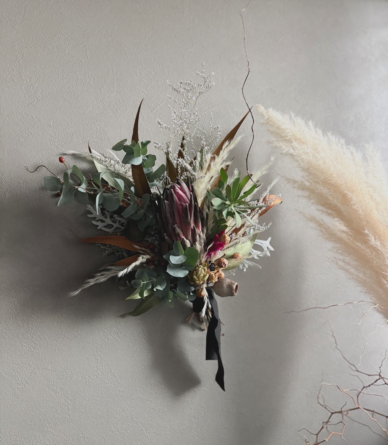 鮮やかなプロテアと、柔らかなパンパスグラスを合わせました。ユーカリやグレビレアゴールド、ベルガムナッツなど、自然の素材を束ねたスタイリッシュなデザインです。