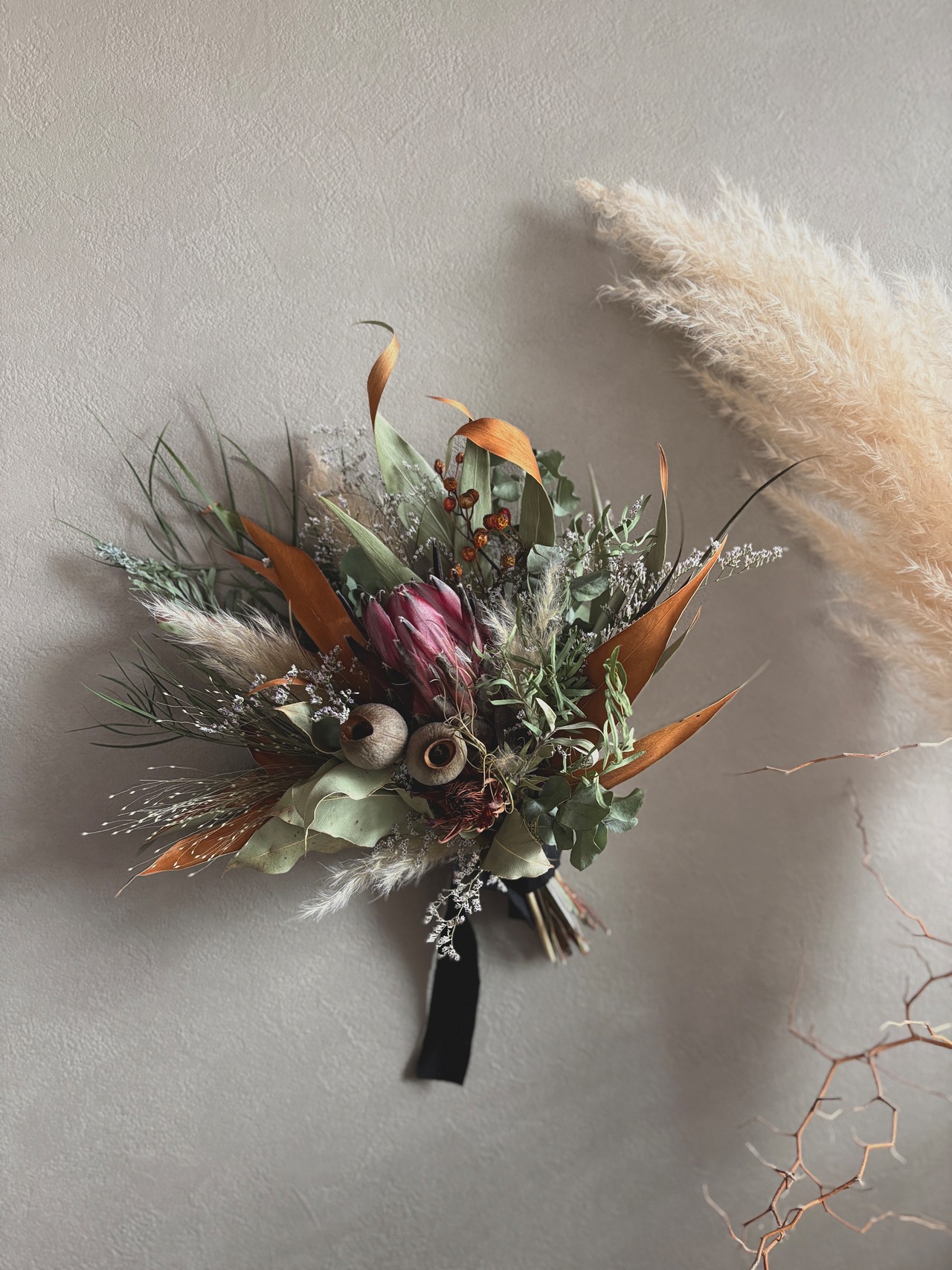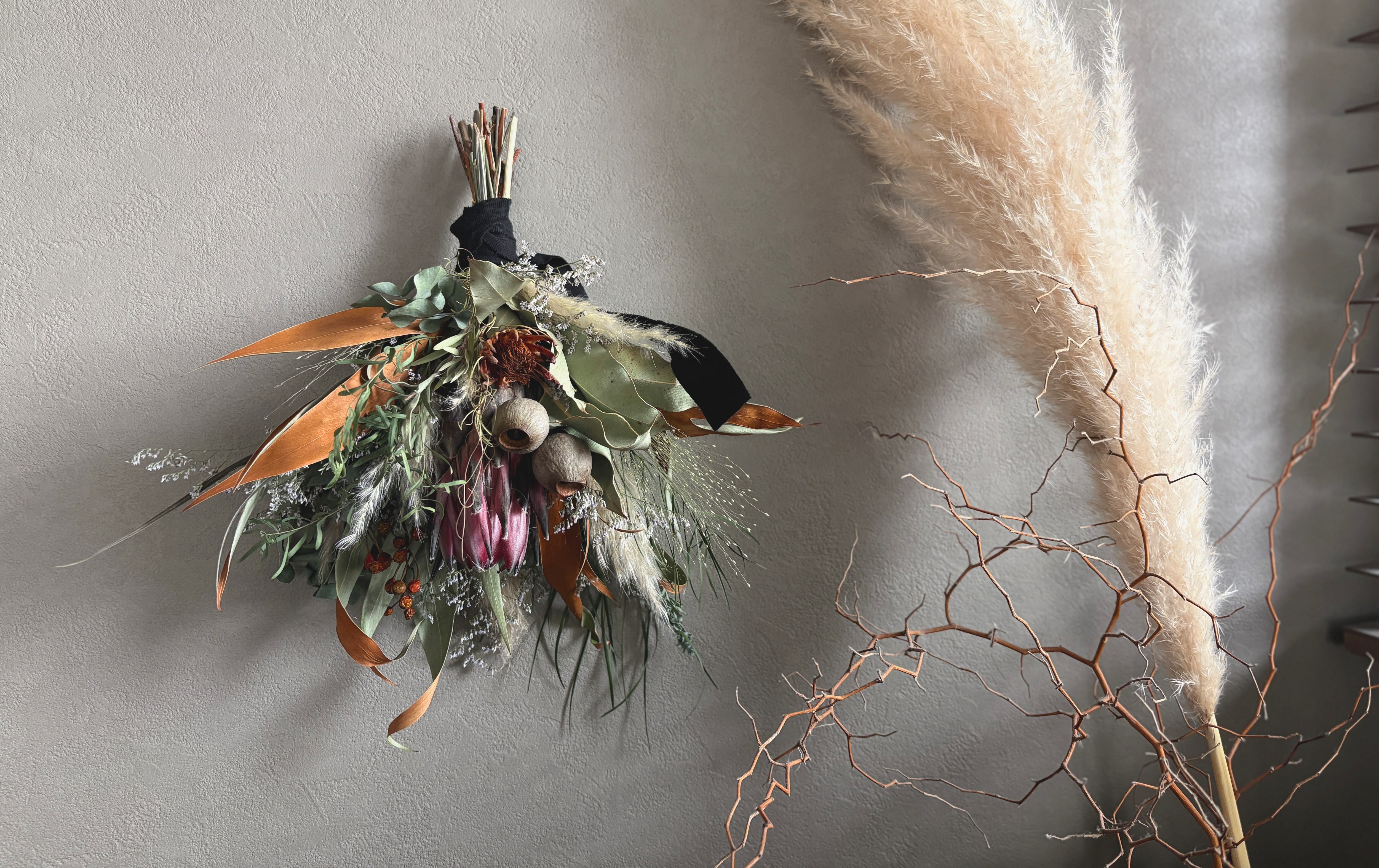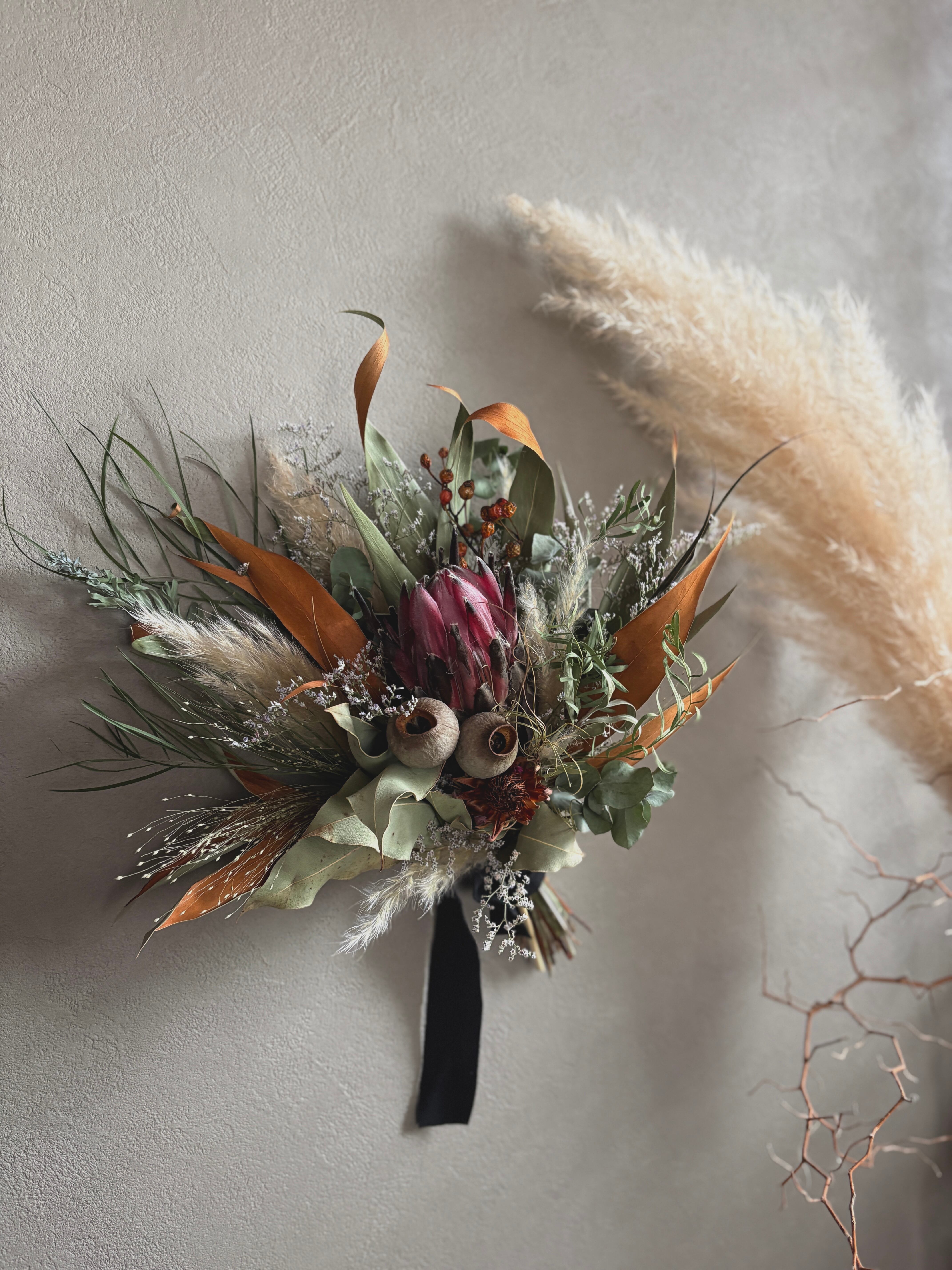 鮮やかなプロテアと柔らかなパンパスグラスを束ねました。ユーカリやグレビレアゴールド、ベルガムナッツなどネイティブをぎゅっと集めてスタイリッシュで暖かみのある秋色スワッグです。