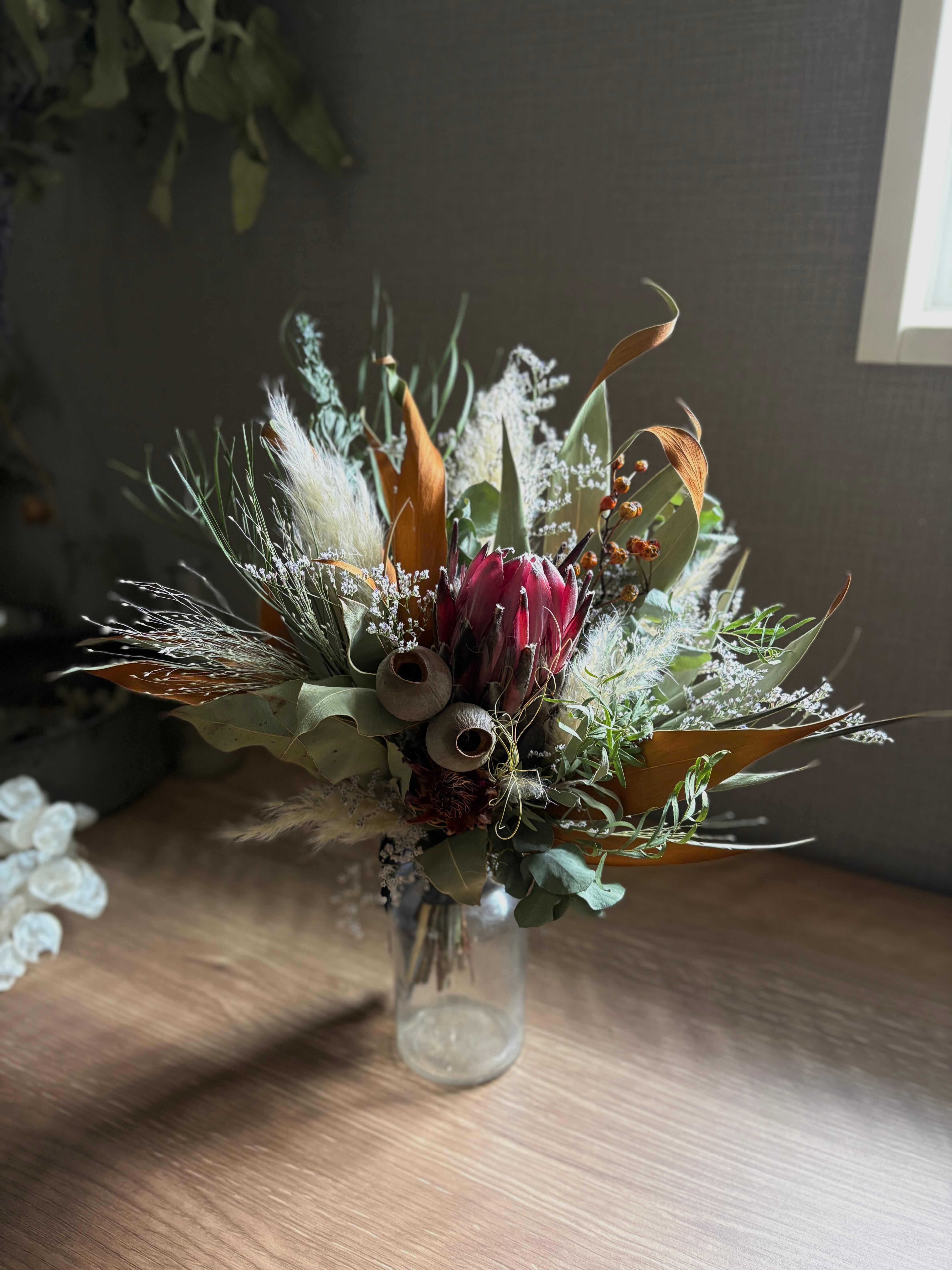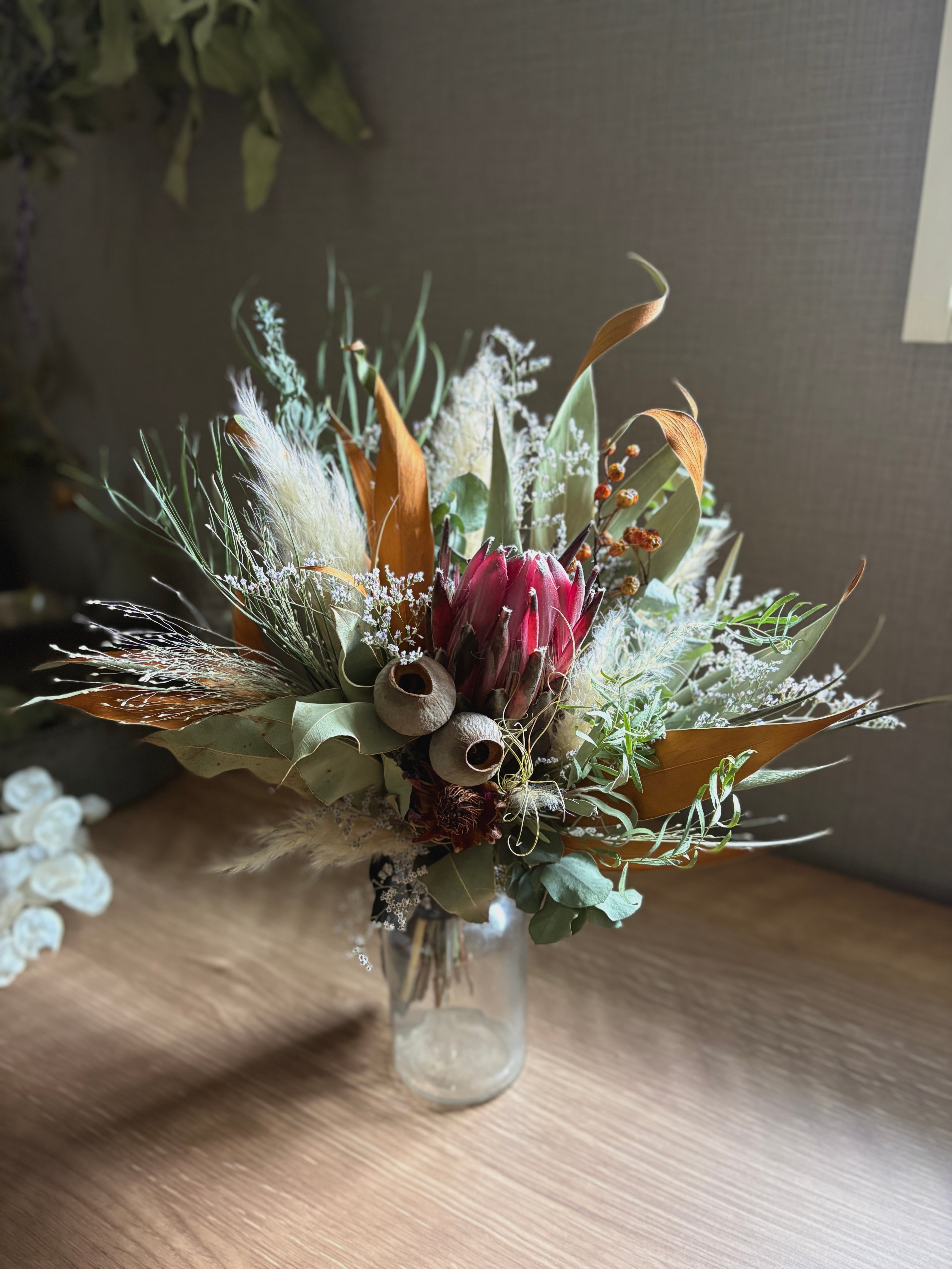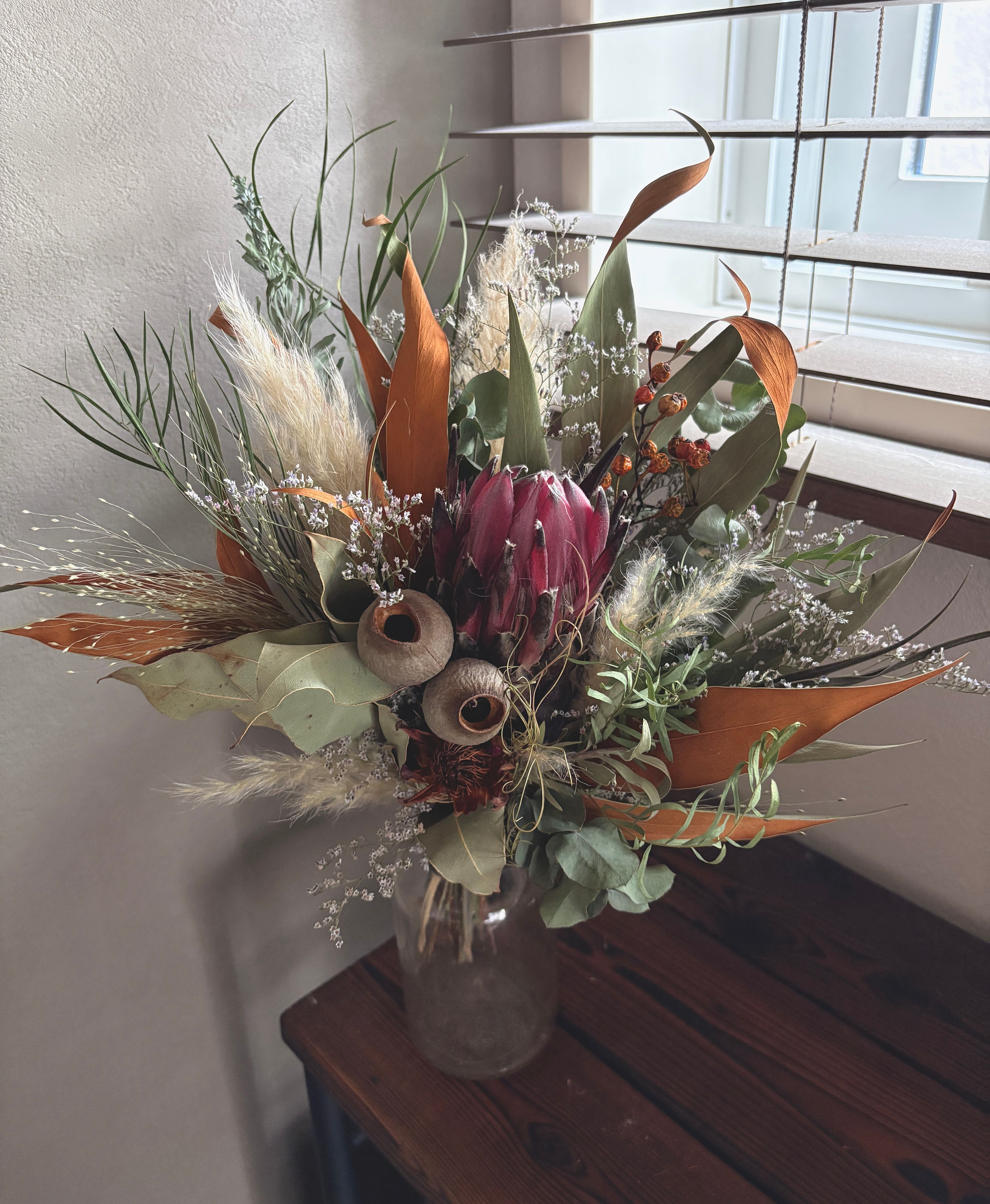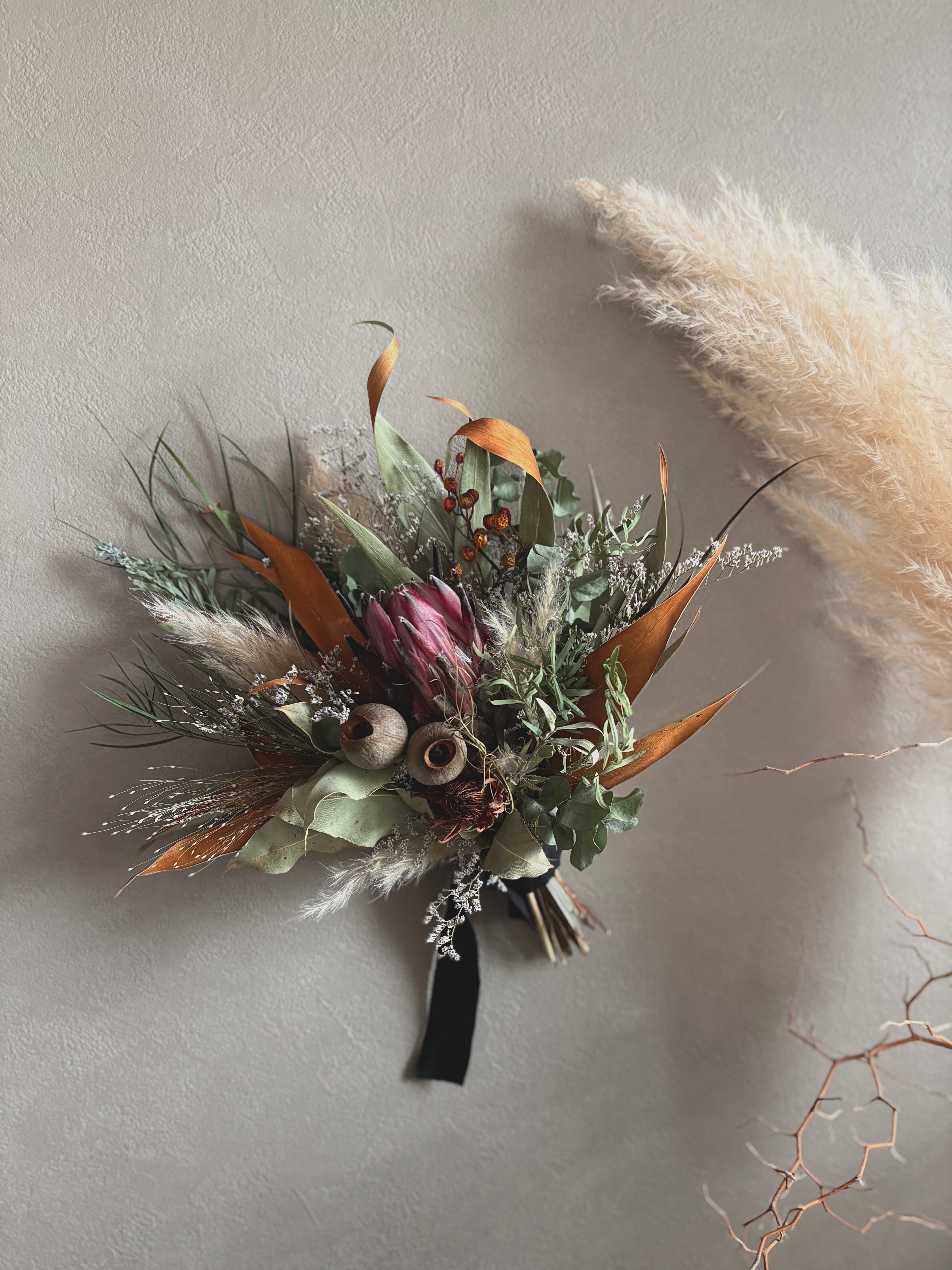 鮮やかなプロテアと柔らかなパンパスグラスを束ねました。ユーカリやグレビレアゴールド、ベルガムナッツなどネイティブをぎゅっと集めてスタイリッシュで暖かみのある秋色スワッグです。