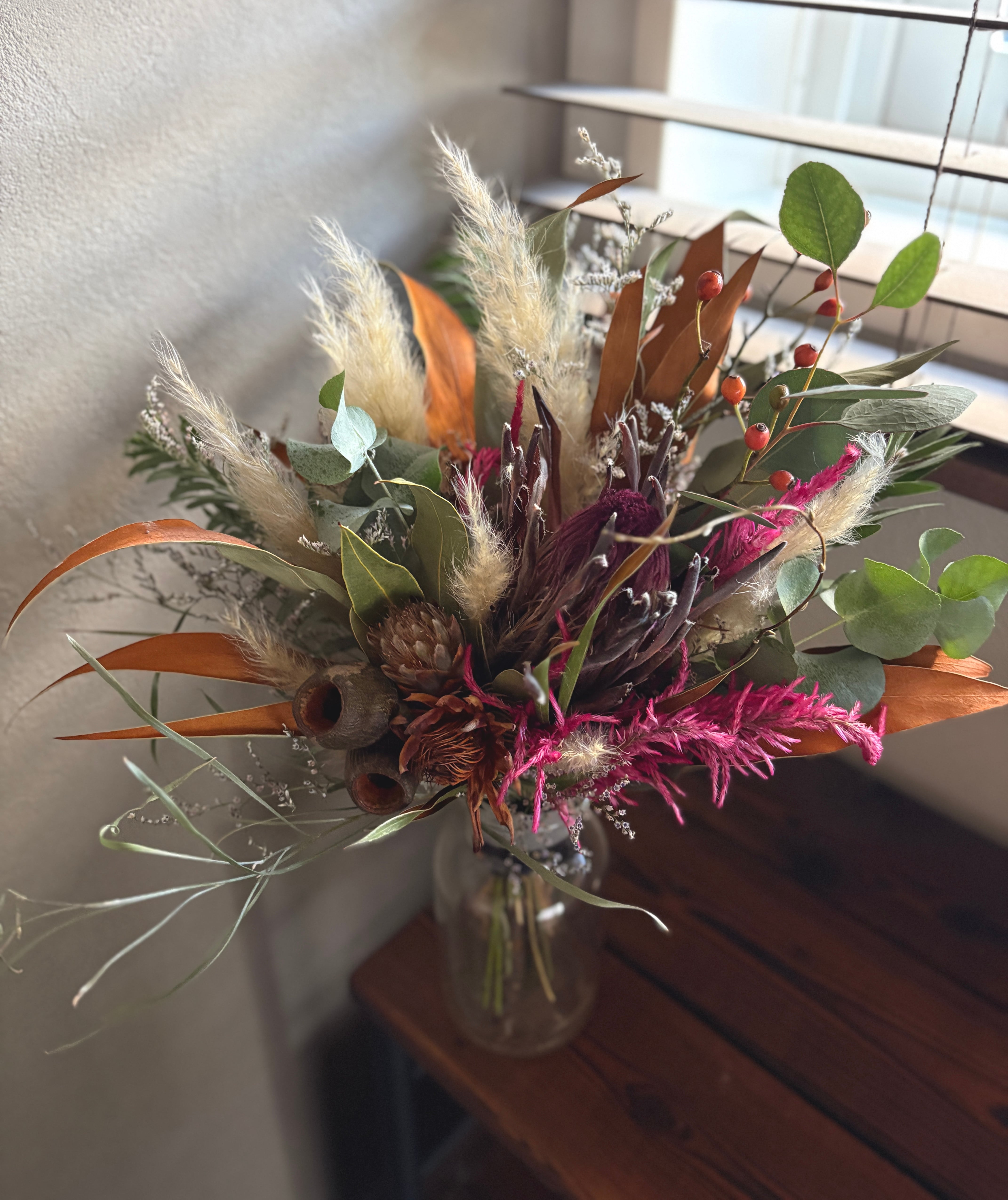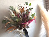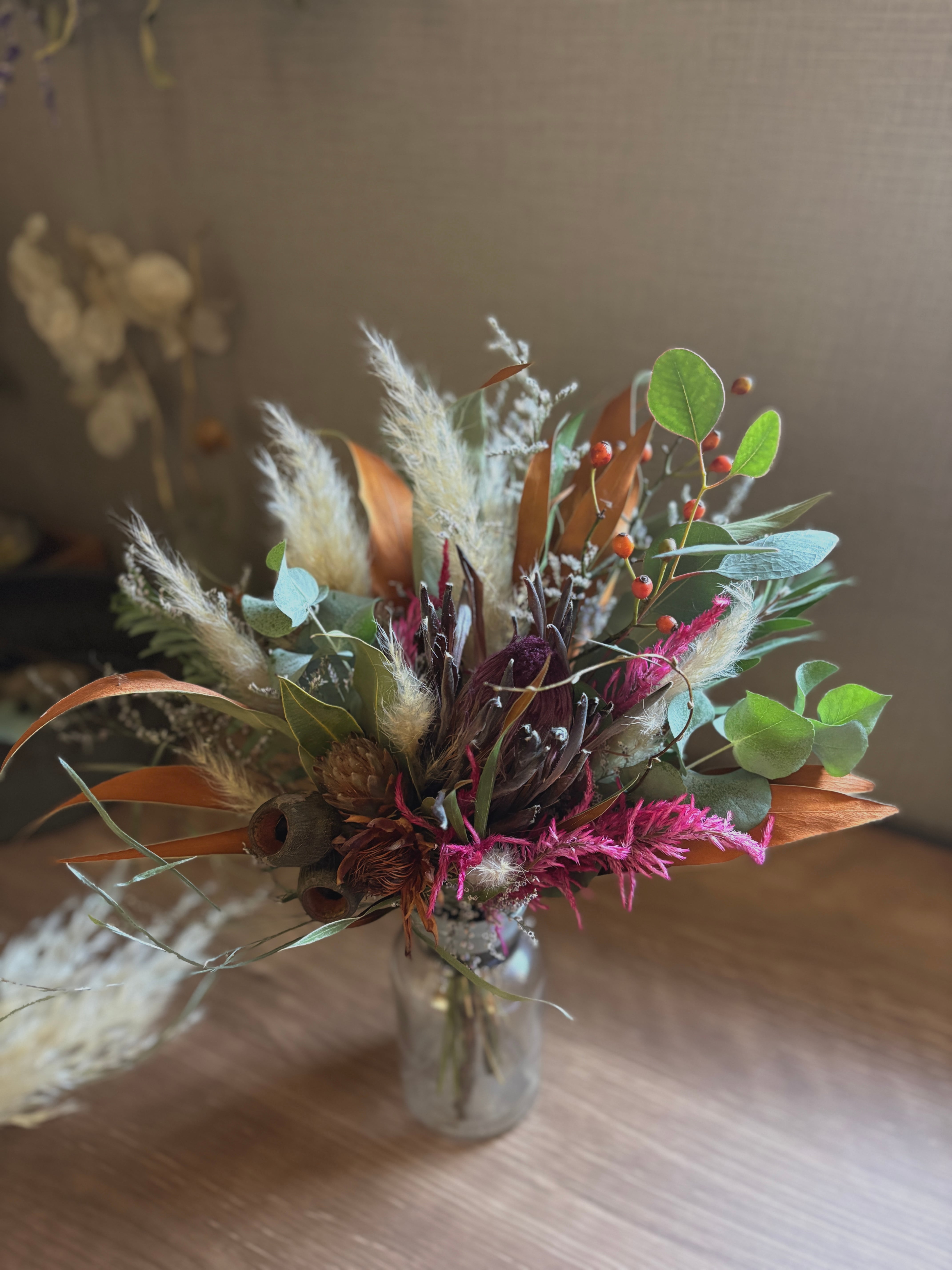 プロテアと柔らかいパンパスグラスを合わせ、ケイトウやグレビレアゴールド、プルモッサムなど鮮やかな秋色を束ねました。