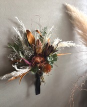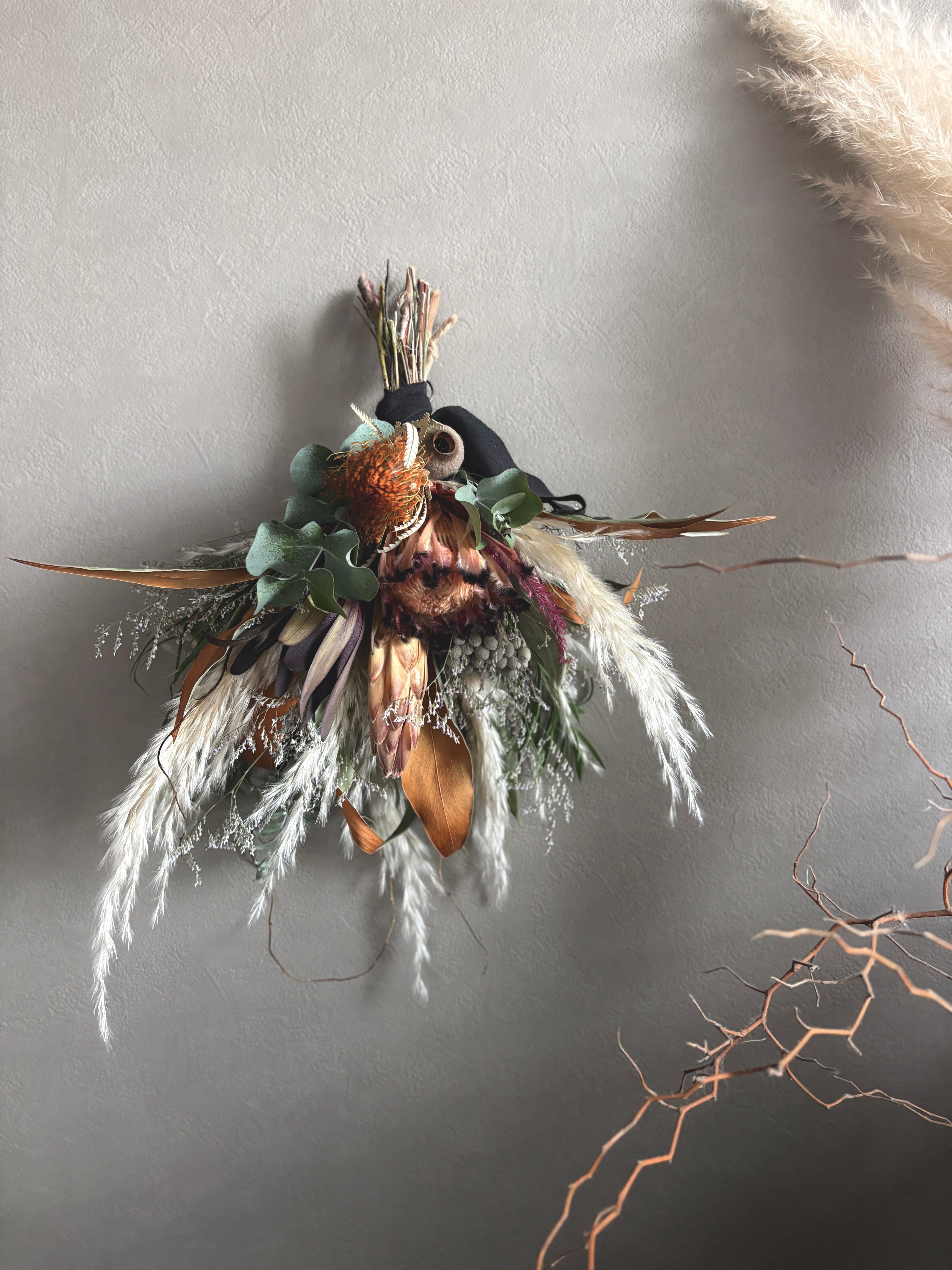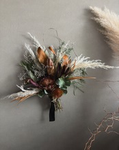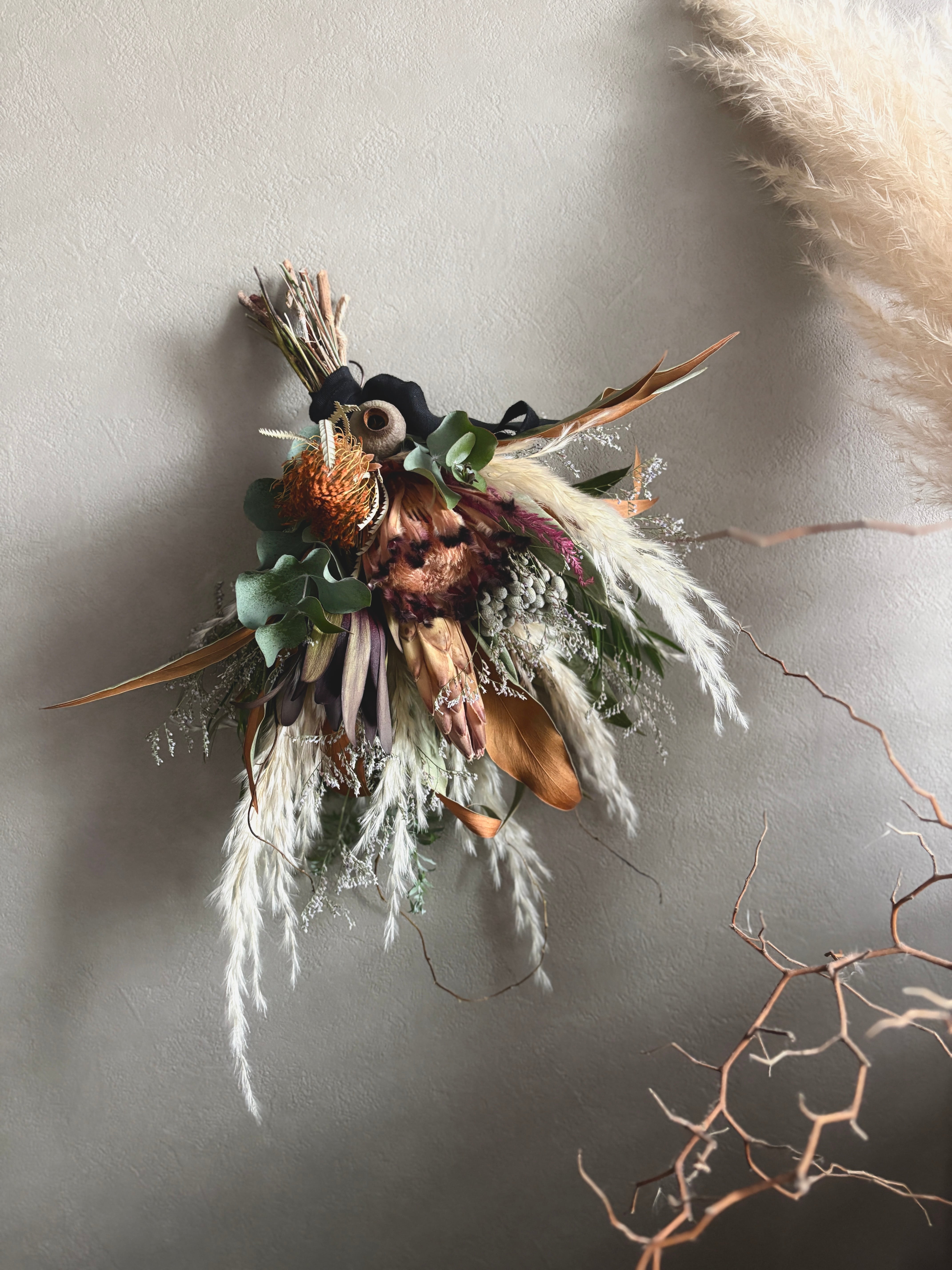 フォルモーサや、リペンズ、リューカデンドロン、グレビレアゴールドなどネイティブフラワーをたっぷり束ねて、秋色スワッグに仕上げました。