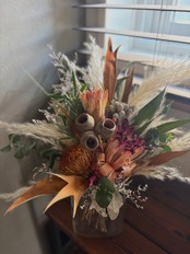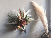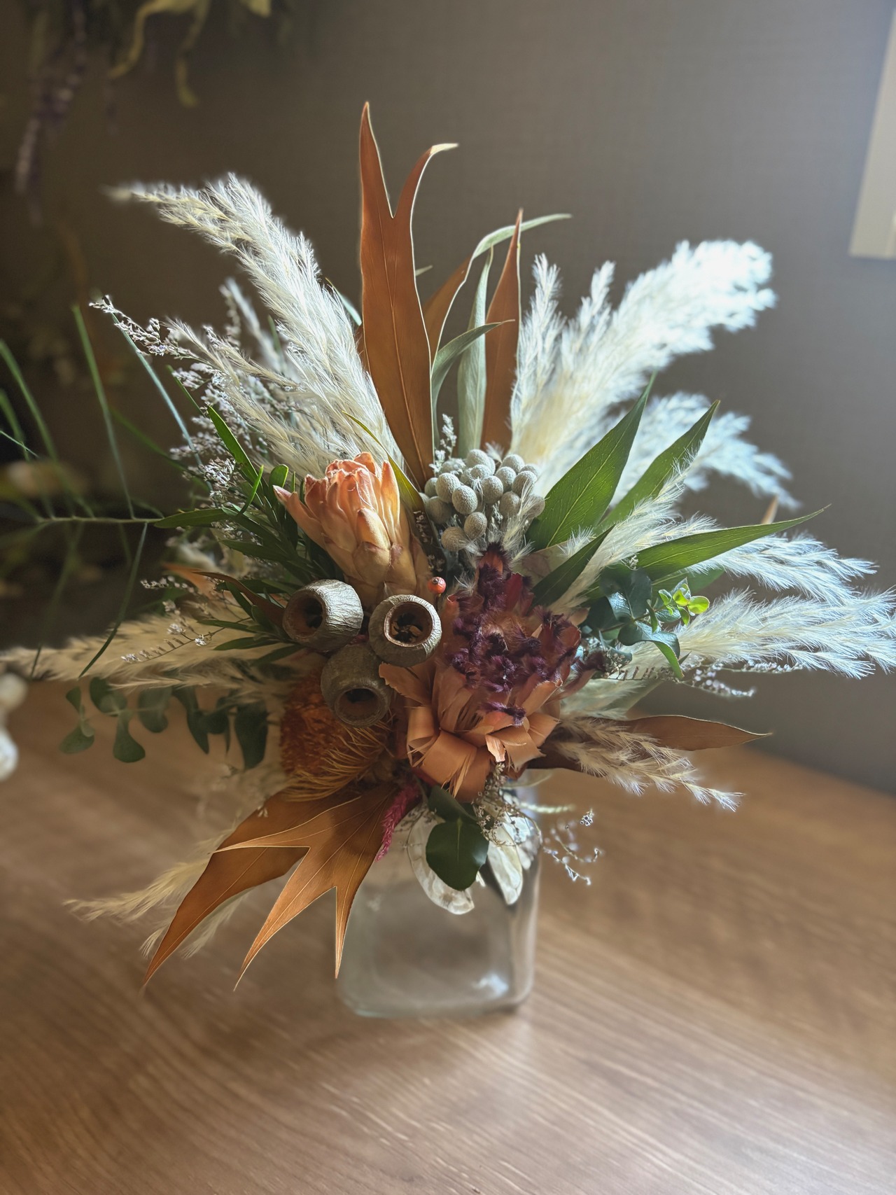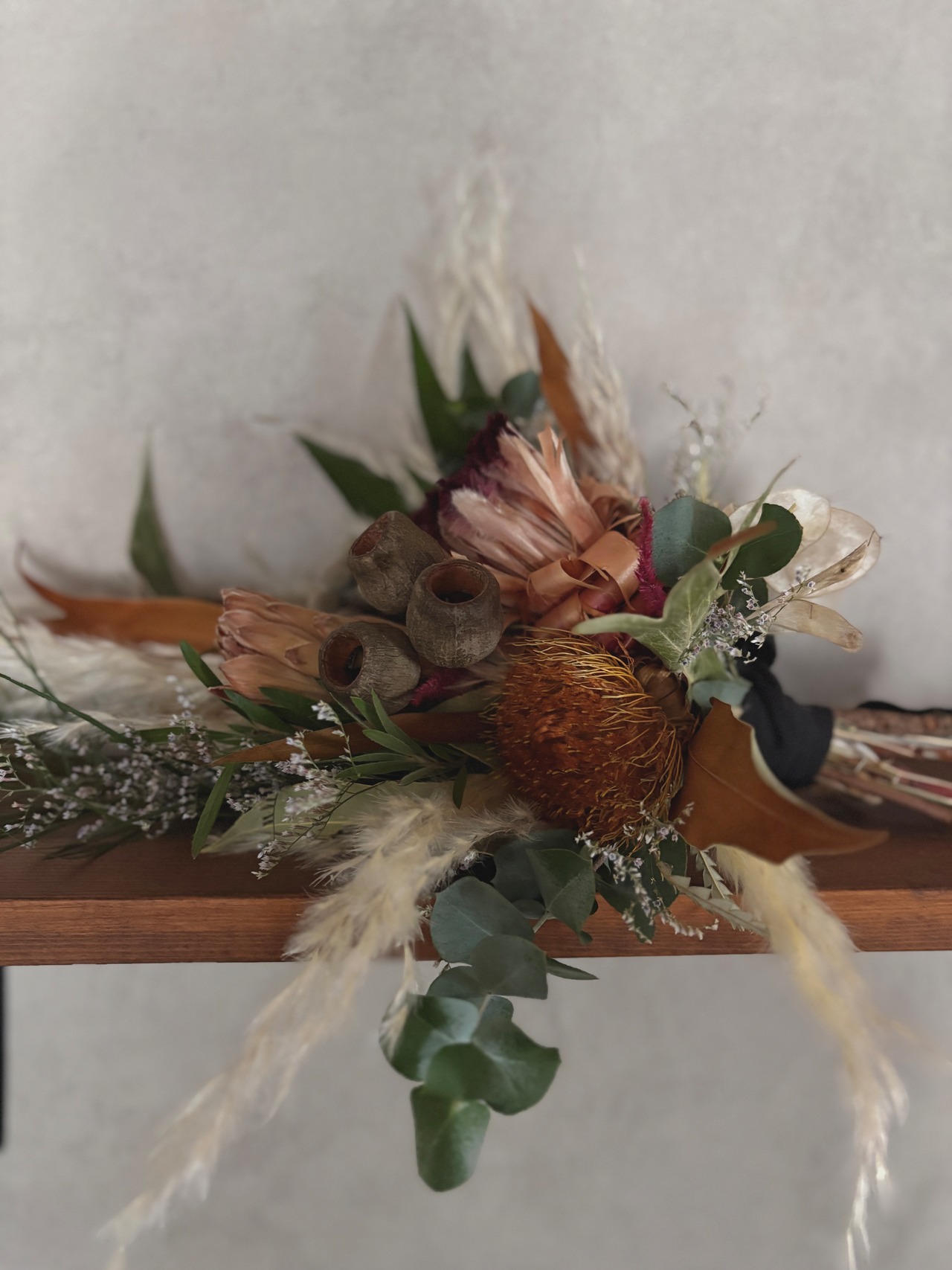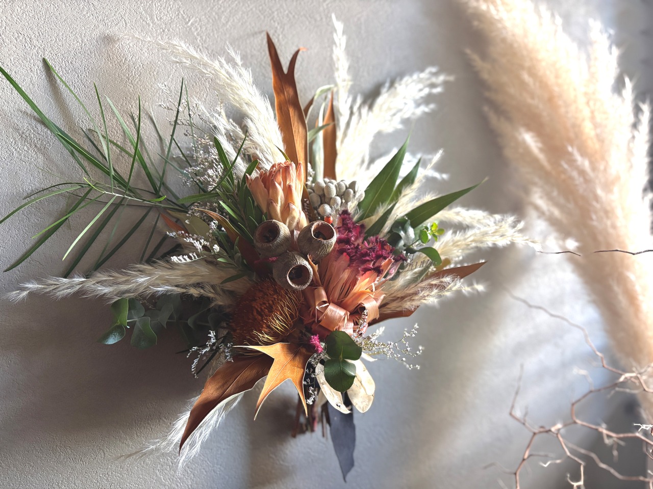 リペンズ、リューカデンドロン、グレビレアゴールド、ベルガムナッツなどネイティブフラワーをたっぷり束ねて、秋色スワッグに仕上げました。