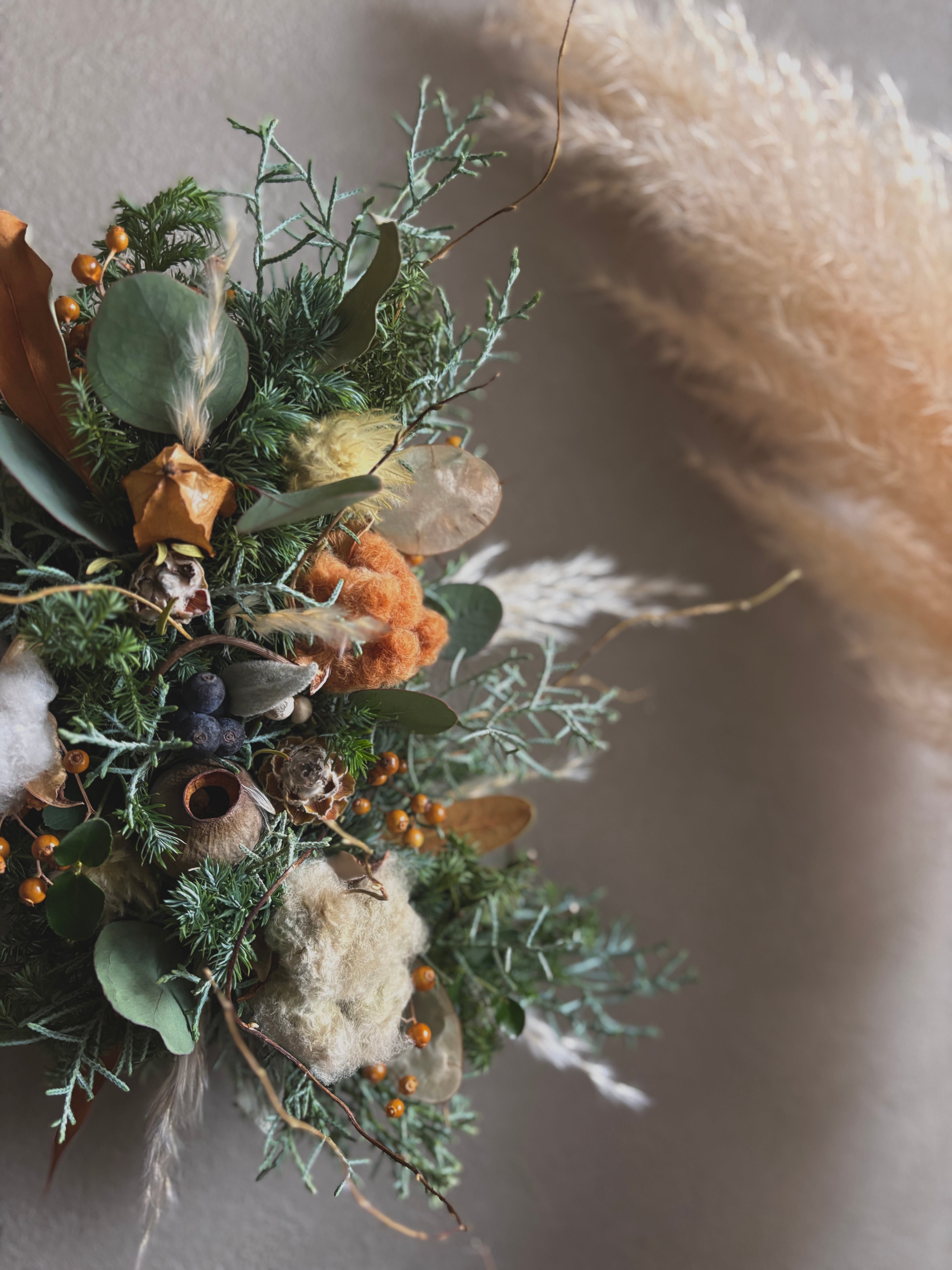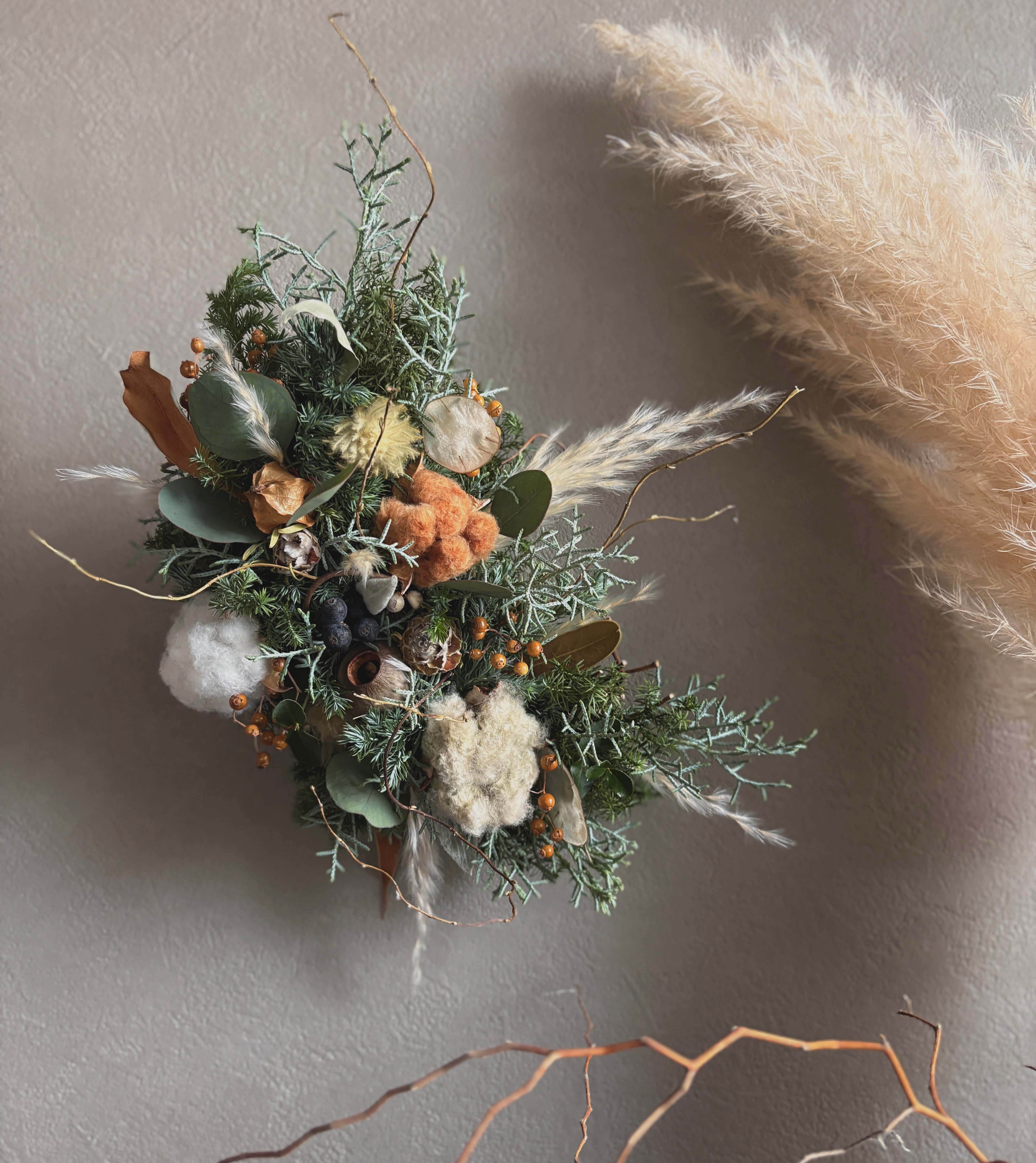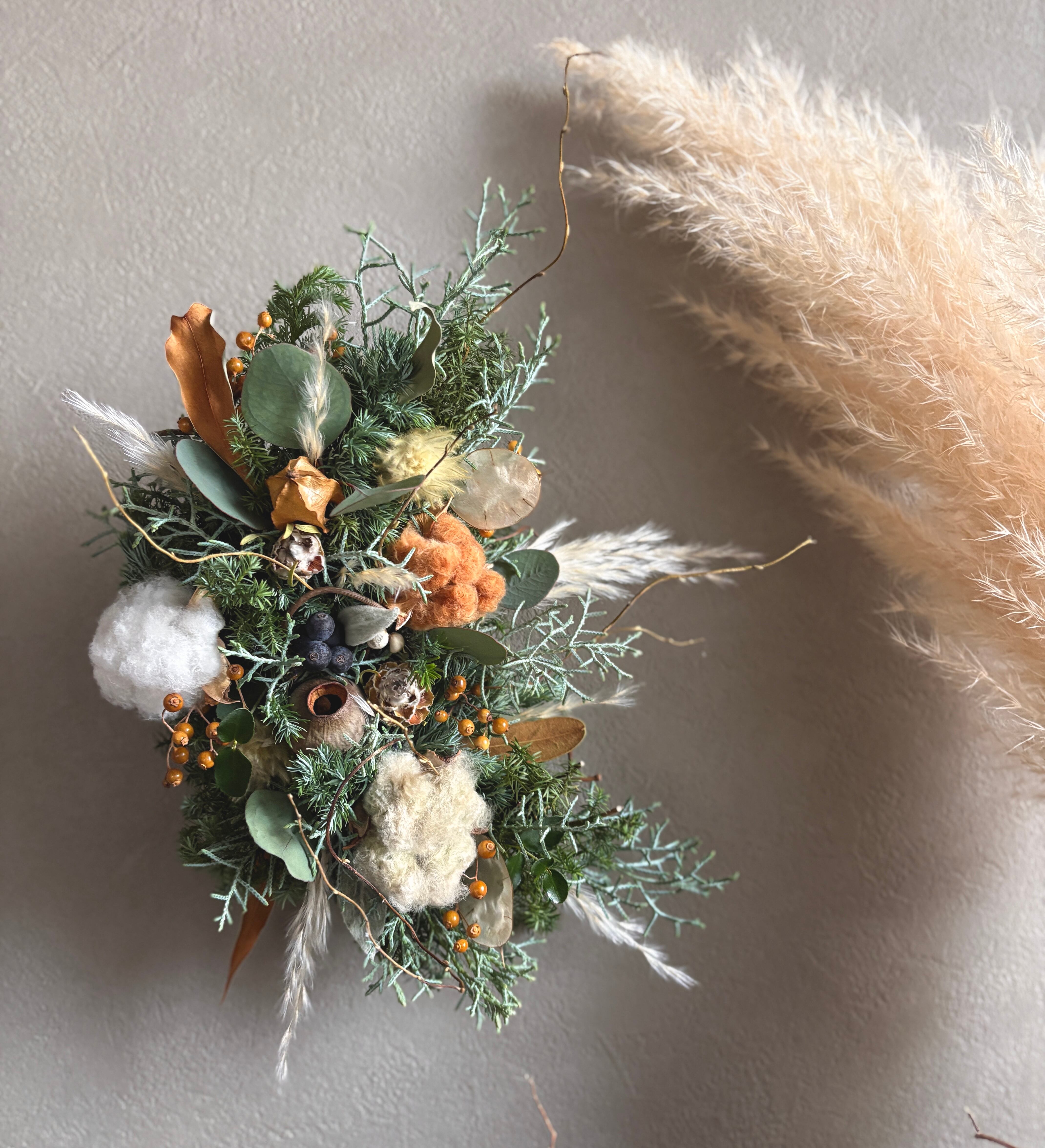 コットンフラワーと、冬の雰囲気を引き立てるパンパスグラス、ベルガムナッツ、ヒムロスギ、ブルーアイス、ブルーバードなどと合わせ、温かみのある雰囲気に仕上げました。