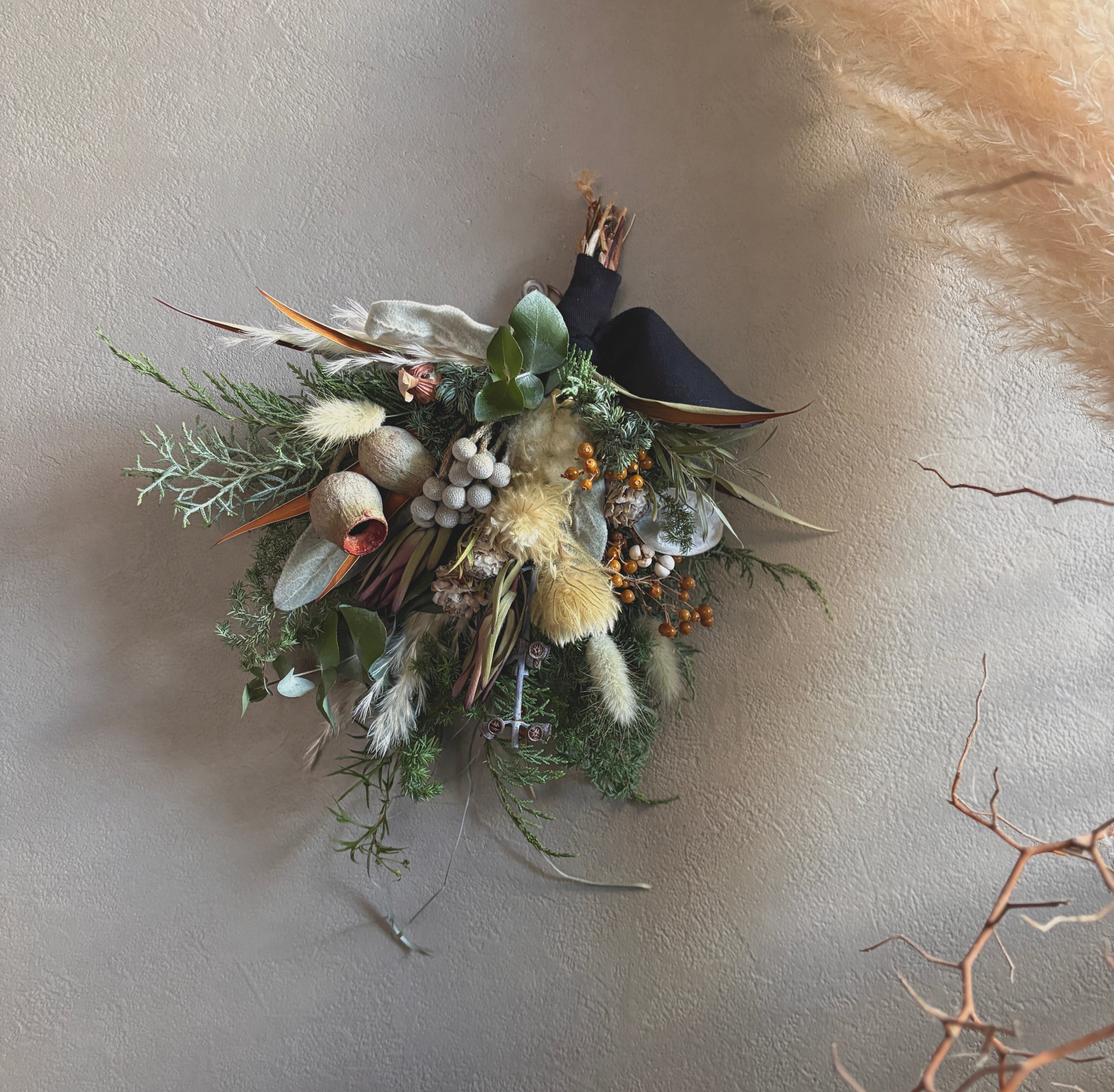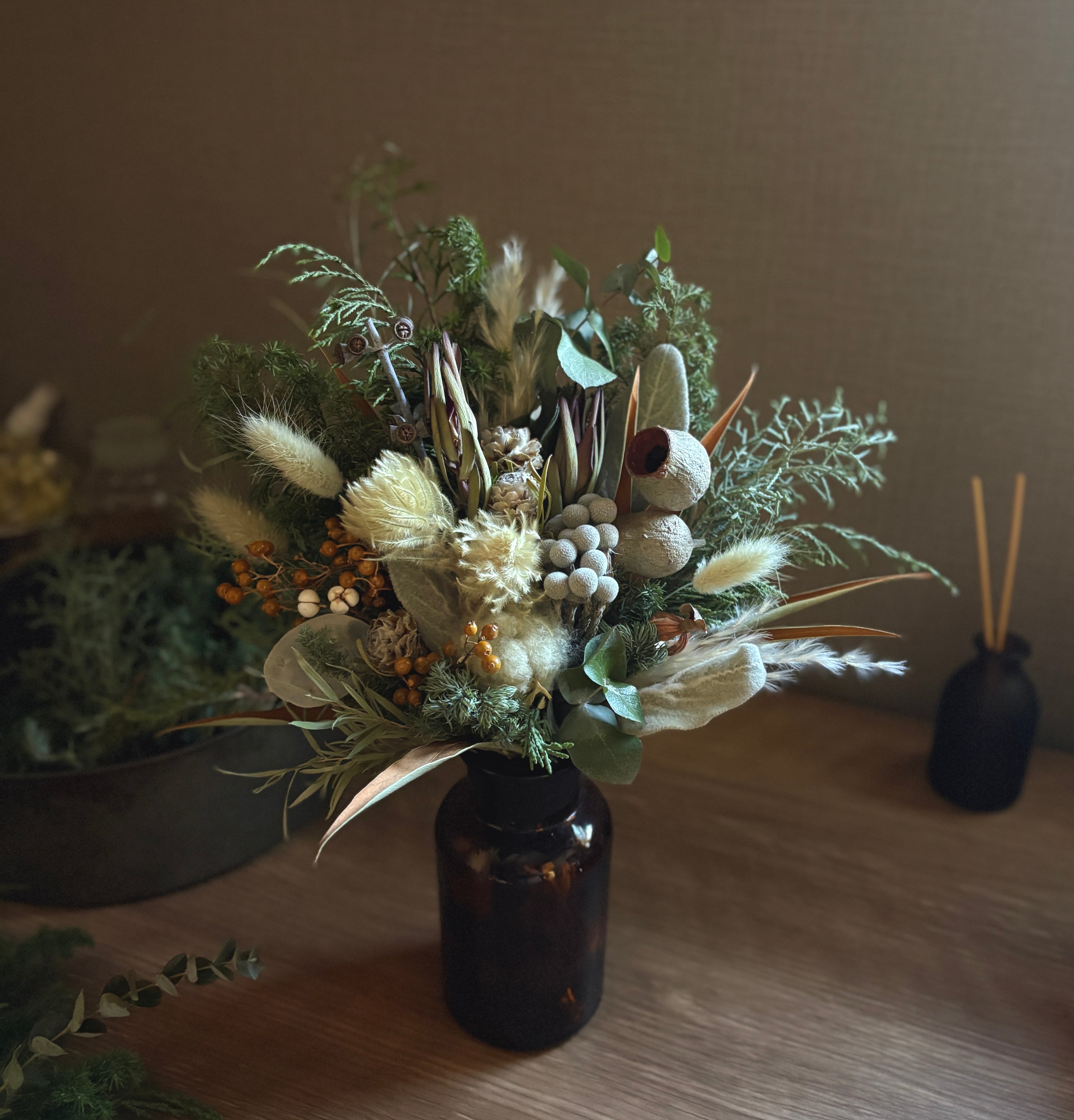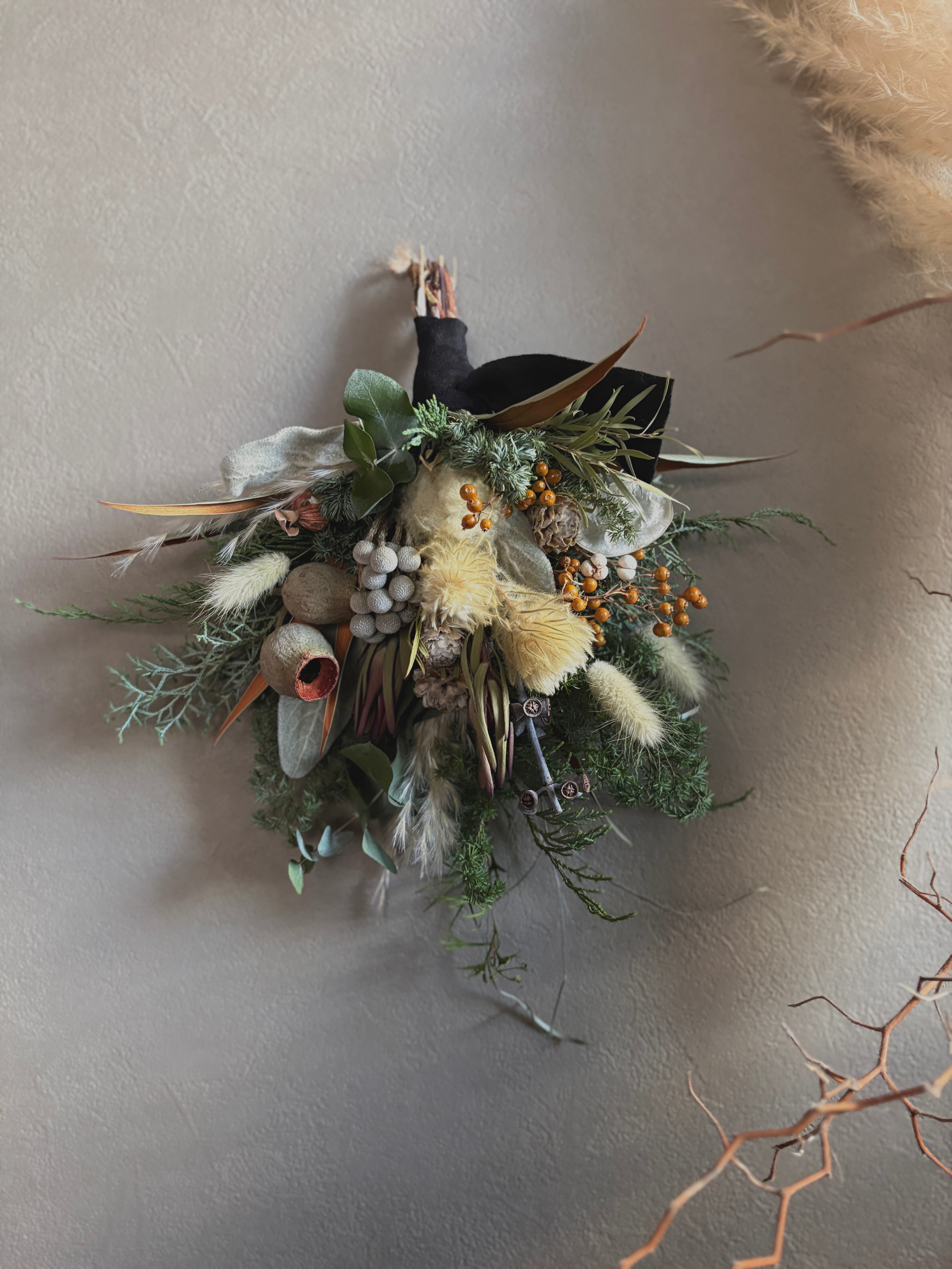 自然素材の特性により、日々色味の変化が見られます。ドライフラワーならではの風合いや色合いの深まりを、ぜひお楽しみください。