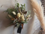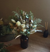 冬の雰囲気を引き立てるコットンフラワー、ベルガムナッツ、ヒムロスギ、ブルーアイス、ブルーバードなどを合わせ暖かい雰囲気に仕上げました。