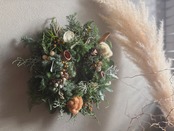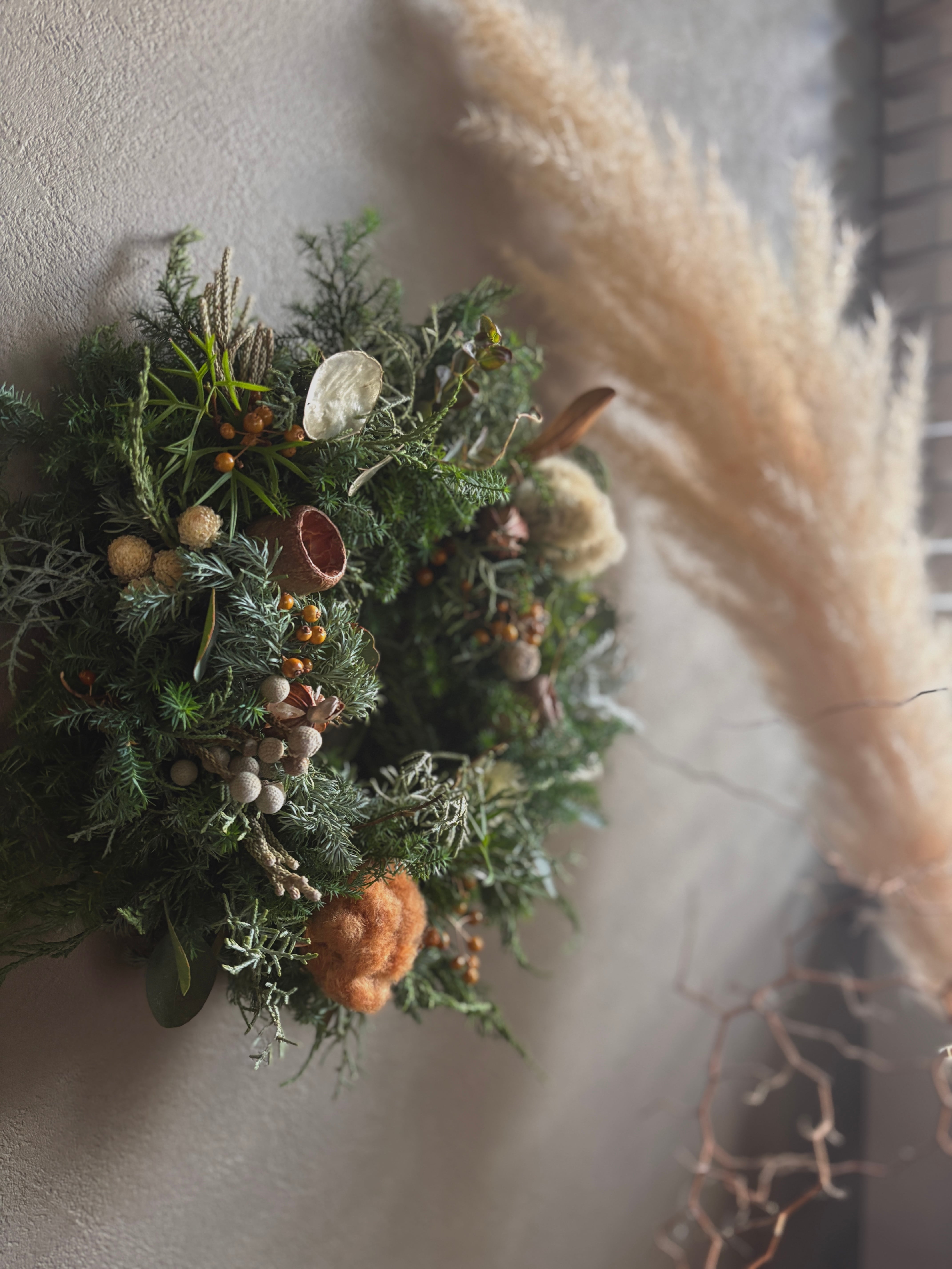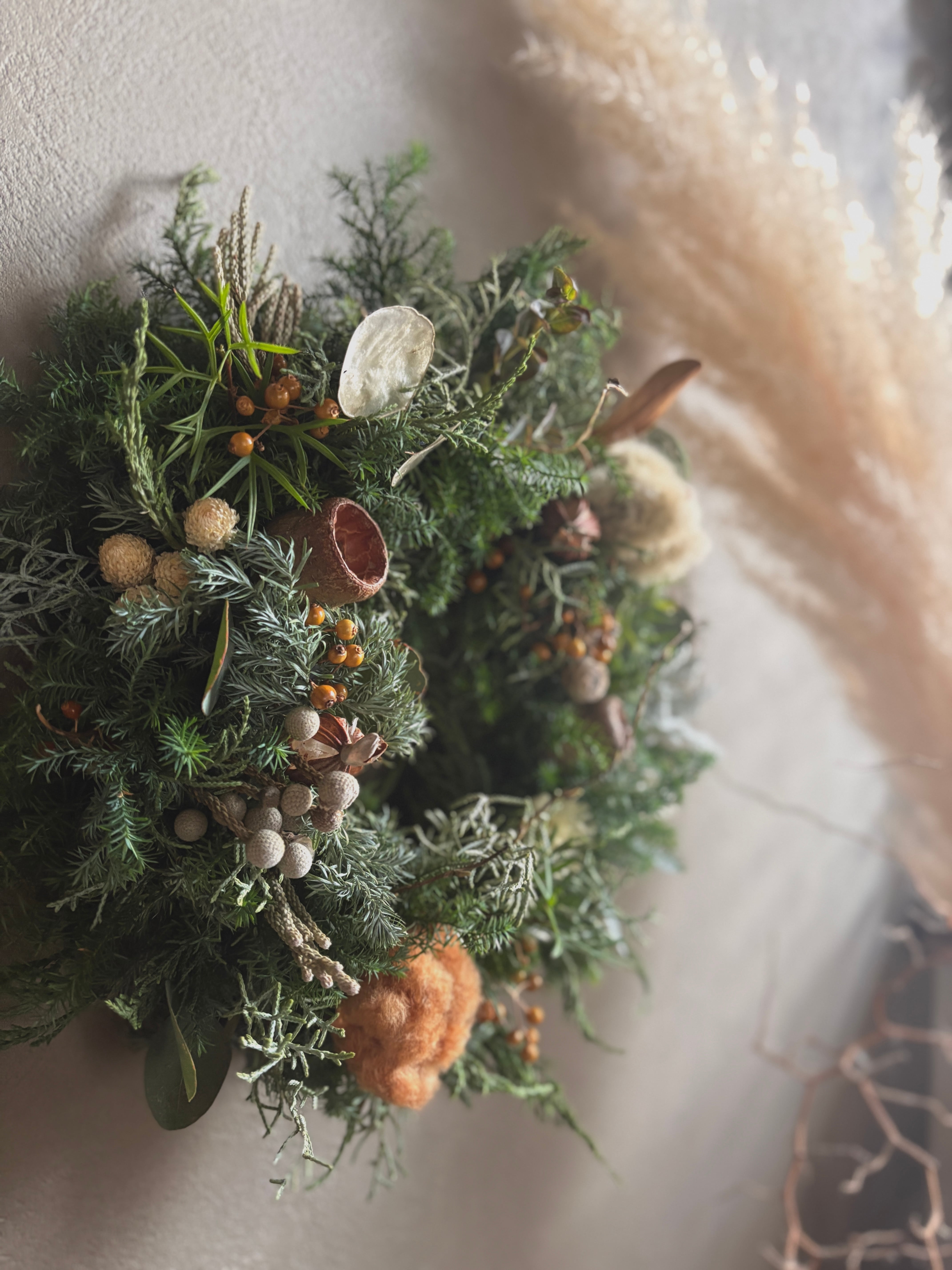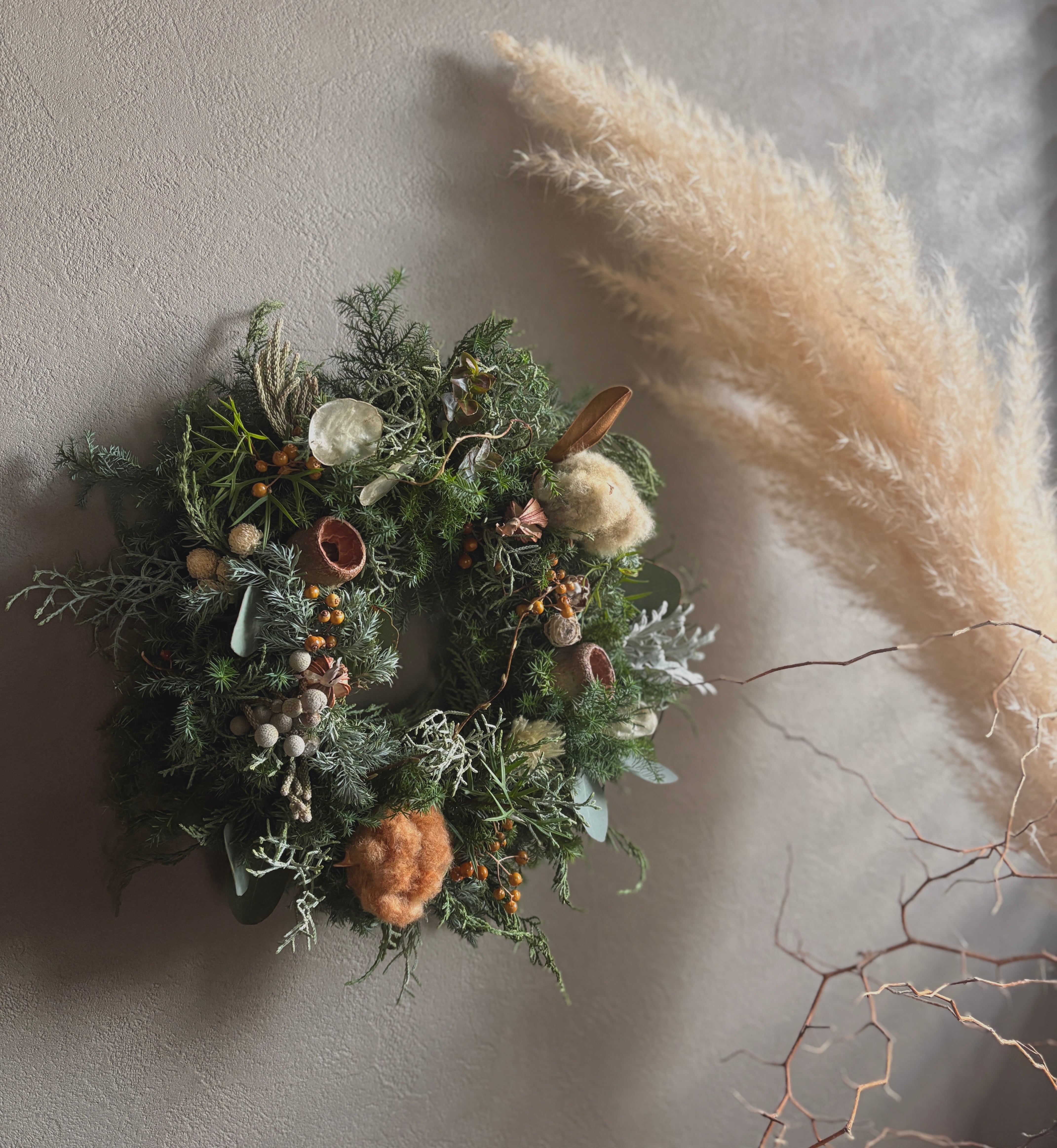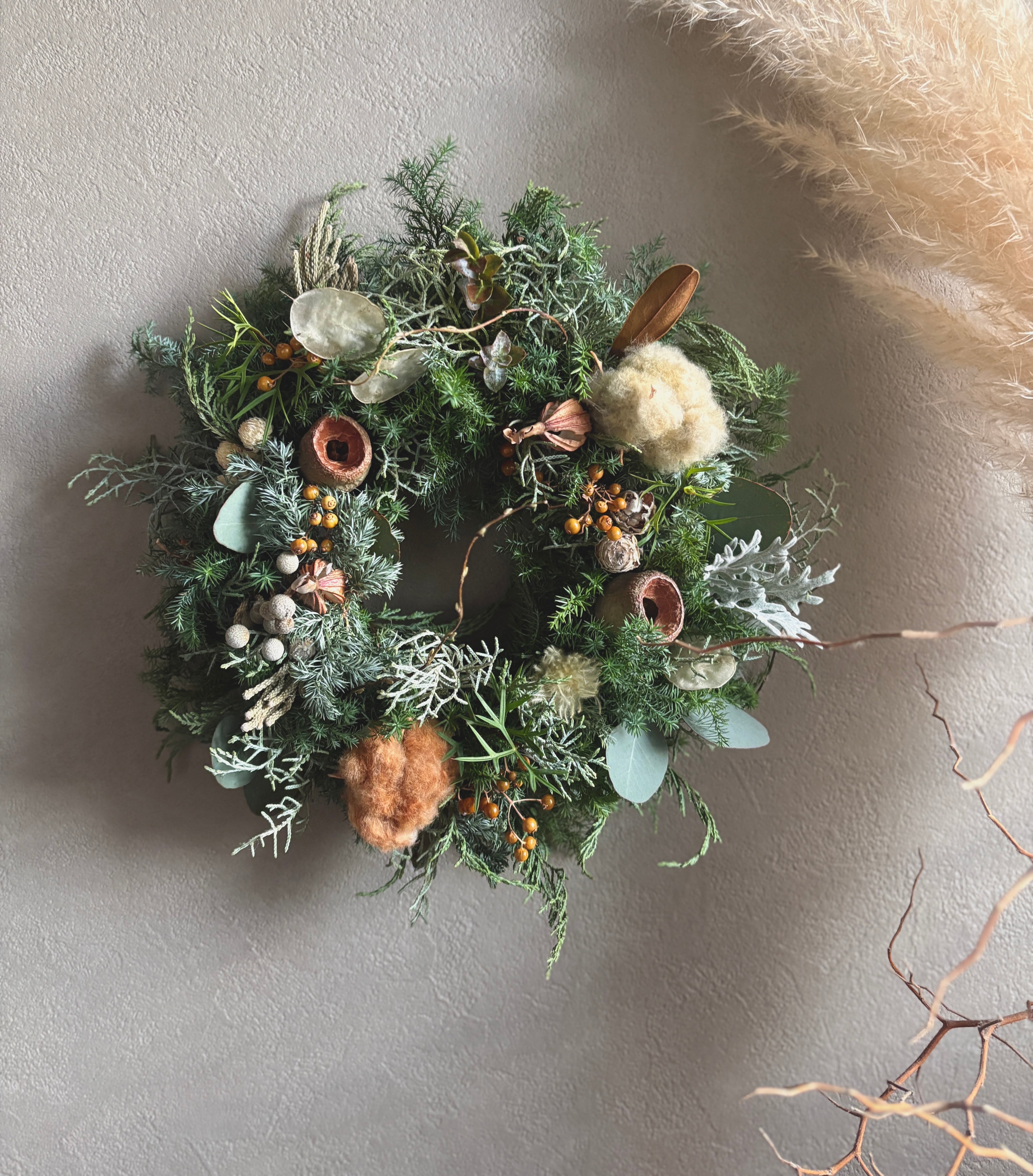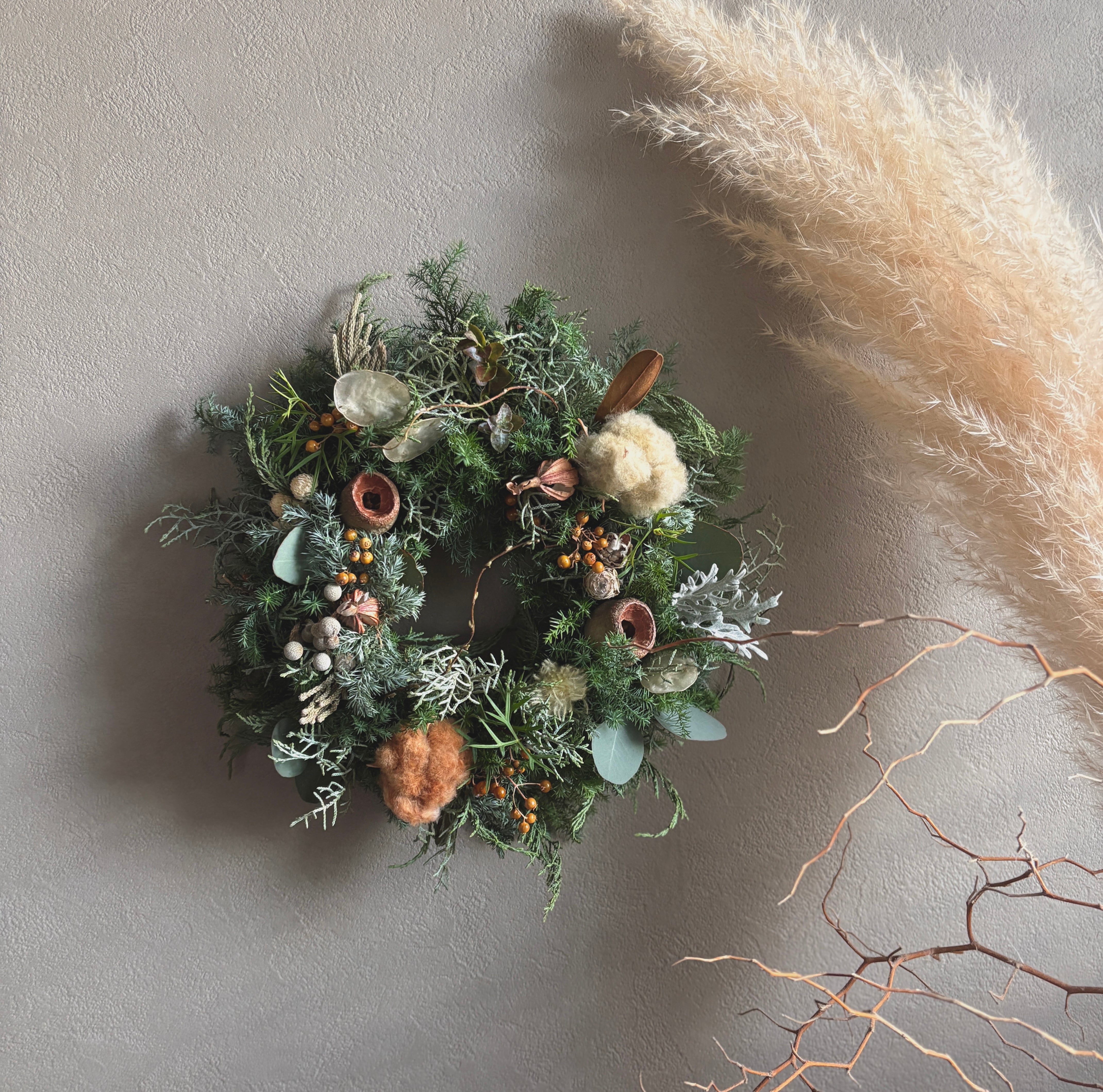 コットンフラワー、ベルガムナッツ、ヒムロスギなど季節の草花で暖かいリースにしました。 クリスマスはもちろん、冬のインテリアにぴったりのリースです。