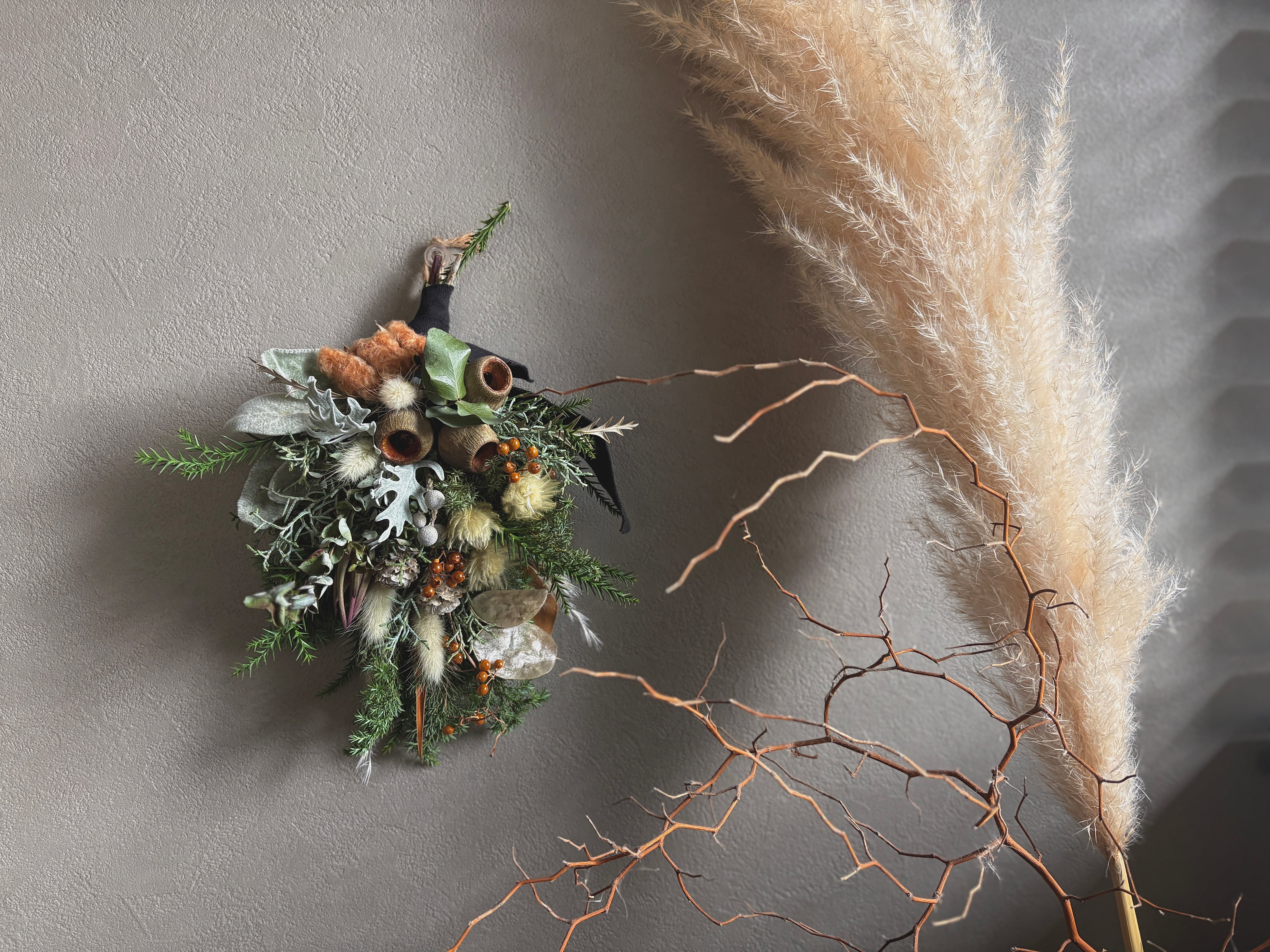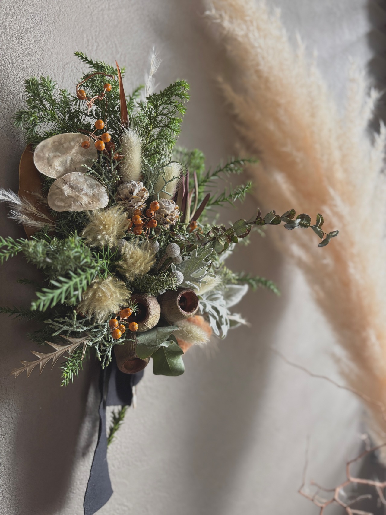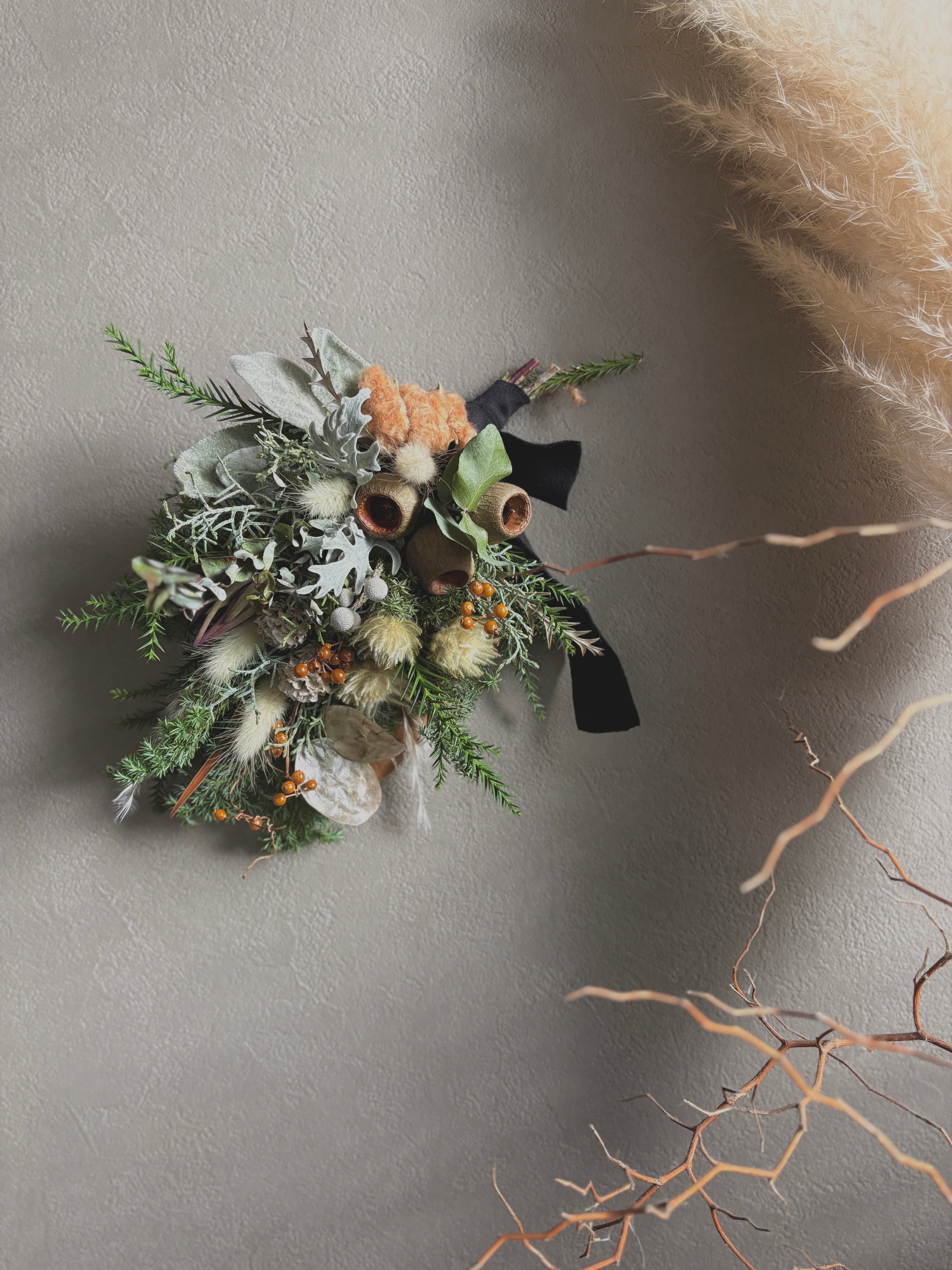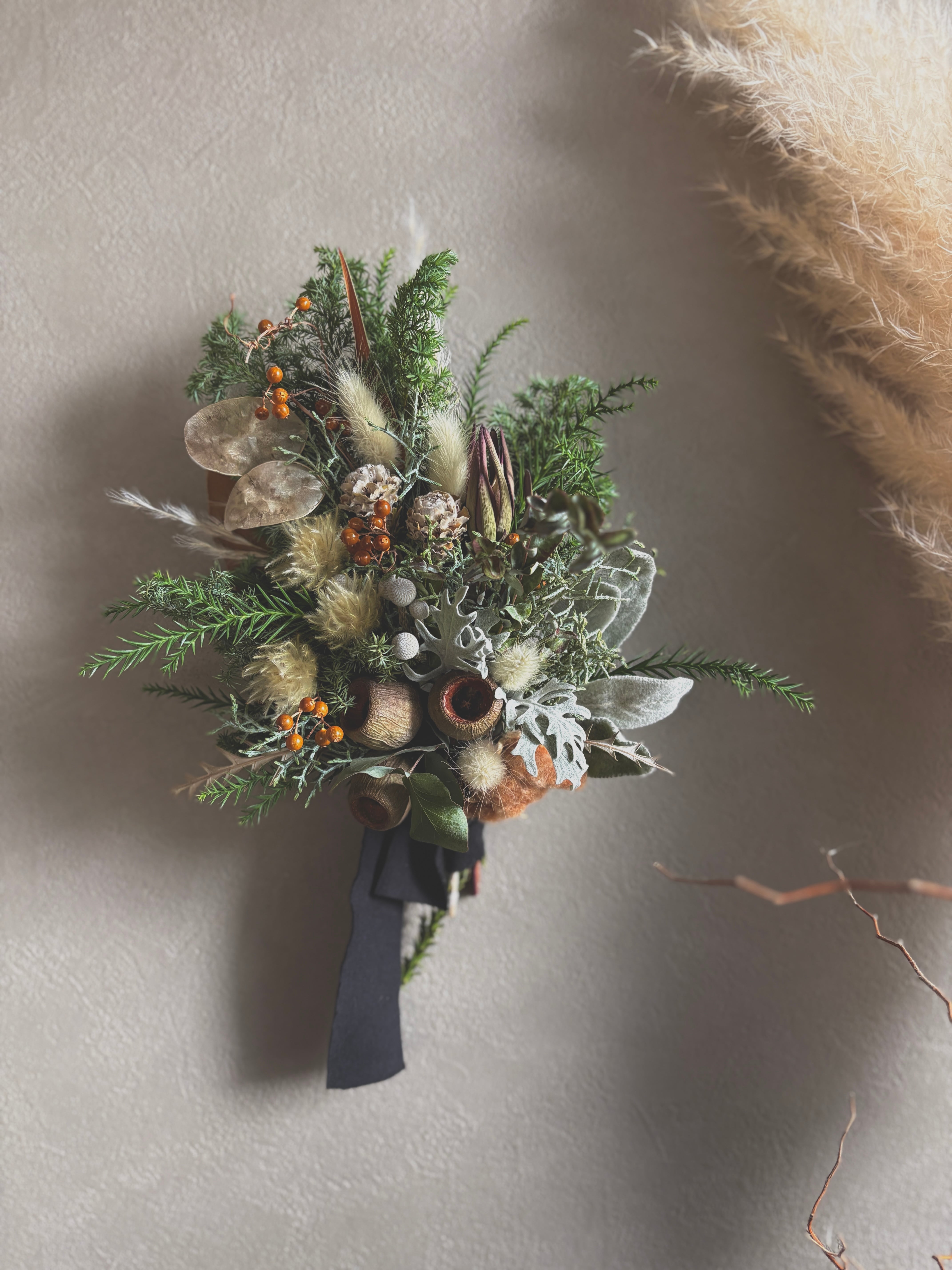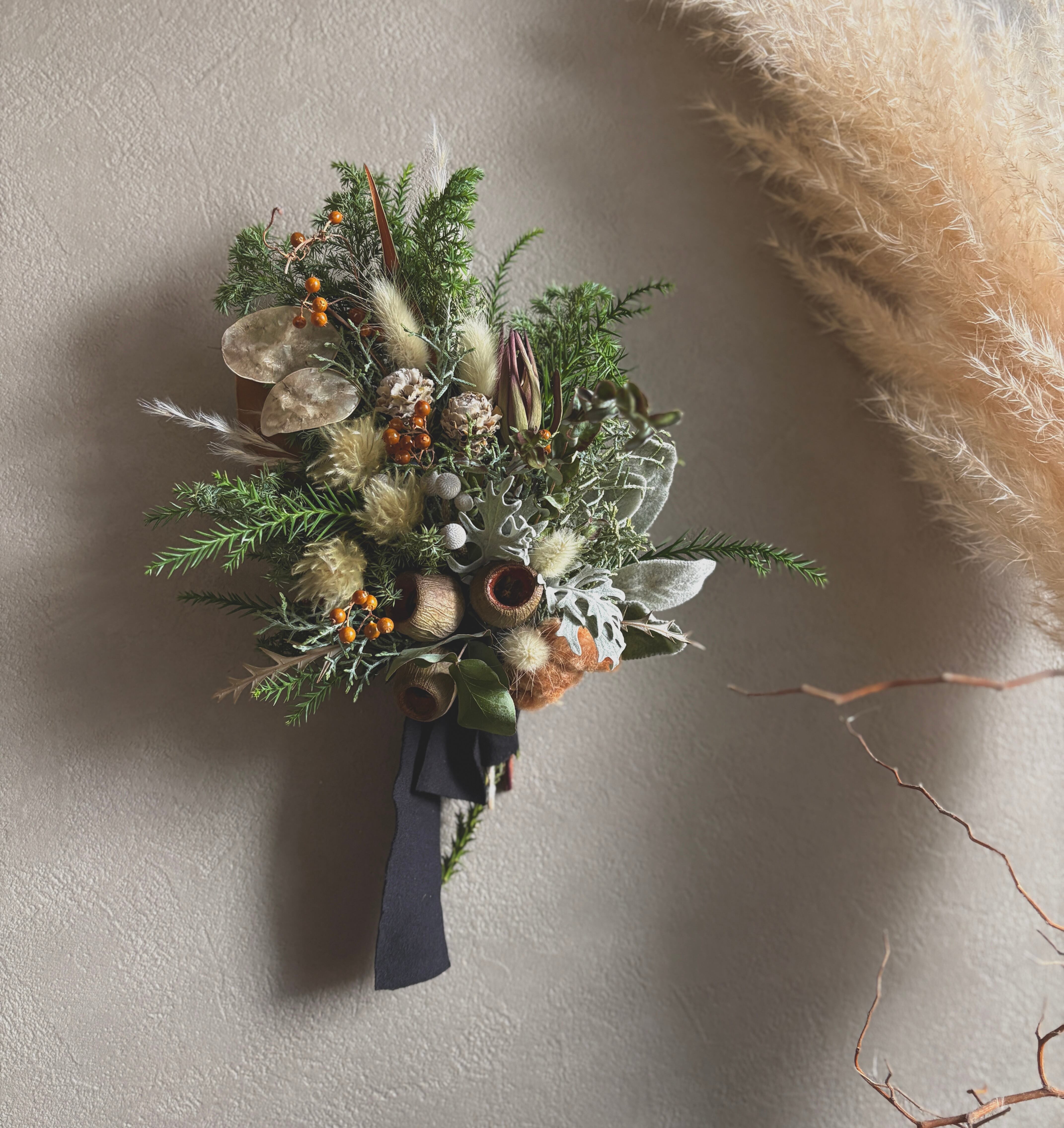コットンフラワー、ベルガムナッツ、ダスティンミラー、ヒムロスギ、ブルーアイス、リューカデンドロンなどを合わせ暖かい雰囲気に。