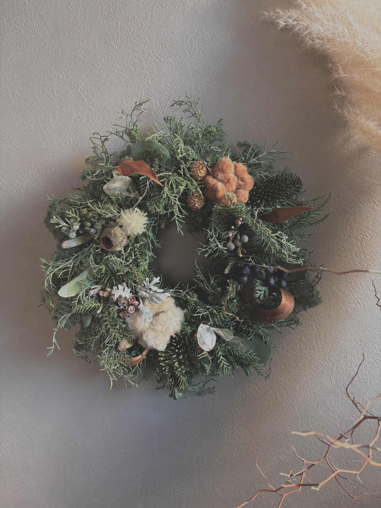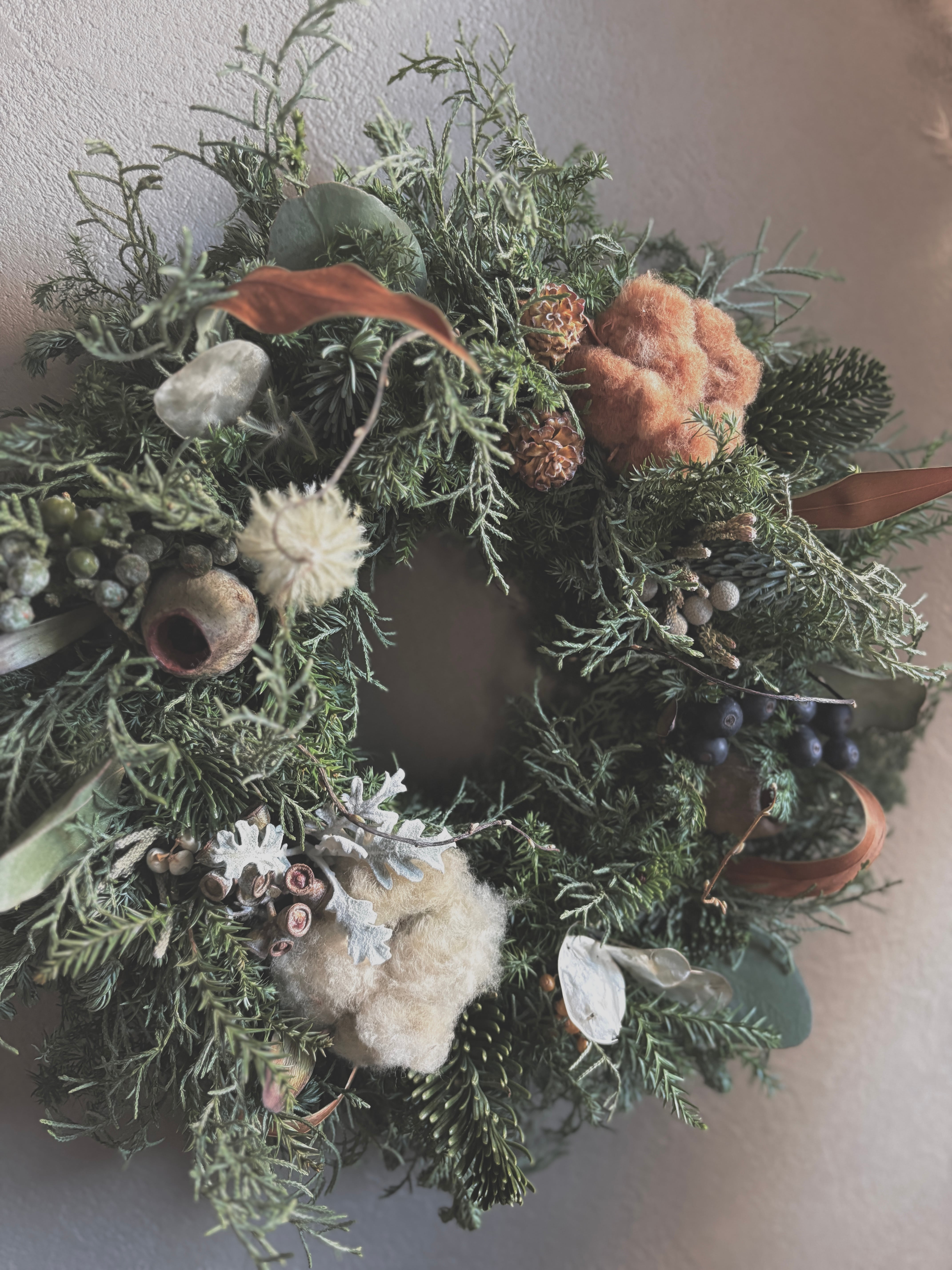 コットンフラワー、ベルガムナッツ、リューカデンドロン、ヒャリンバイ、ヒムロスギなど季節感ある草花をたっぷりと使い、暖かみのある落ち着いた色味のリースにしました。