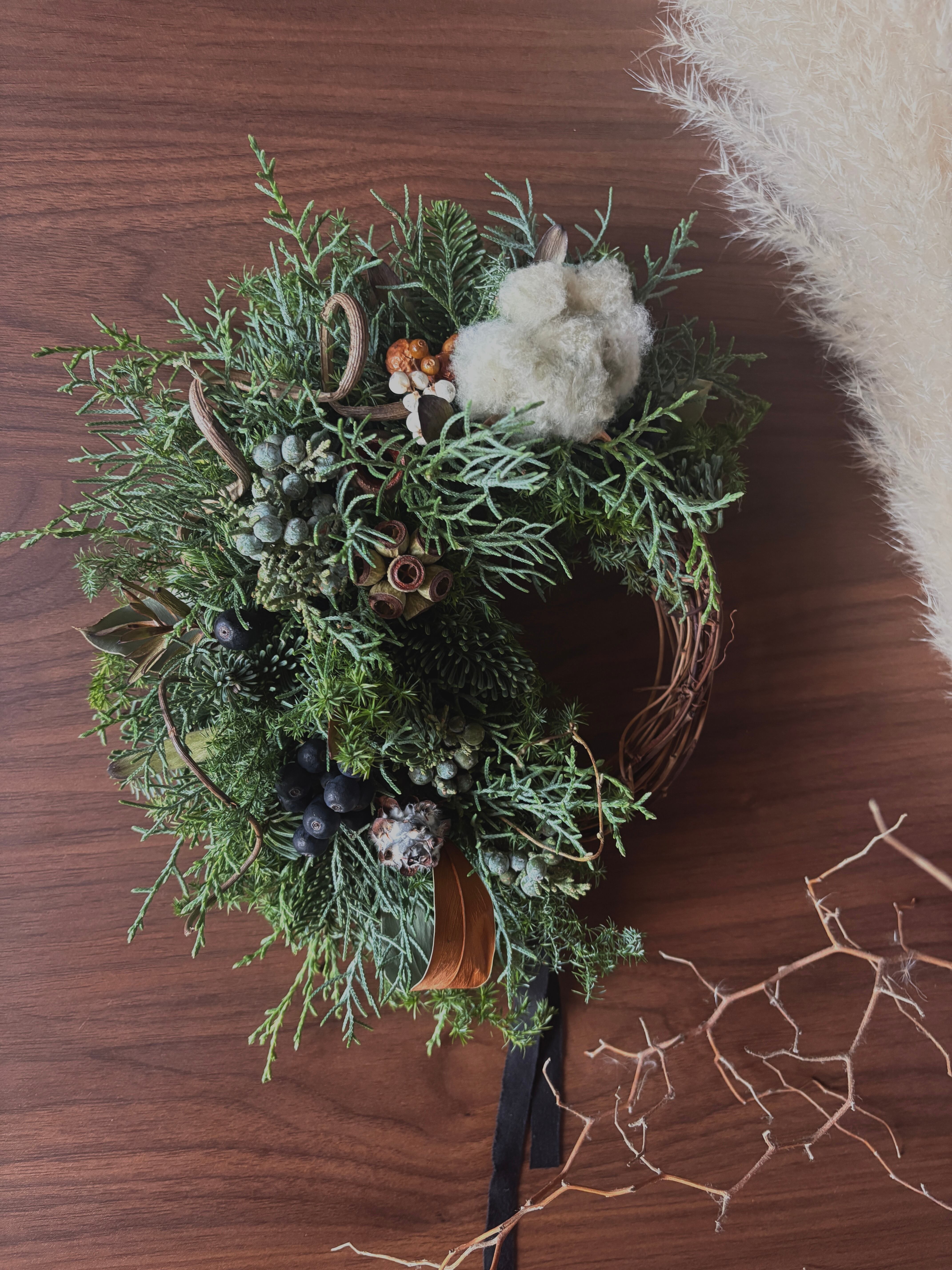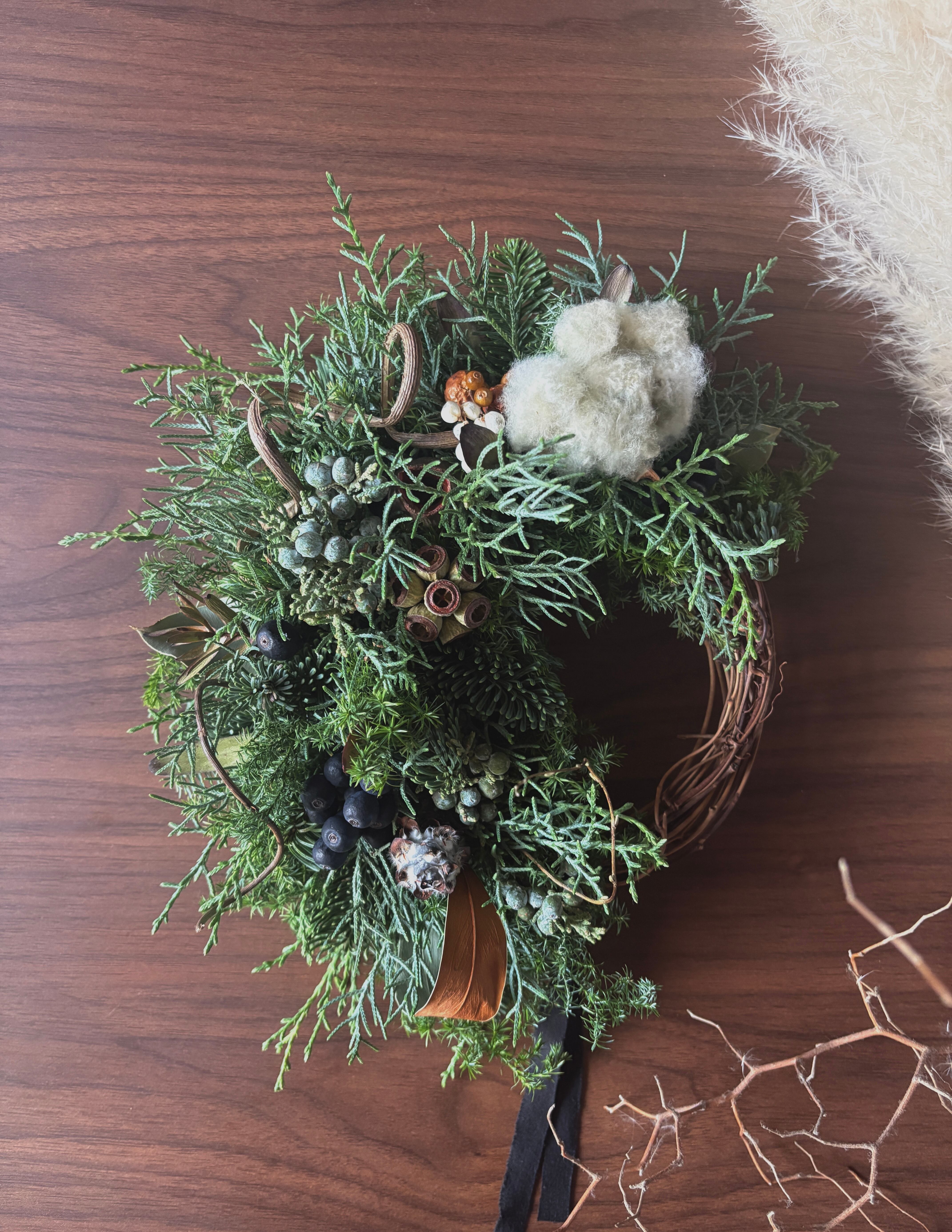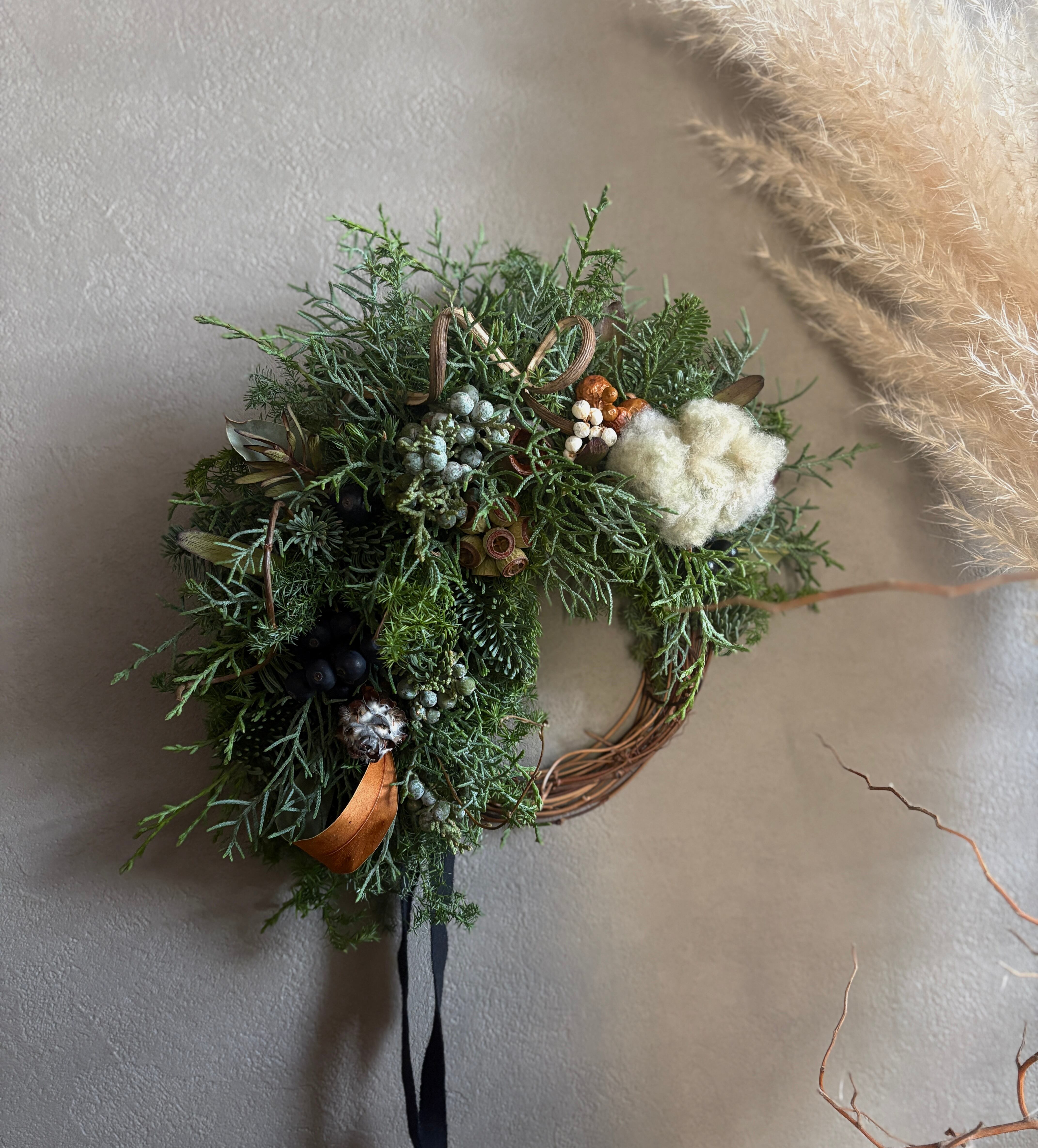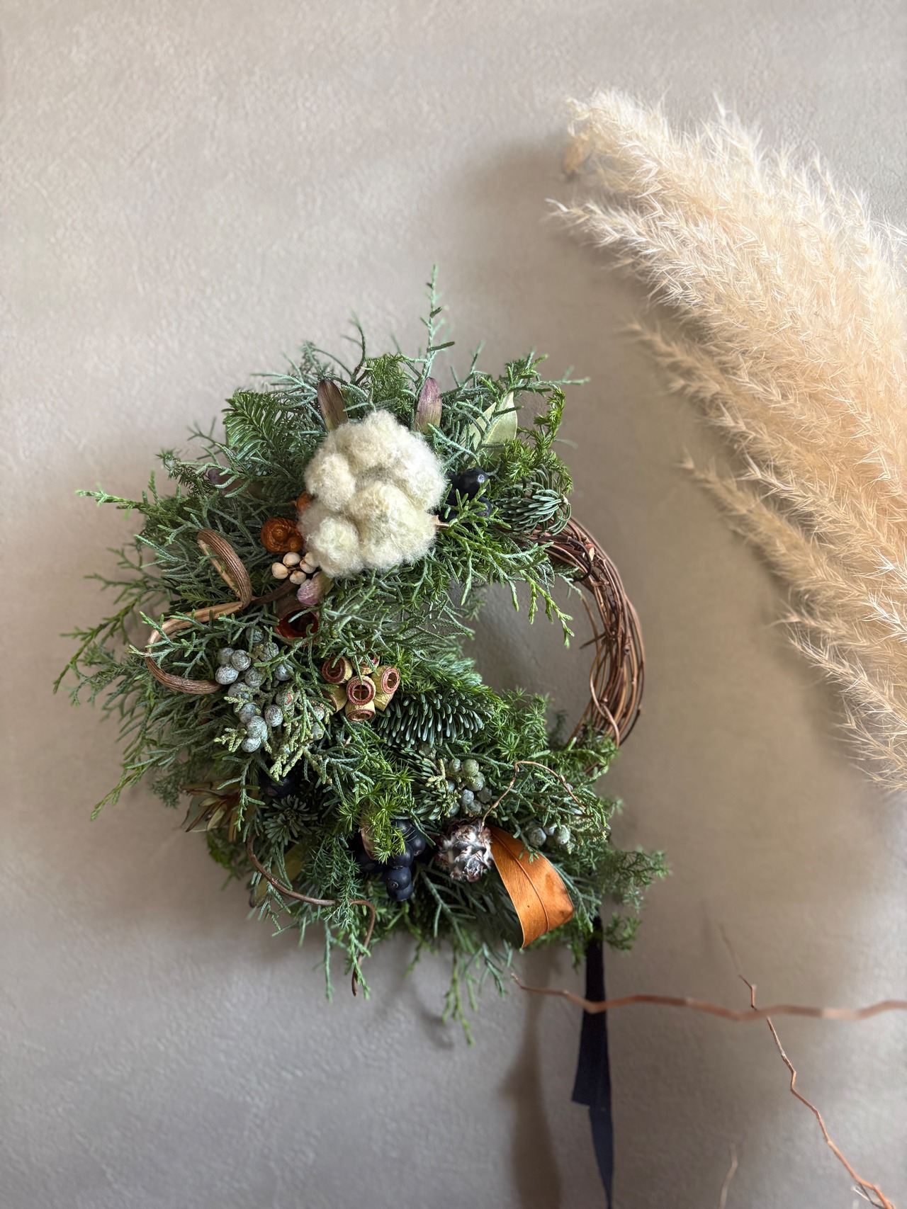 針葉樹のグリーンをベースにコットンフラワー、ベルガムナッツ、ユーカリ、季節の実などを合わせ、落ち着いた色味のハーフリースです。
