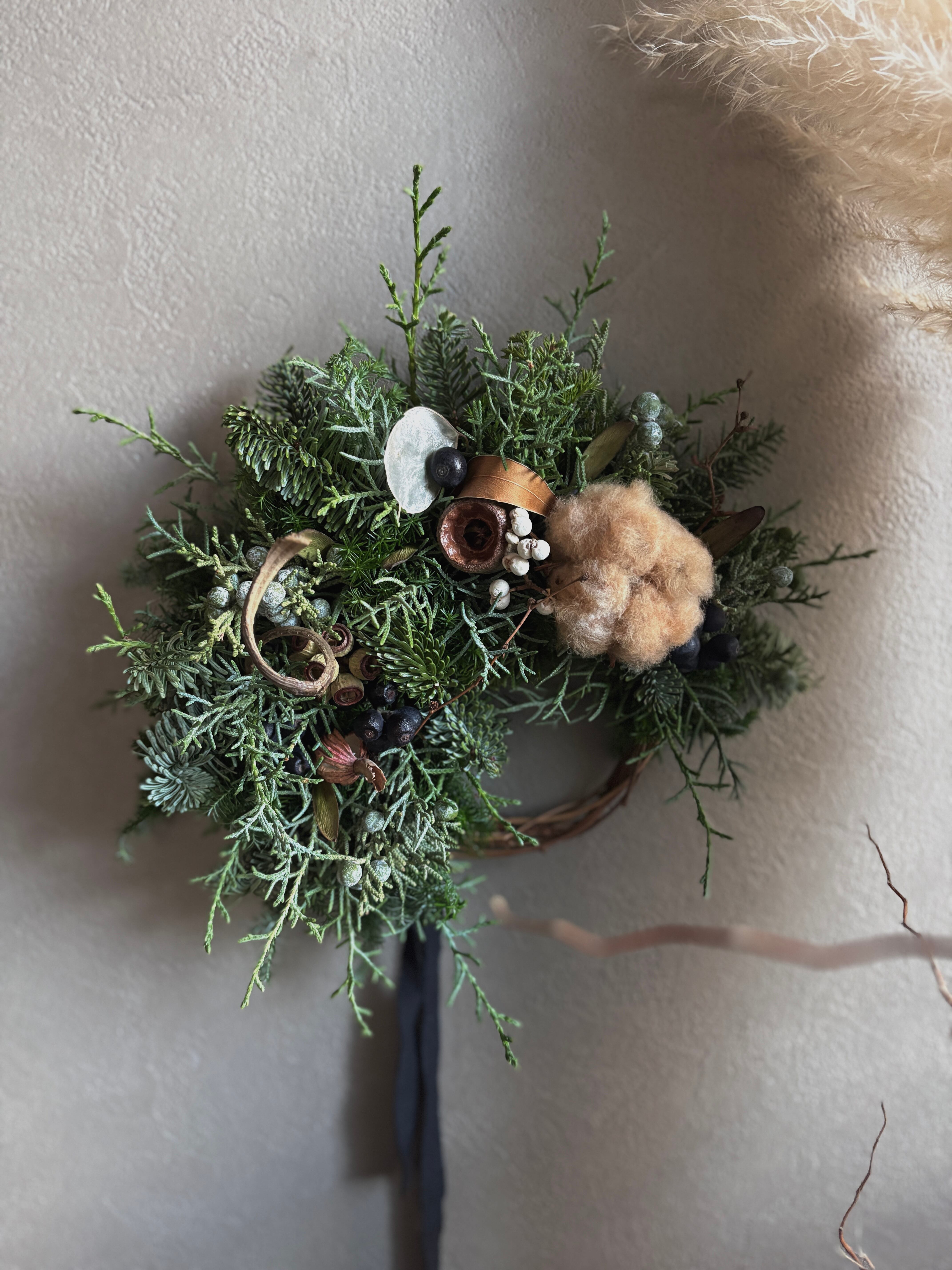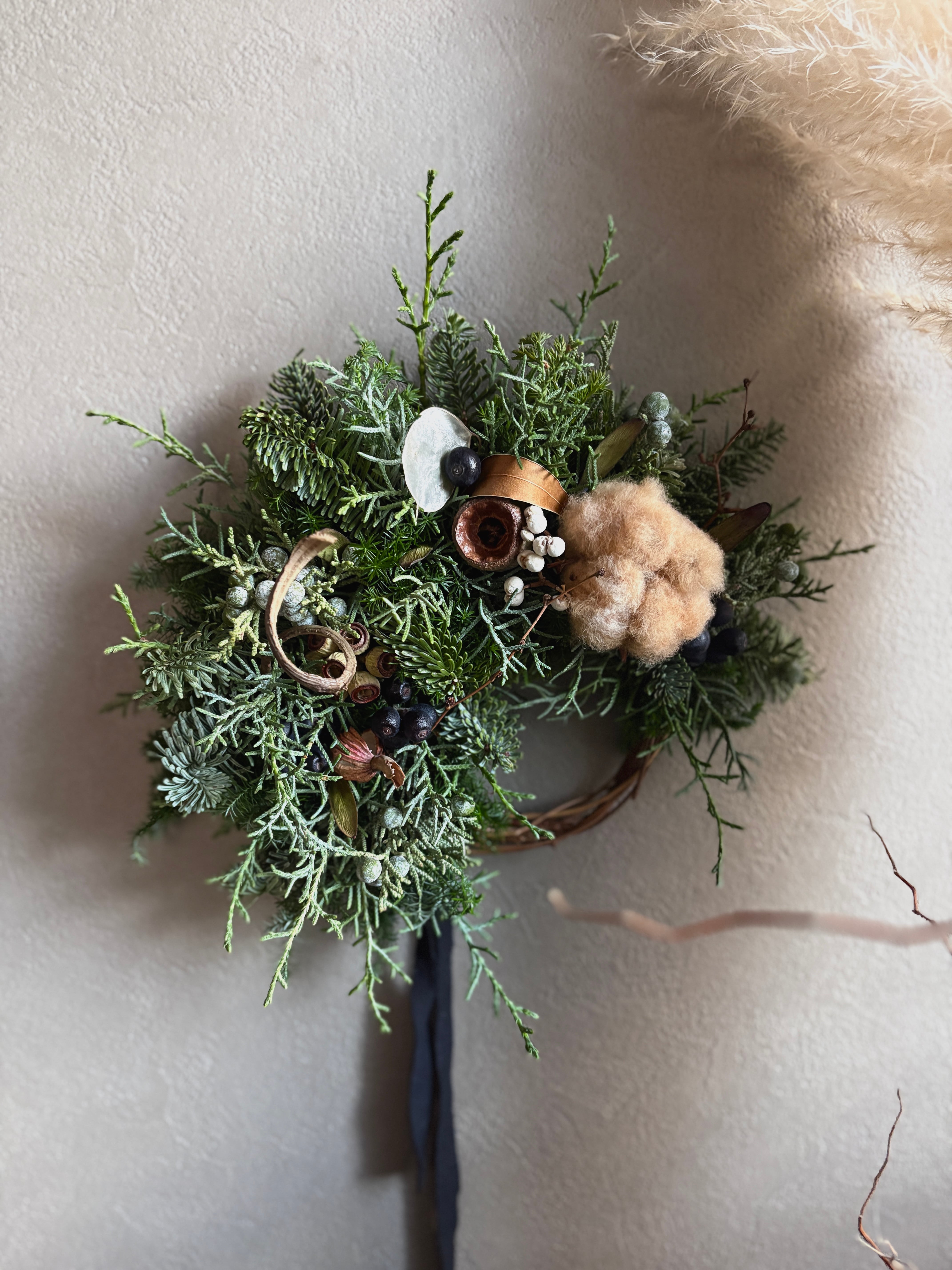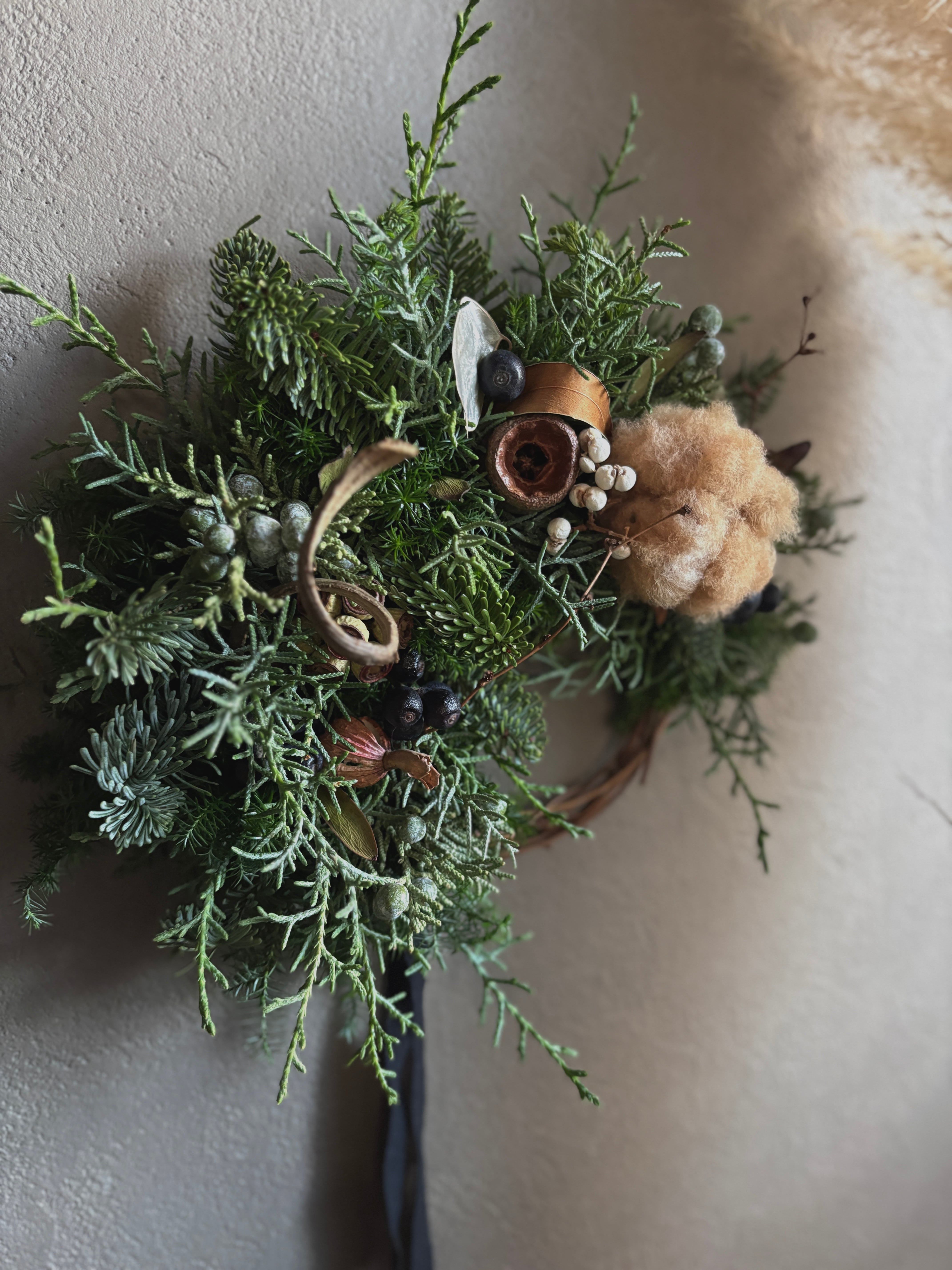 針葉樹のグリーンをベースにコットンフラワー、ベルガムナッツ、季節の実などを合わせた落ち着いた色味のハーフリースです。