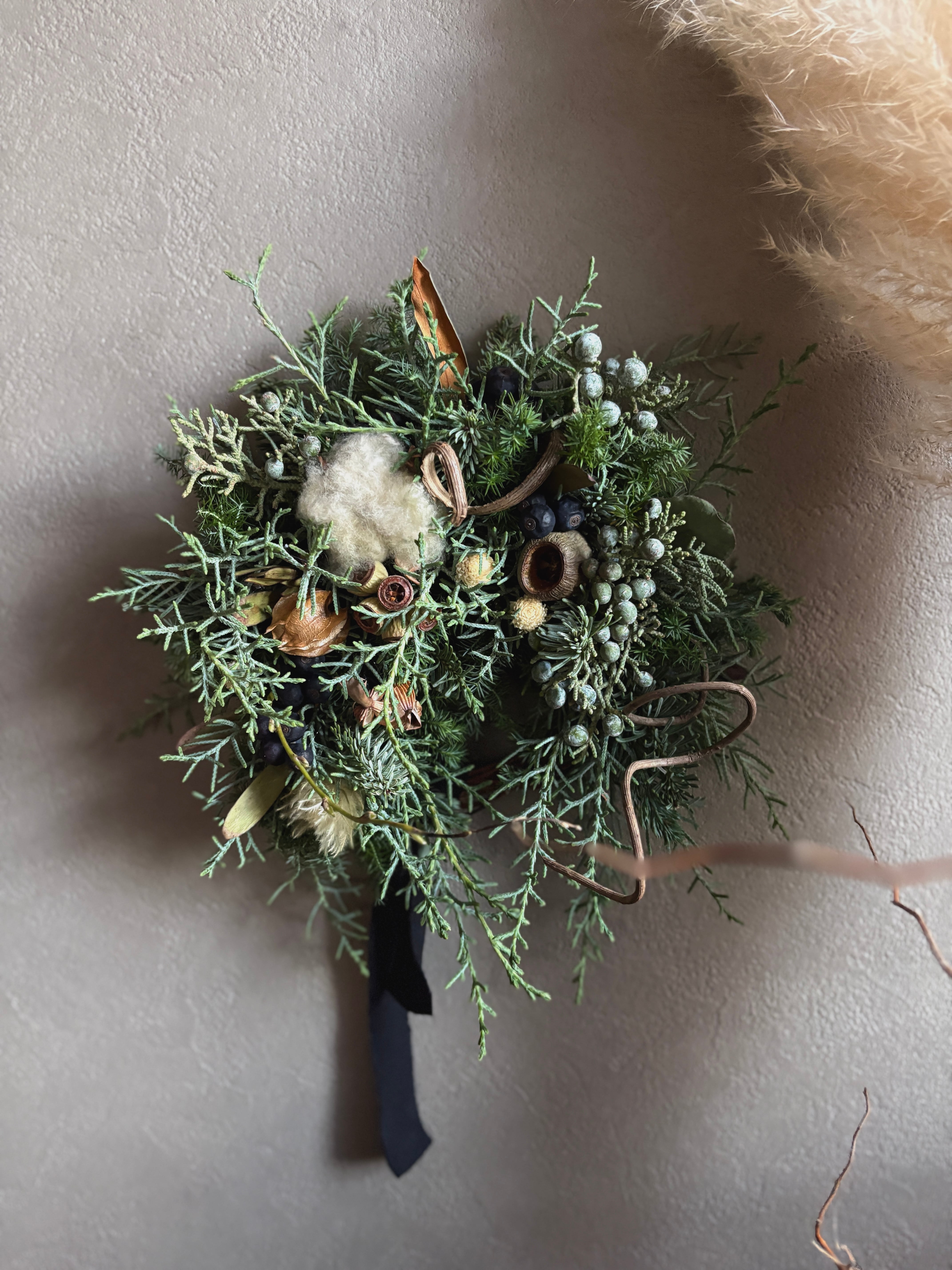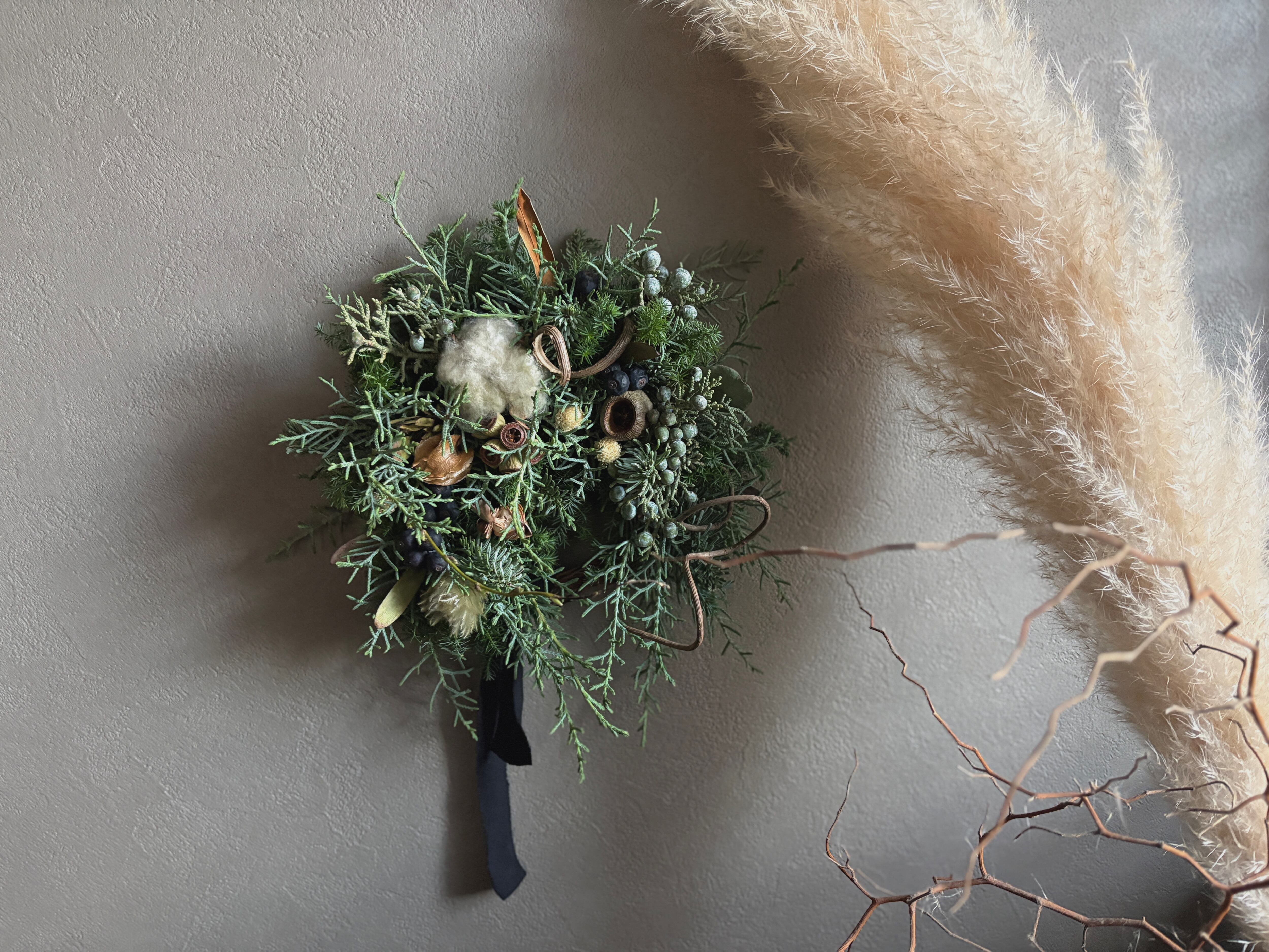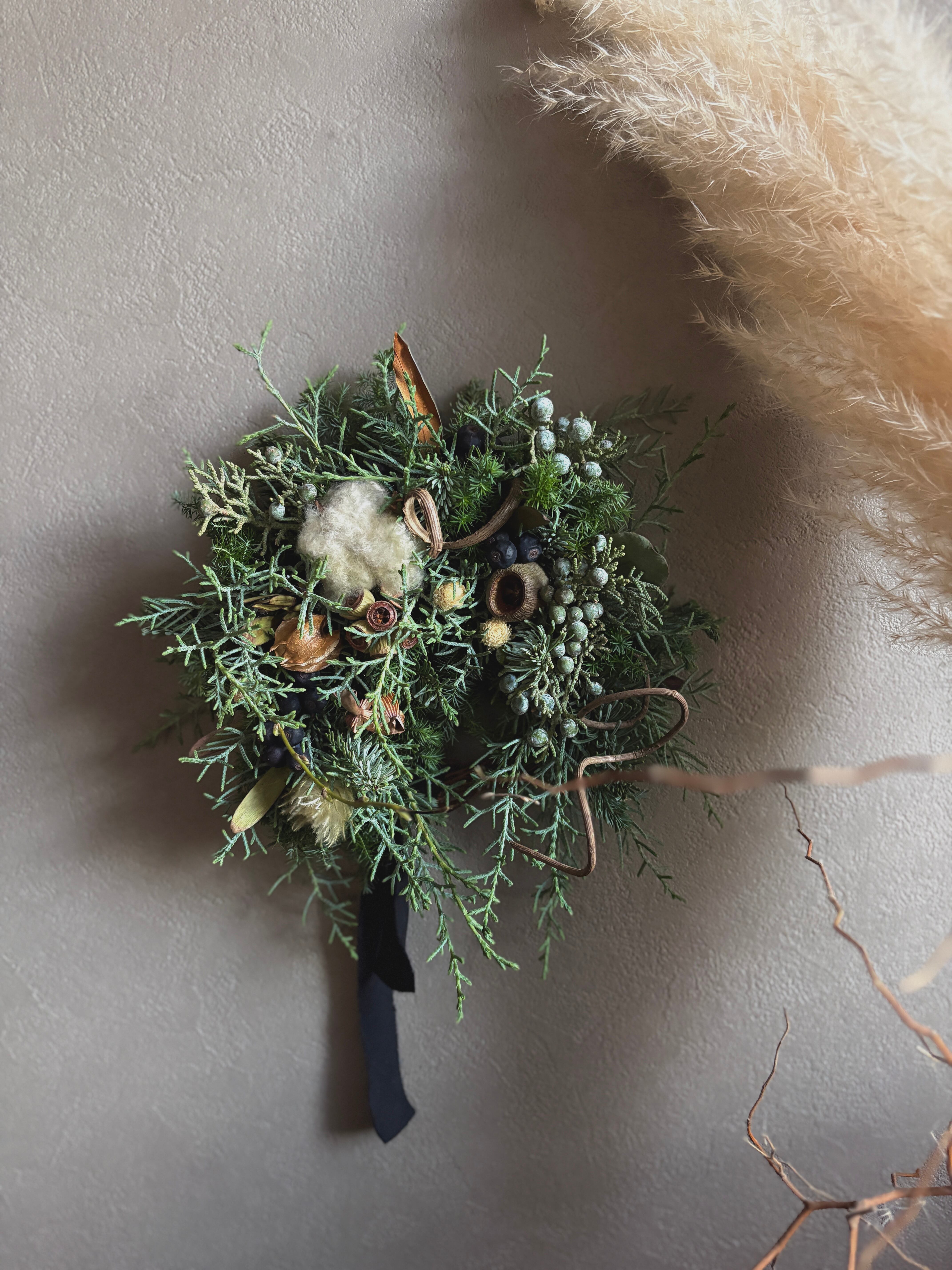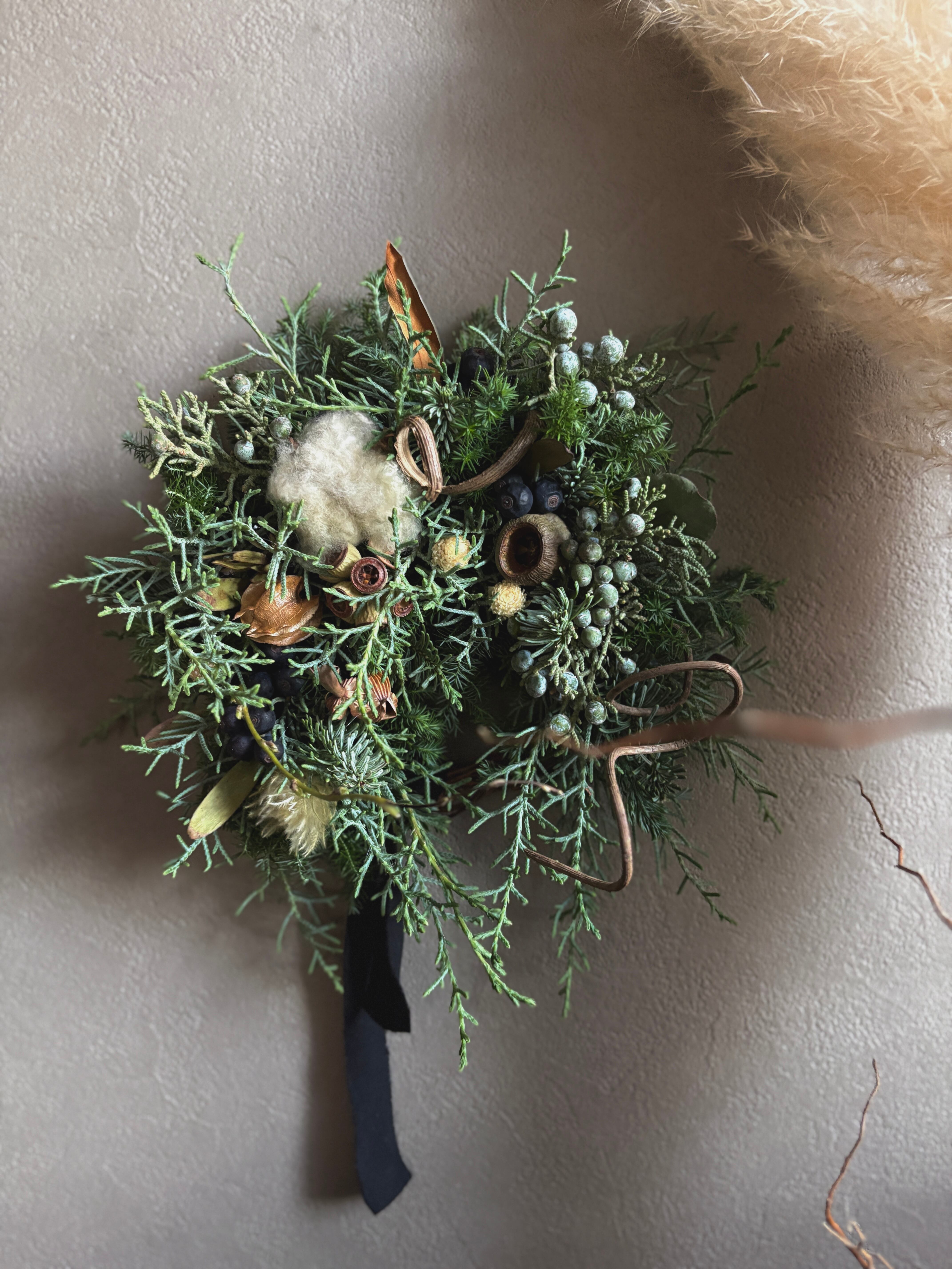 ブルーアイス、ヒムロスギなど針葉樹のグリーンをベースにコットンフラワー、ベルガムナッツなどを合わせた落ち着いた色味のハーフリースです。