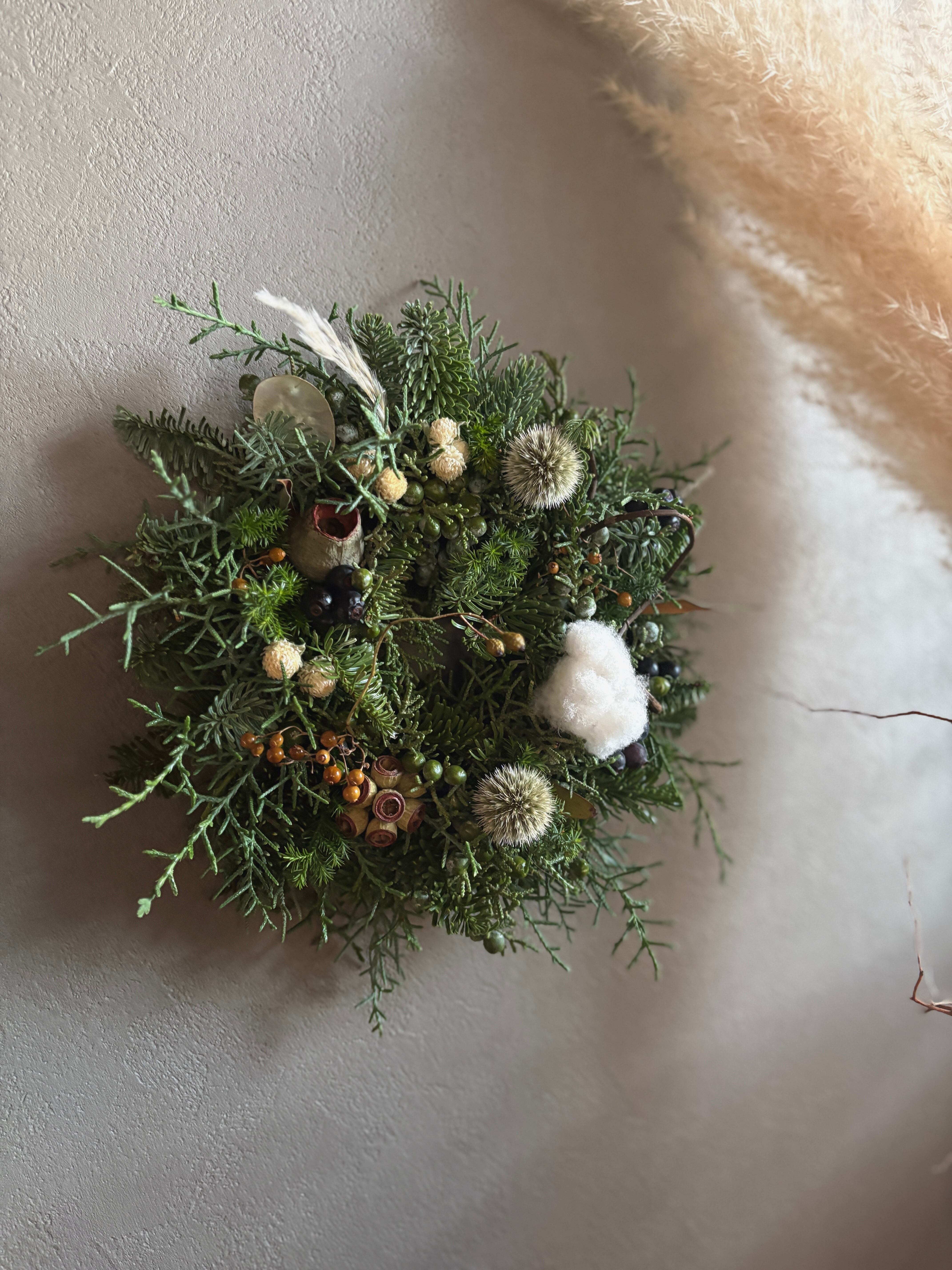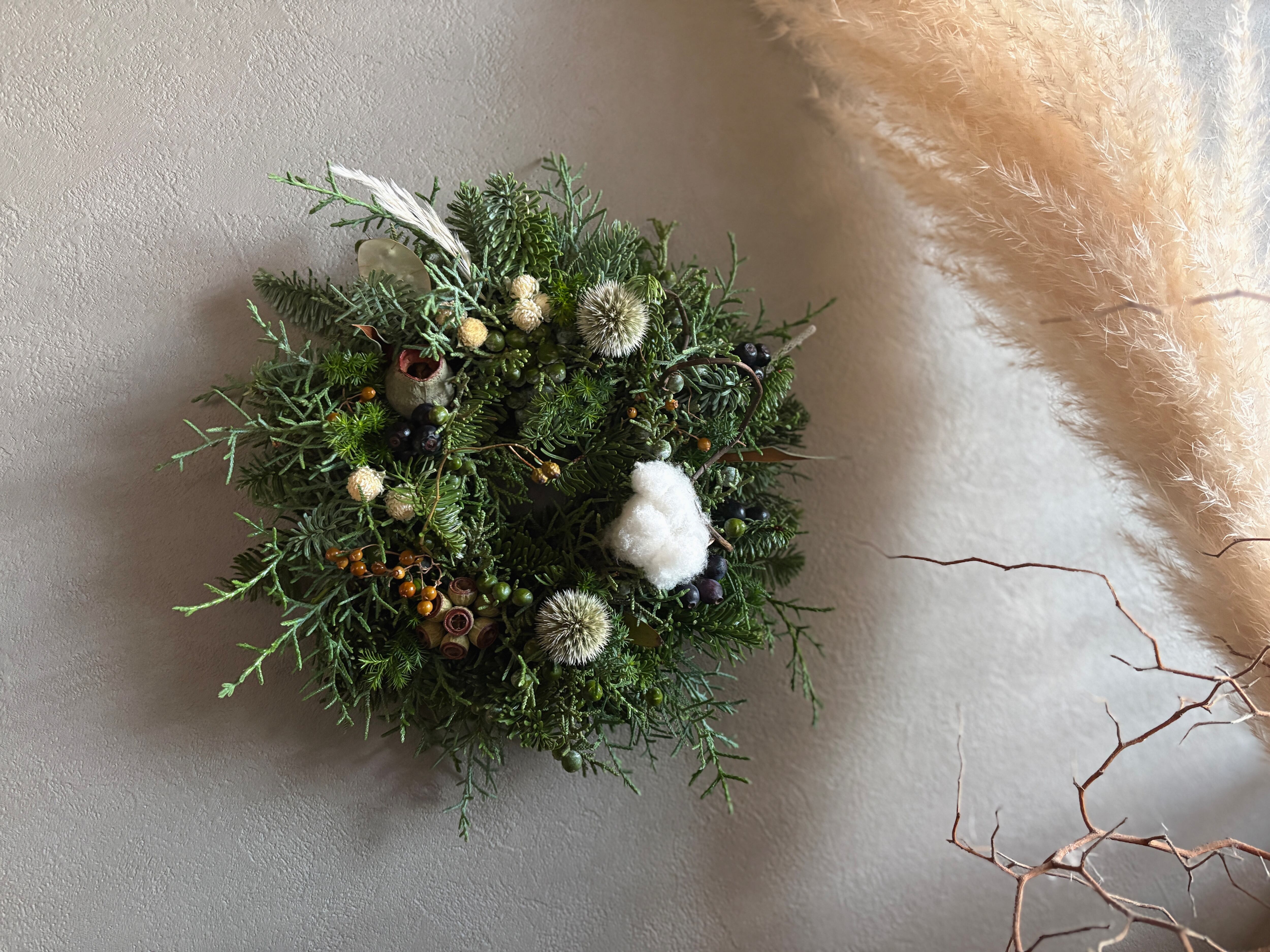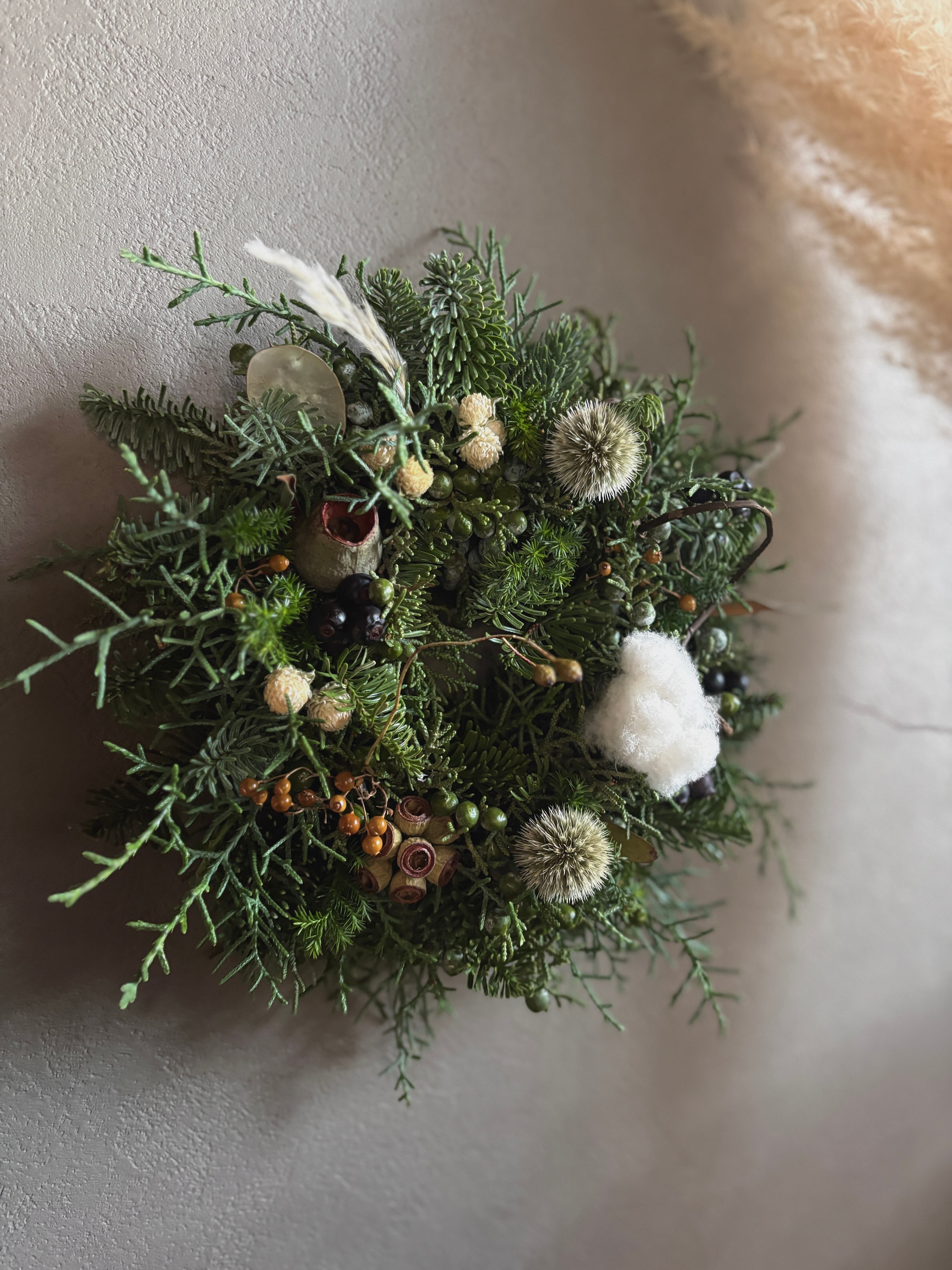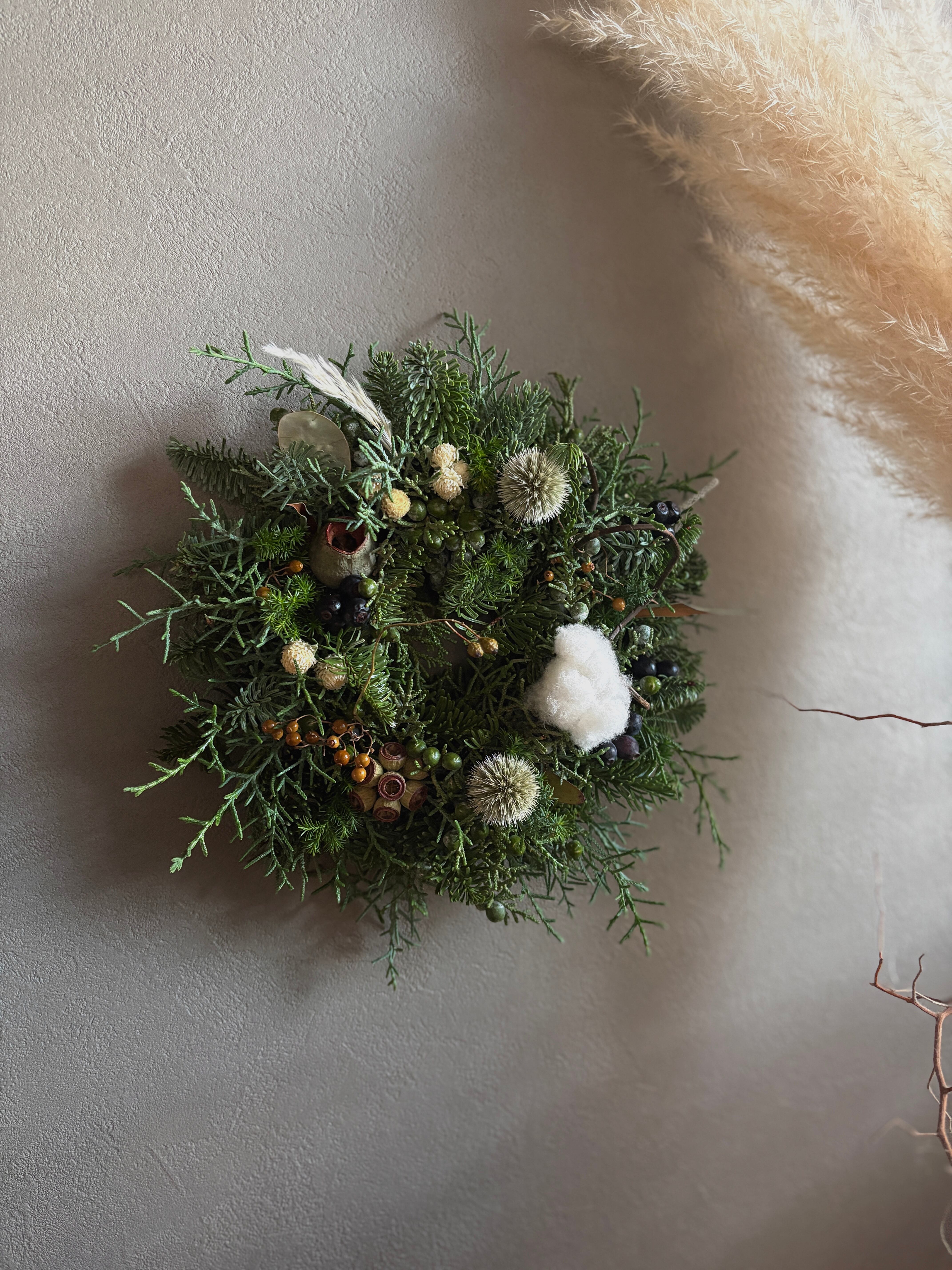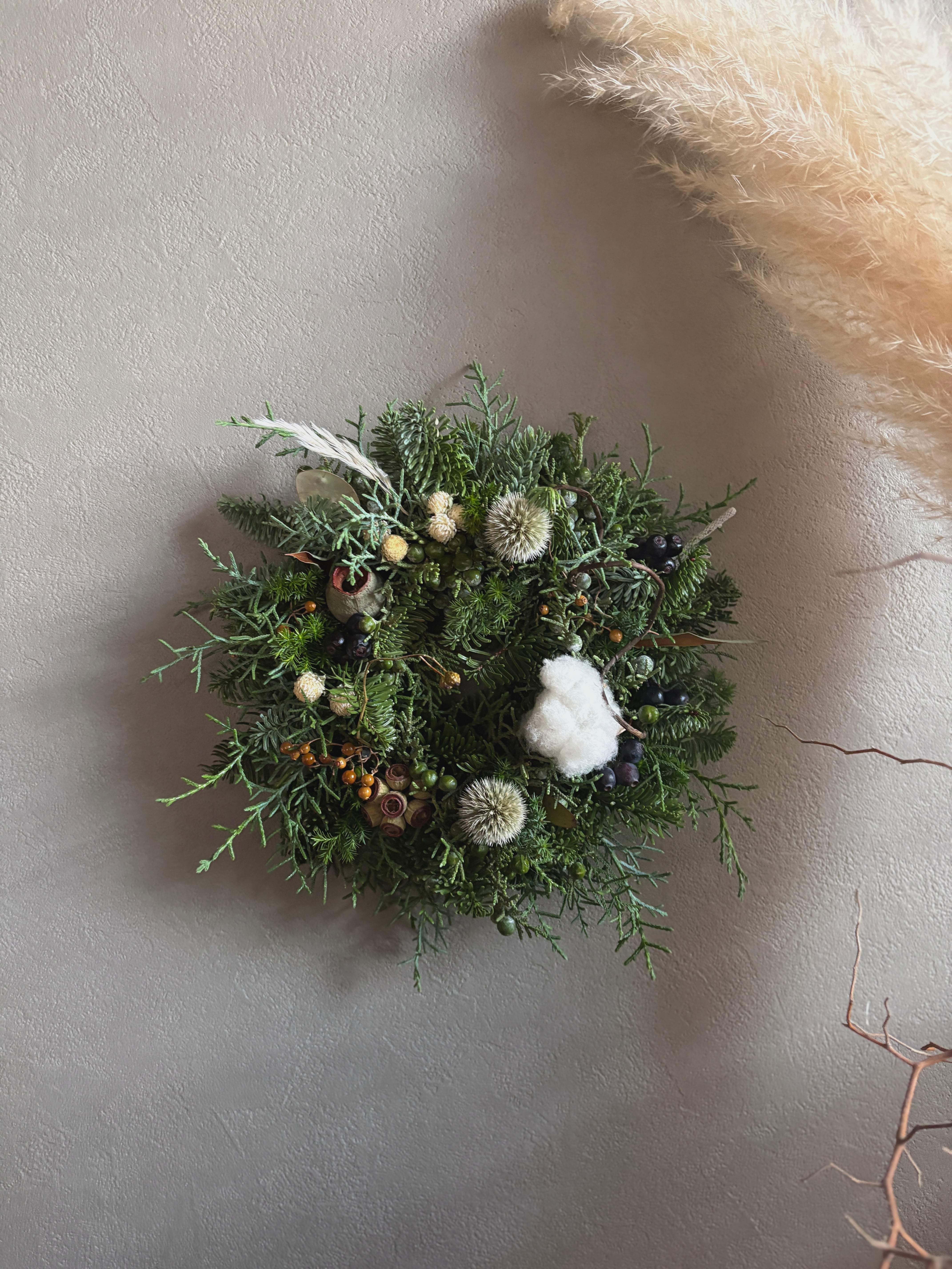 ブルーアイス、ヒムロスギ、モミの木などの針葉樹グリーンをベースに、ベルガムナッツ、コットンフラワー、シャリンバイ、瑠璃玉アザミなど季節感ある草花をたっぷりと使い、暖かみのあるリースにしました。