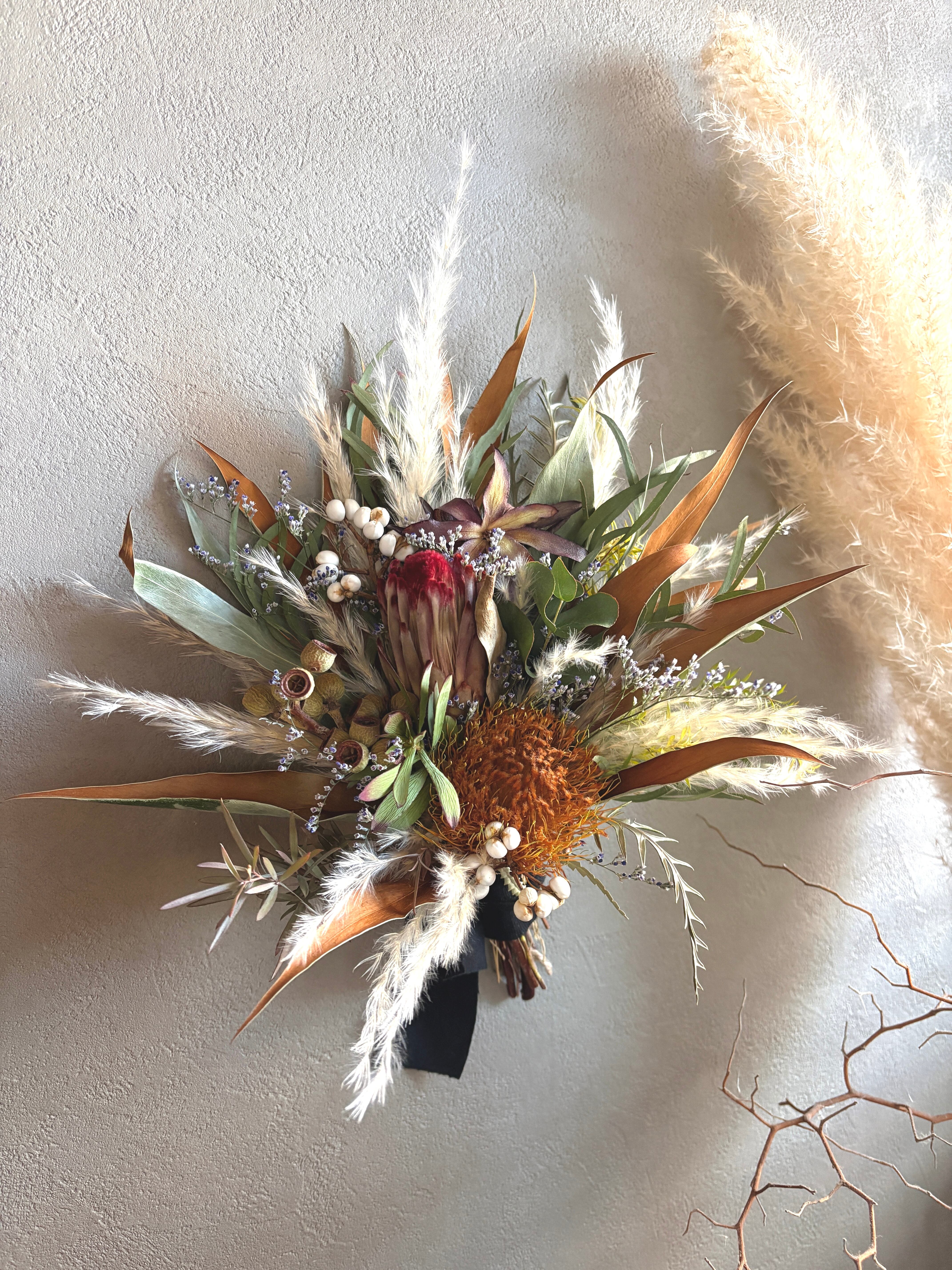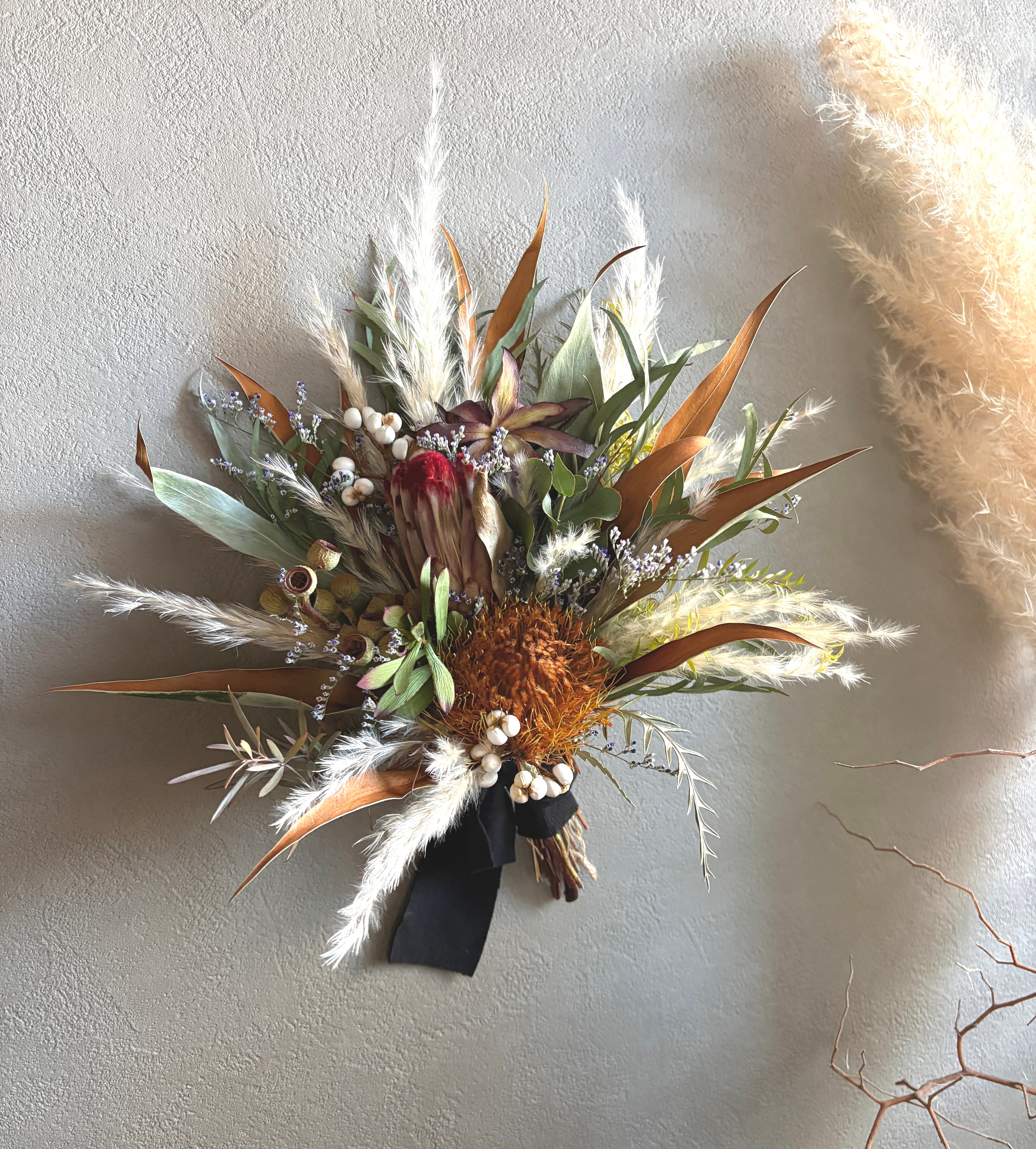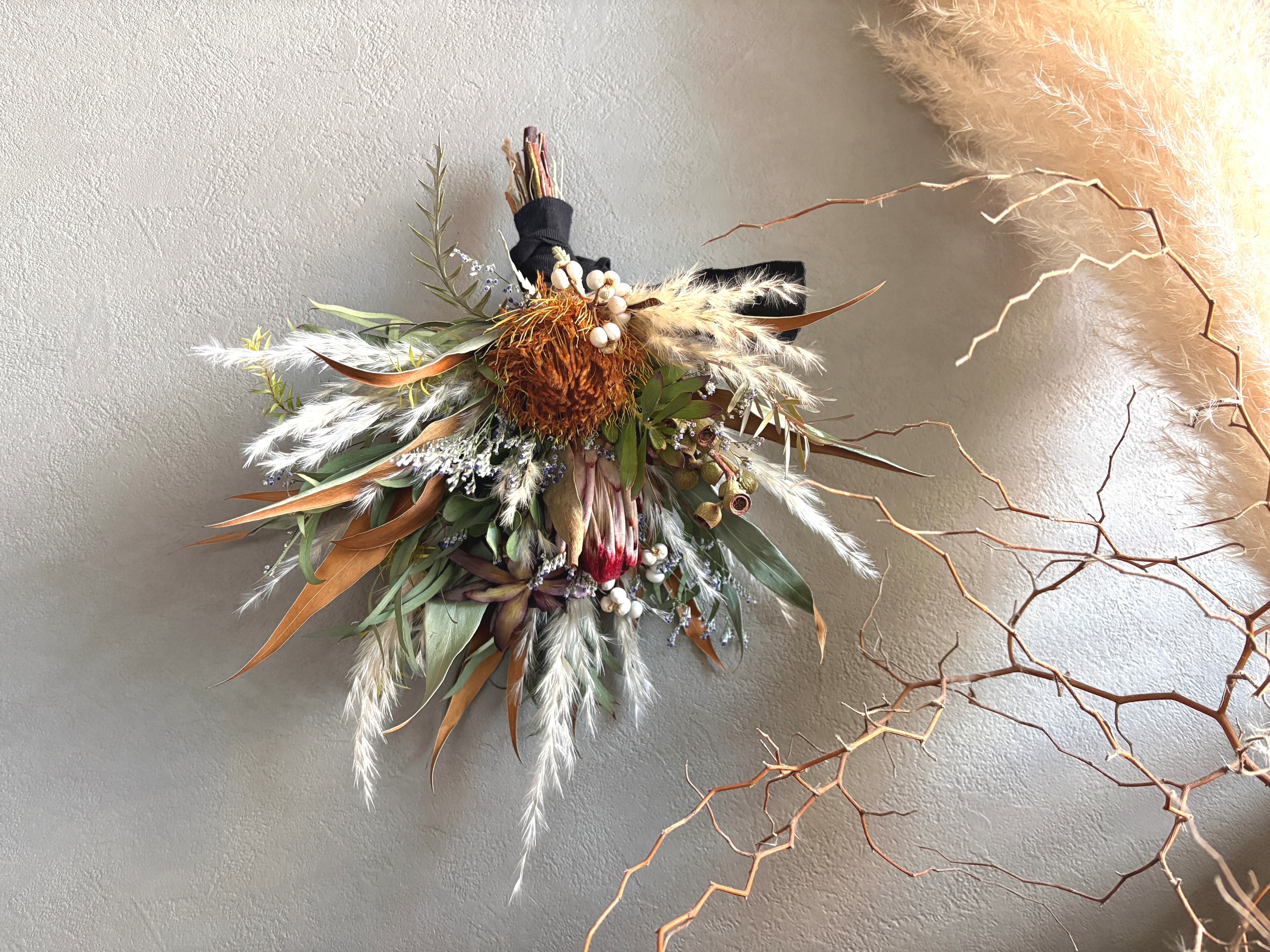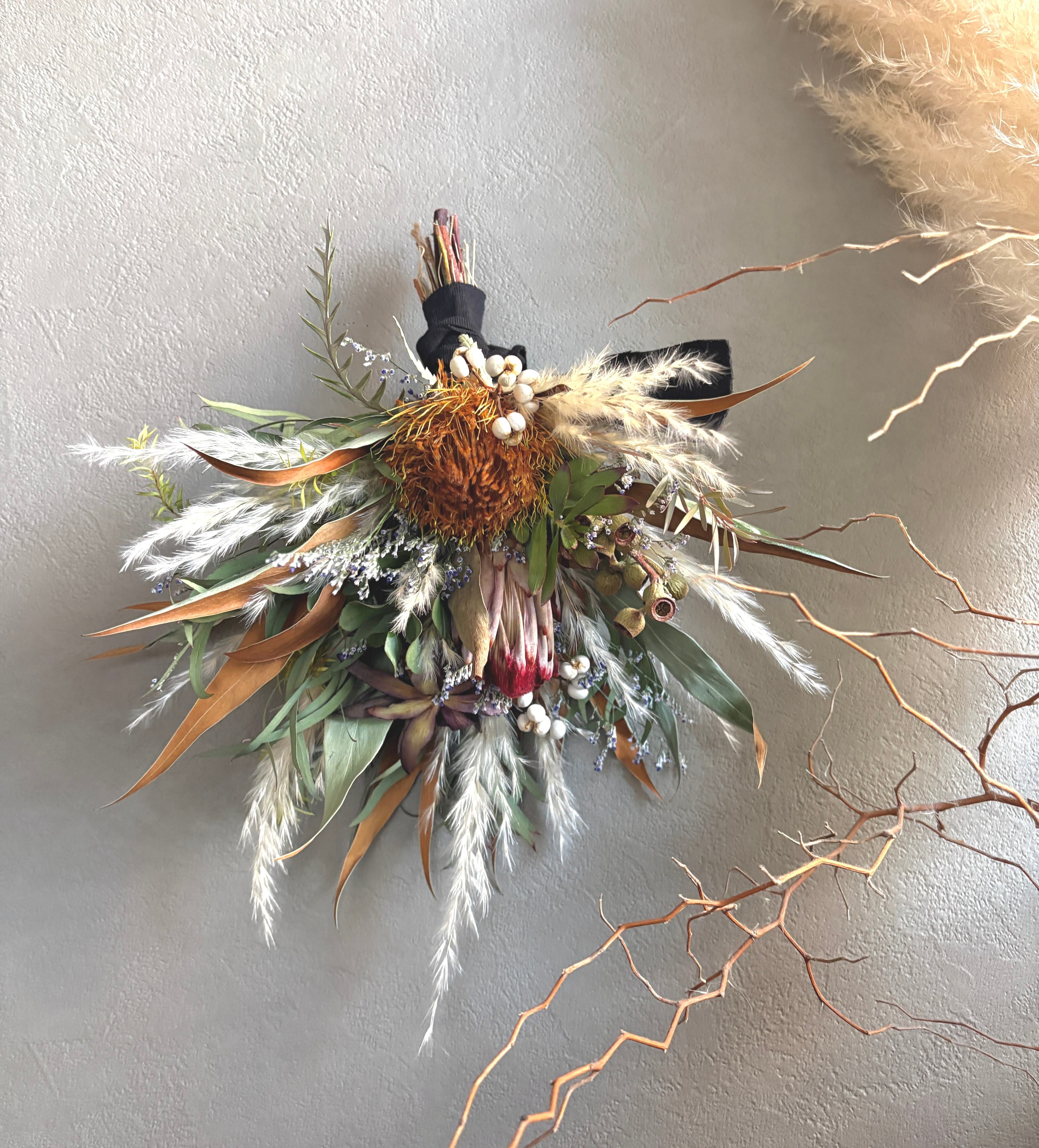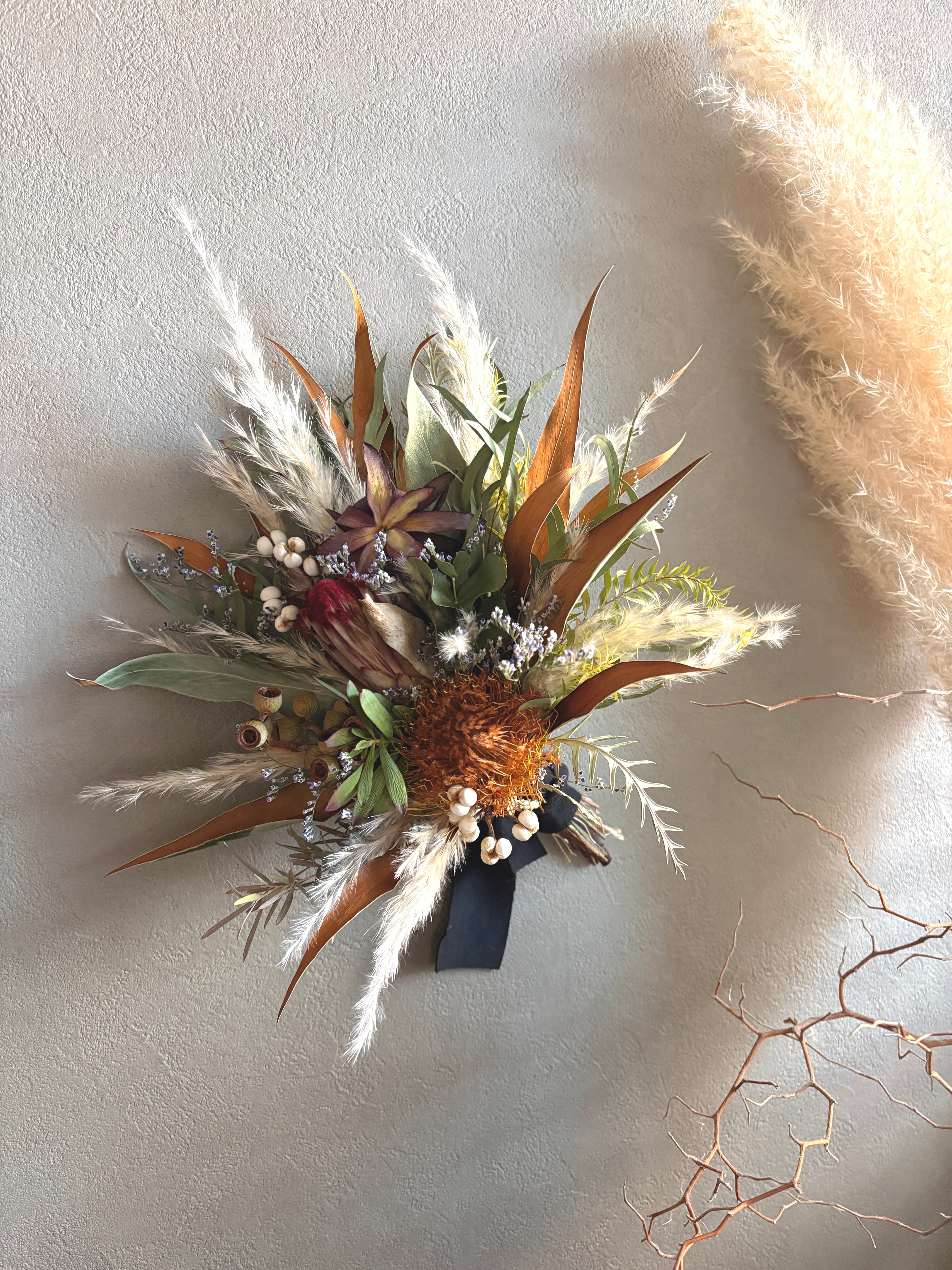 ふわふわのパンパスグラスにプロテア、フォルモーサ、グレビレアゴールド、リューカデンドロン、アンバーナッツなどネイティブプランツを束ね、暖かみのあるスワッグに仕上げました。