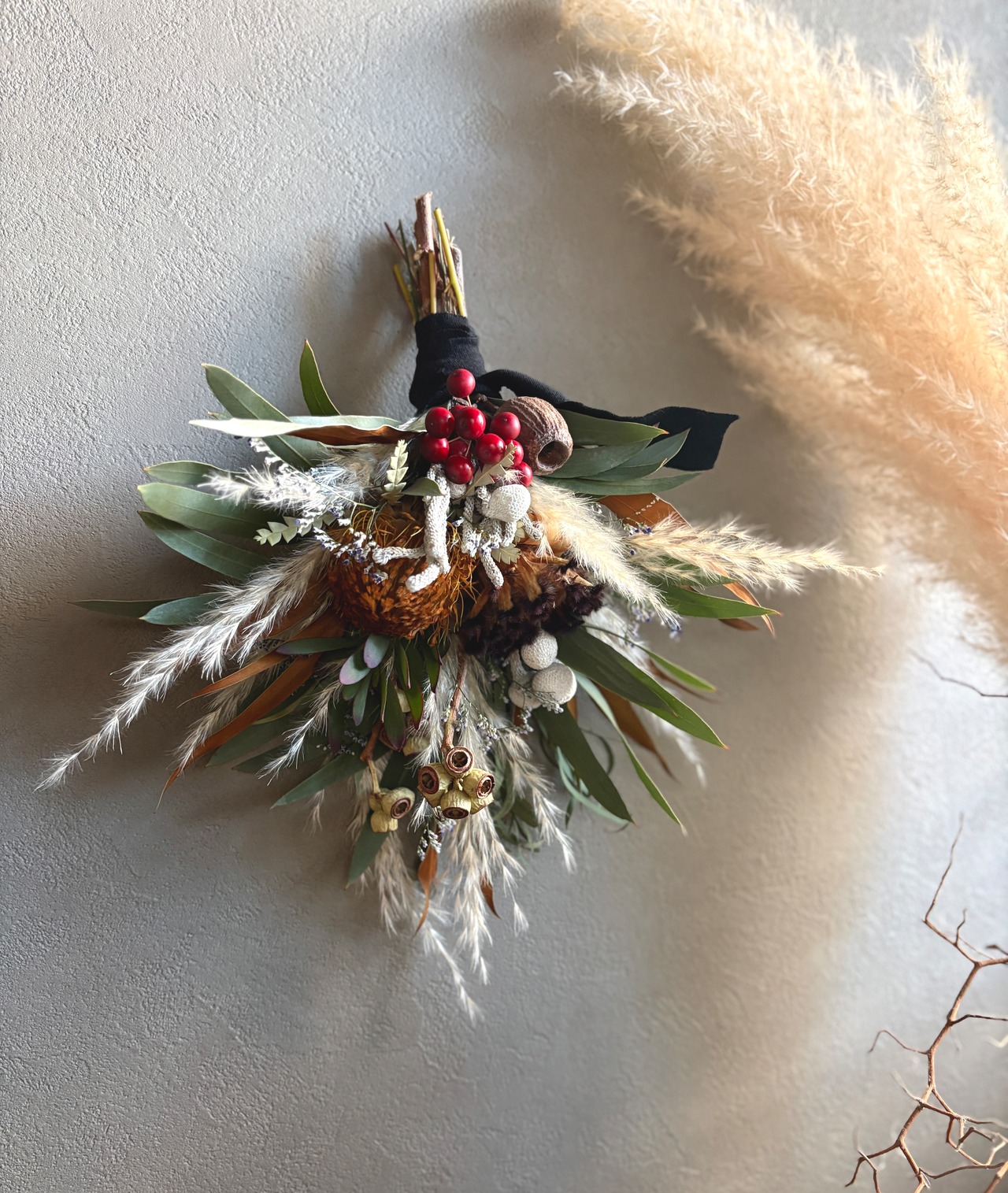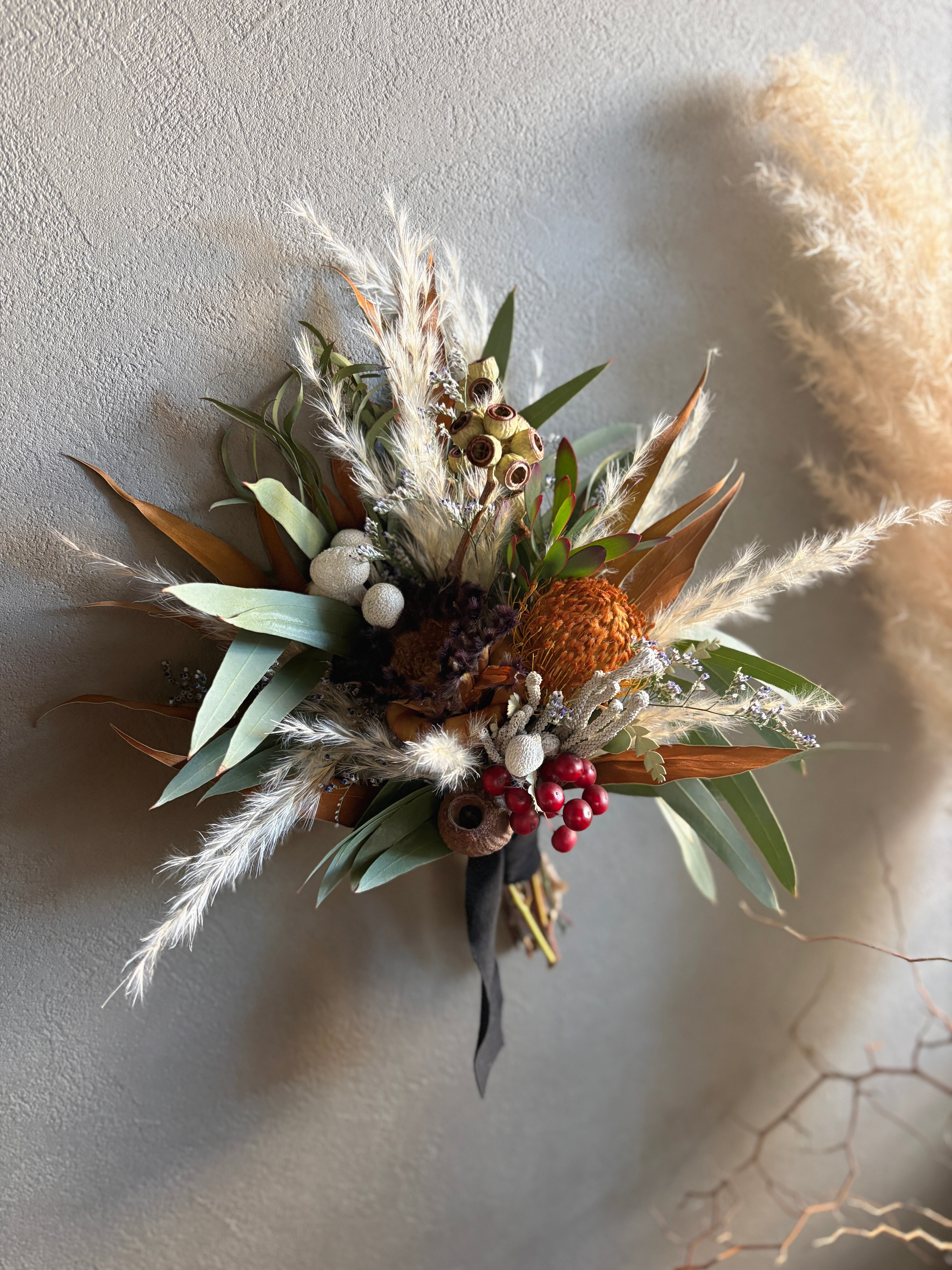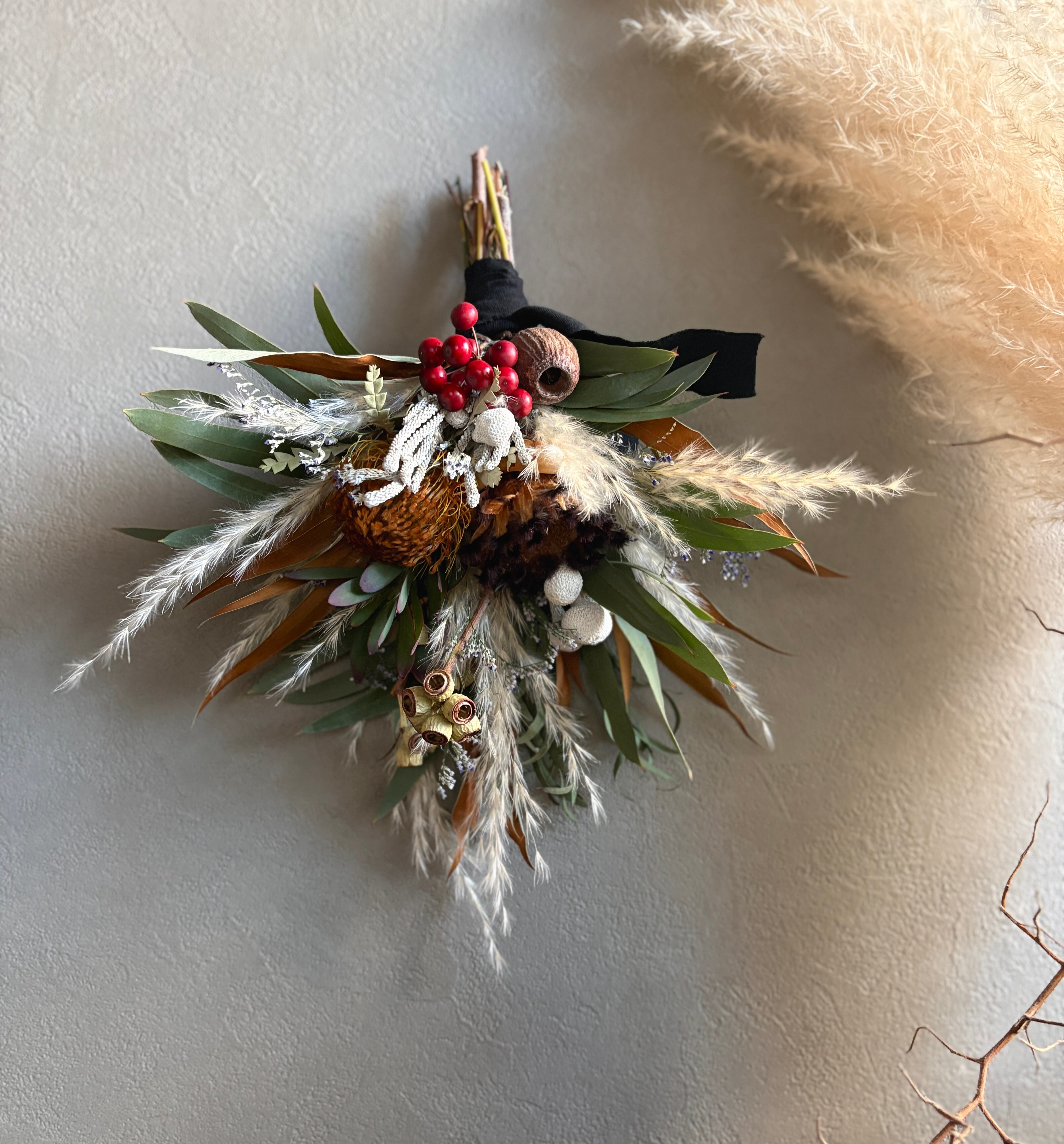 リューカデンドロン、グレビレアゴールド、ベルガムナッツ、アンバーナッツ、ブルニアなどネイティブフラワーをたっぷり束ねました。サンキライも添えて季節感のあるスワッグに仕上げました。