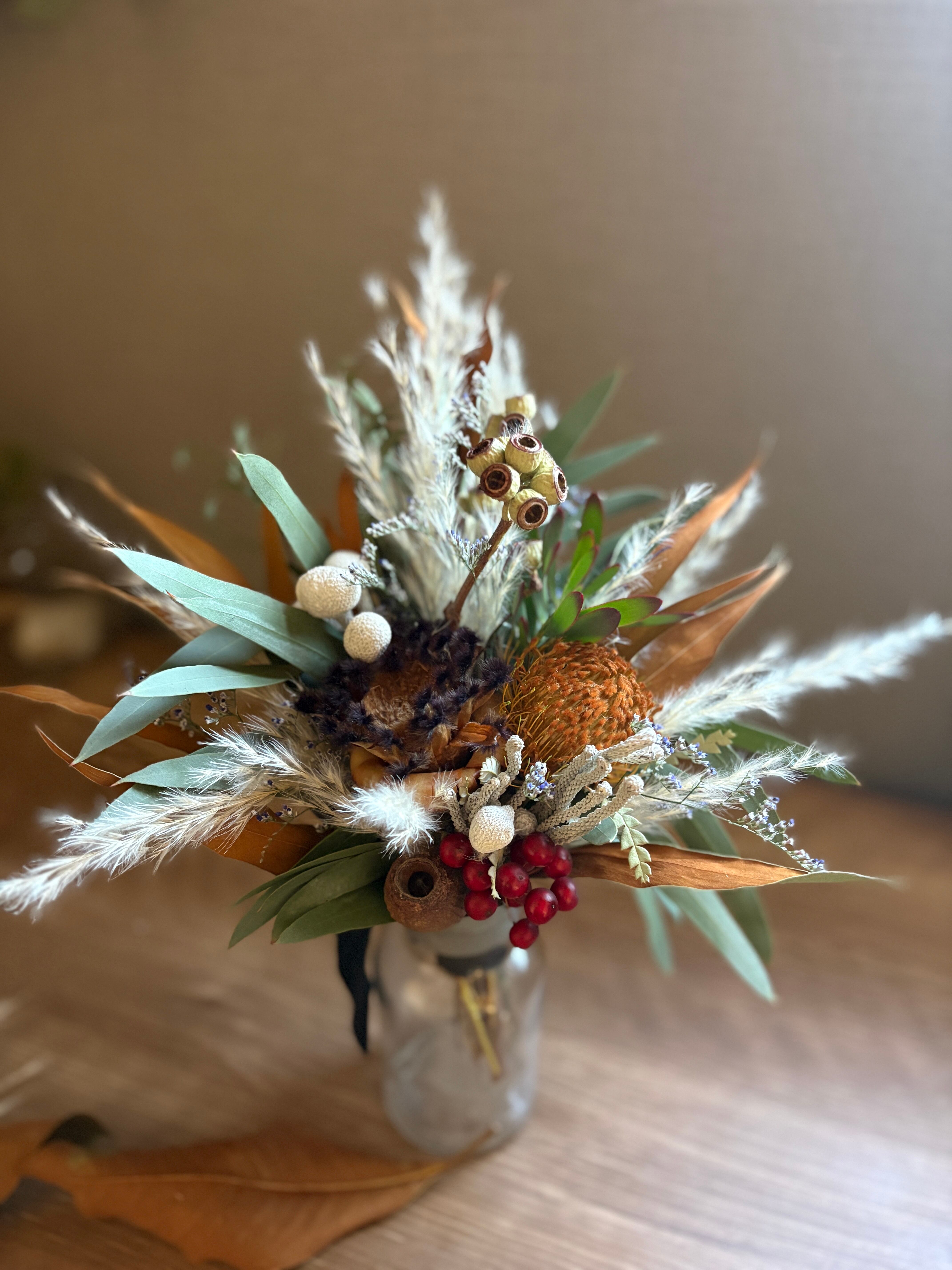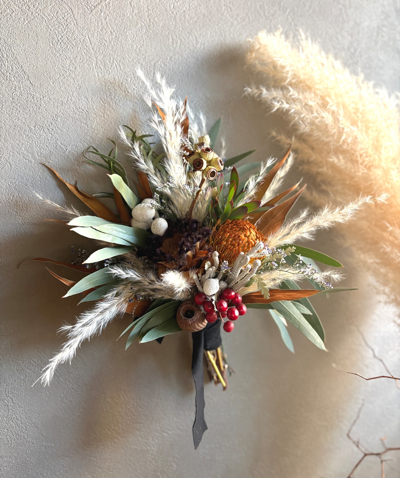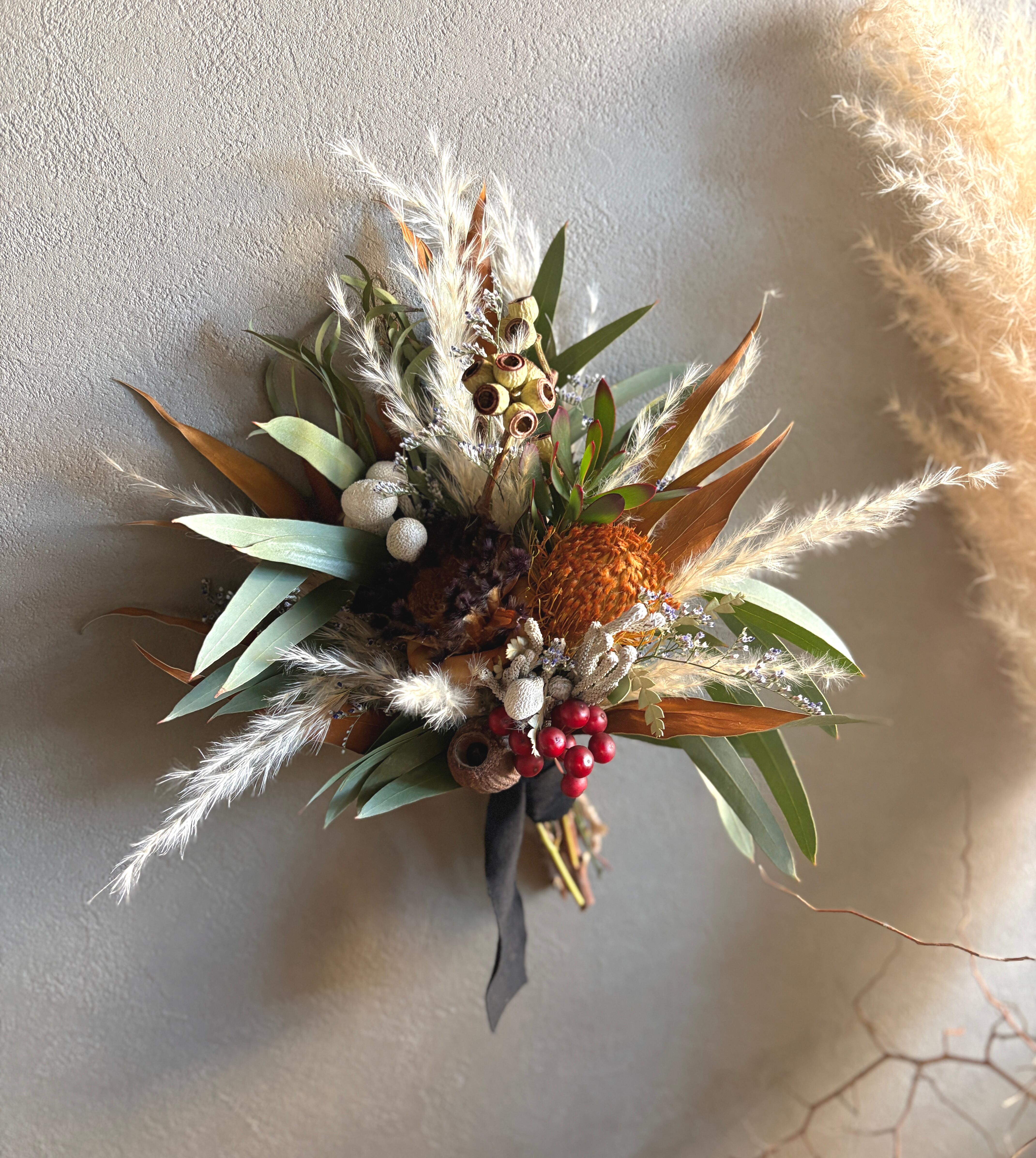 リューカデンドロン、グレビレアゴールド、ベルガムナッツ、アンバーナッツ、ブルニアなどネイティブフラワーをたっぷり束ねました。サンキライも添えて季節感のあるスワッグに仕上げました。