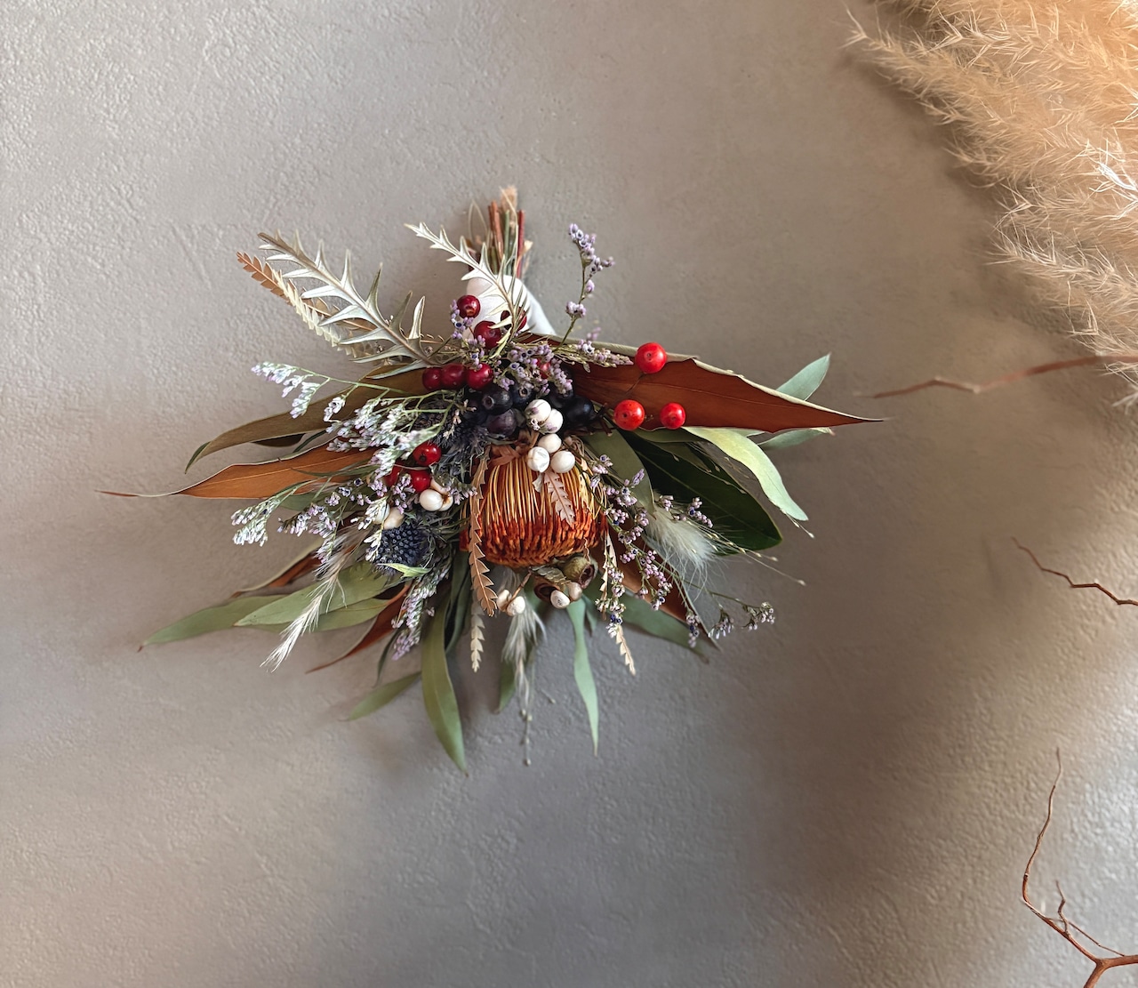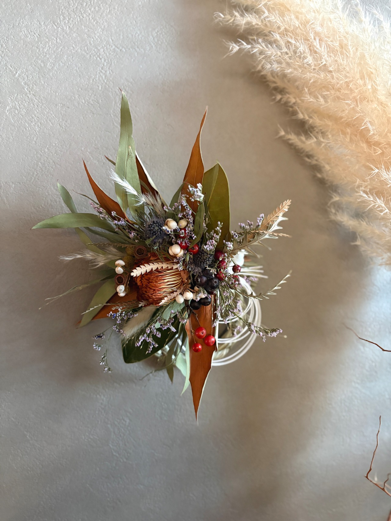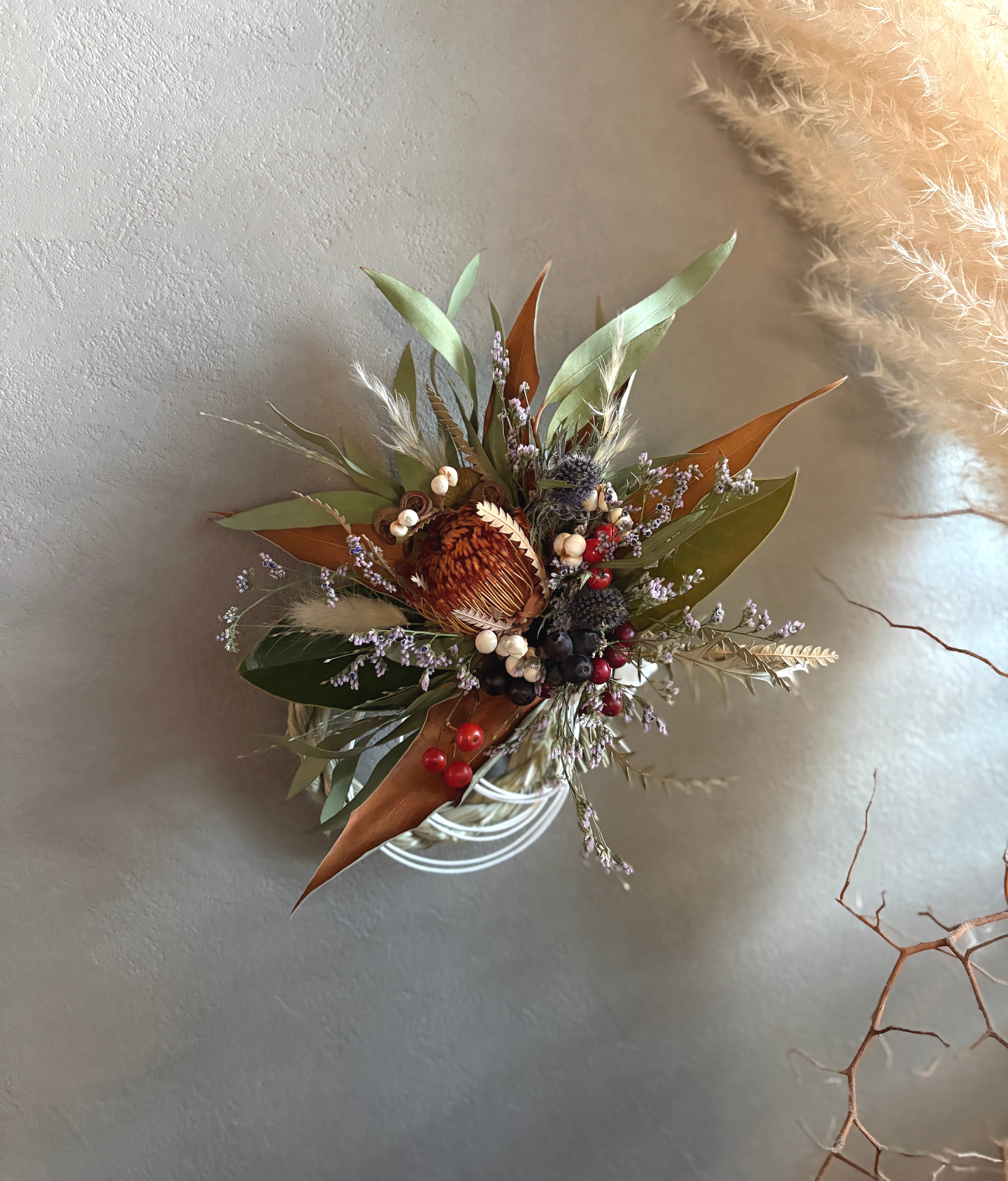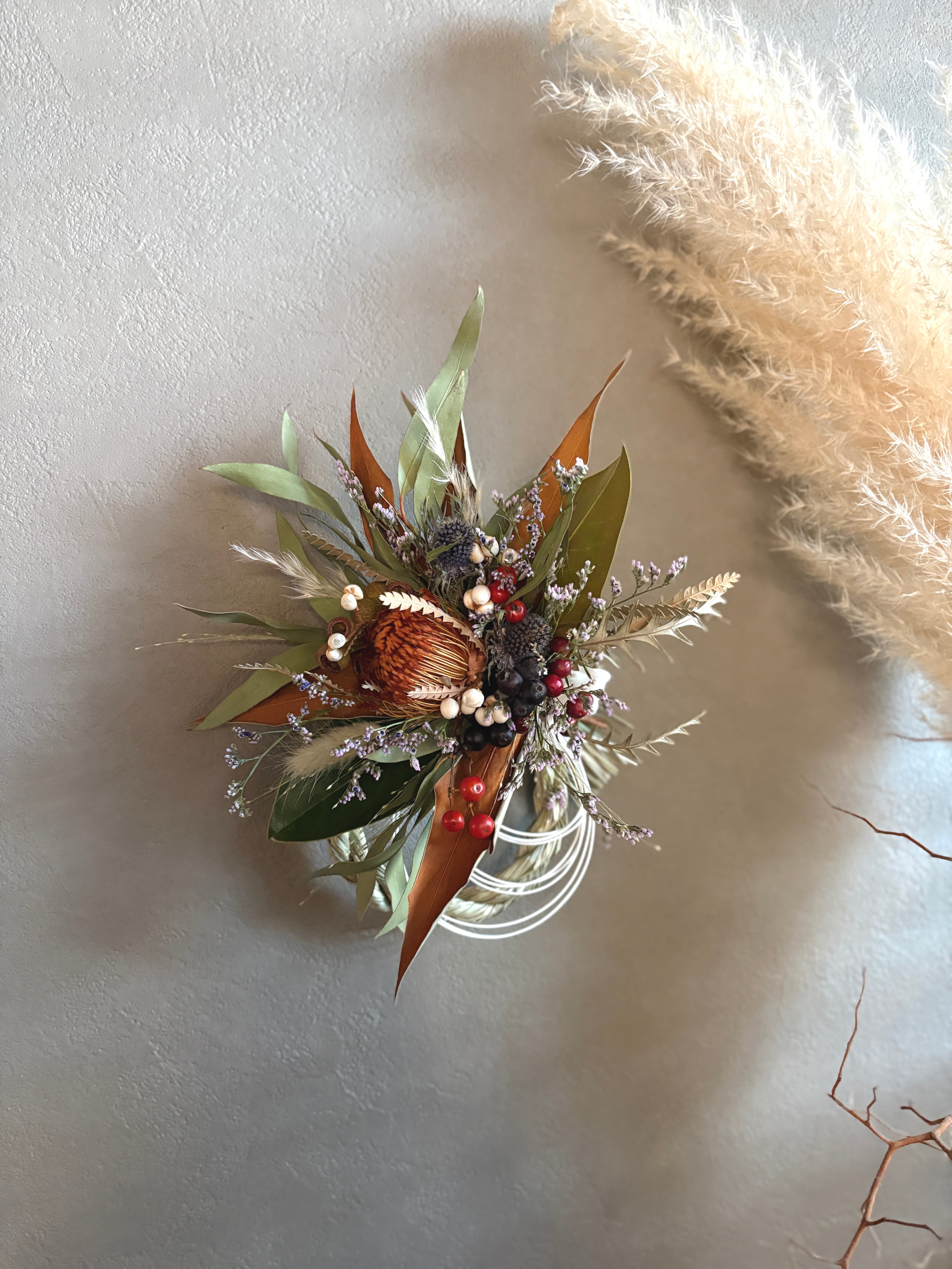 ユーカリをベースにフォルモーサ、グレビリアゴールド、アンバーナッツなどのネイティブプランツとパンパスグラス、サンキライ、ナンキンハゼなど季節の実などを合わせた鮮やかなあるしめ縄飾りです。