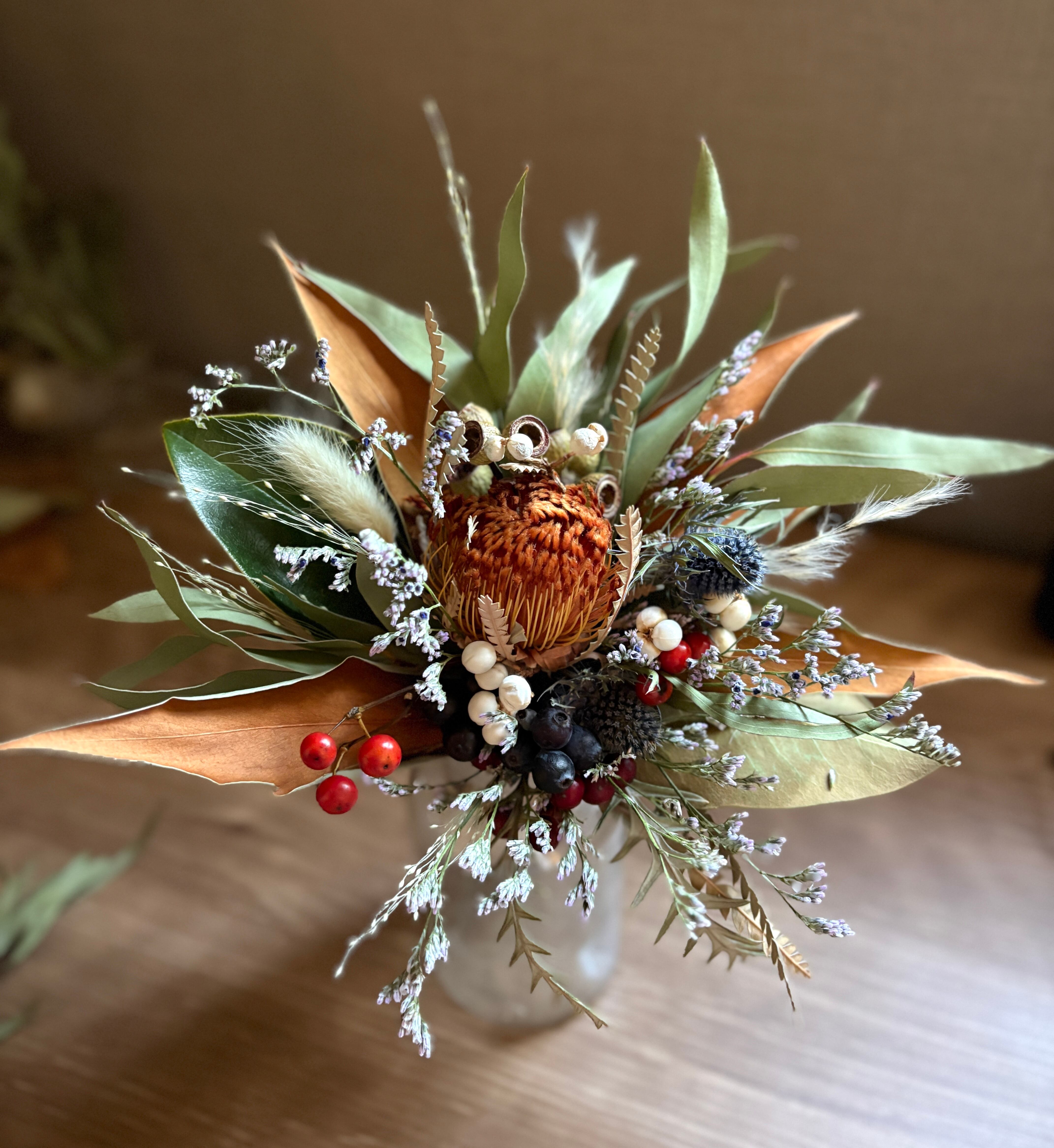 自然素材の特性により、日々色味の変化が見られます。ドライフラワーならではの風合いや色合いの深まりを、ぜひお楽しみください。
