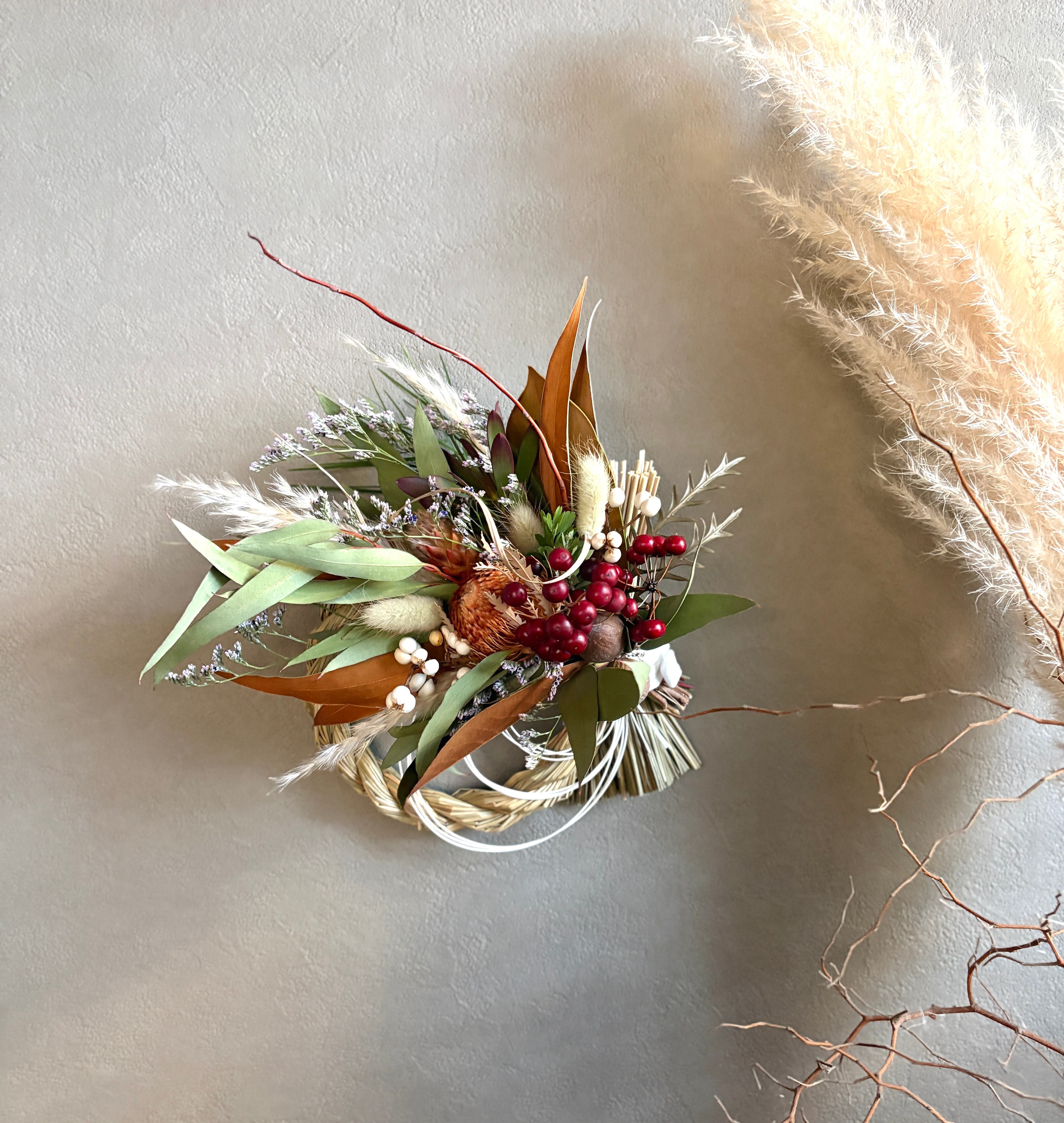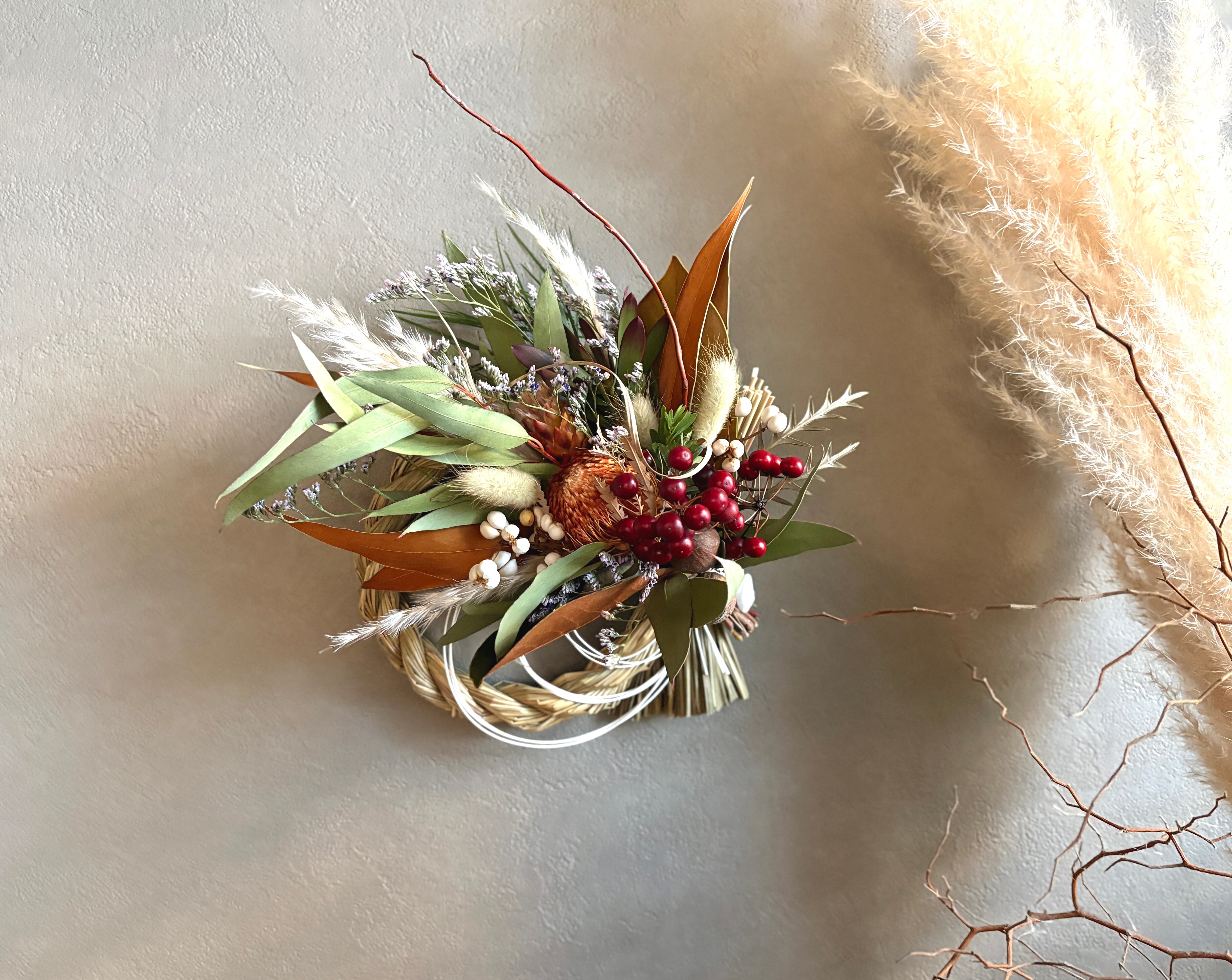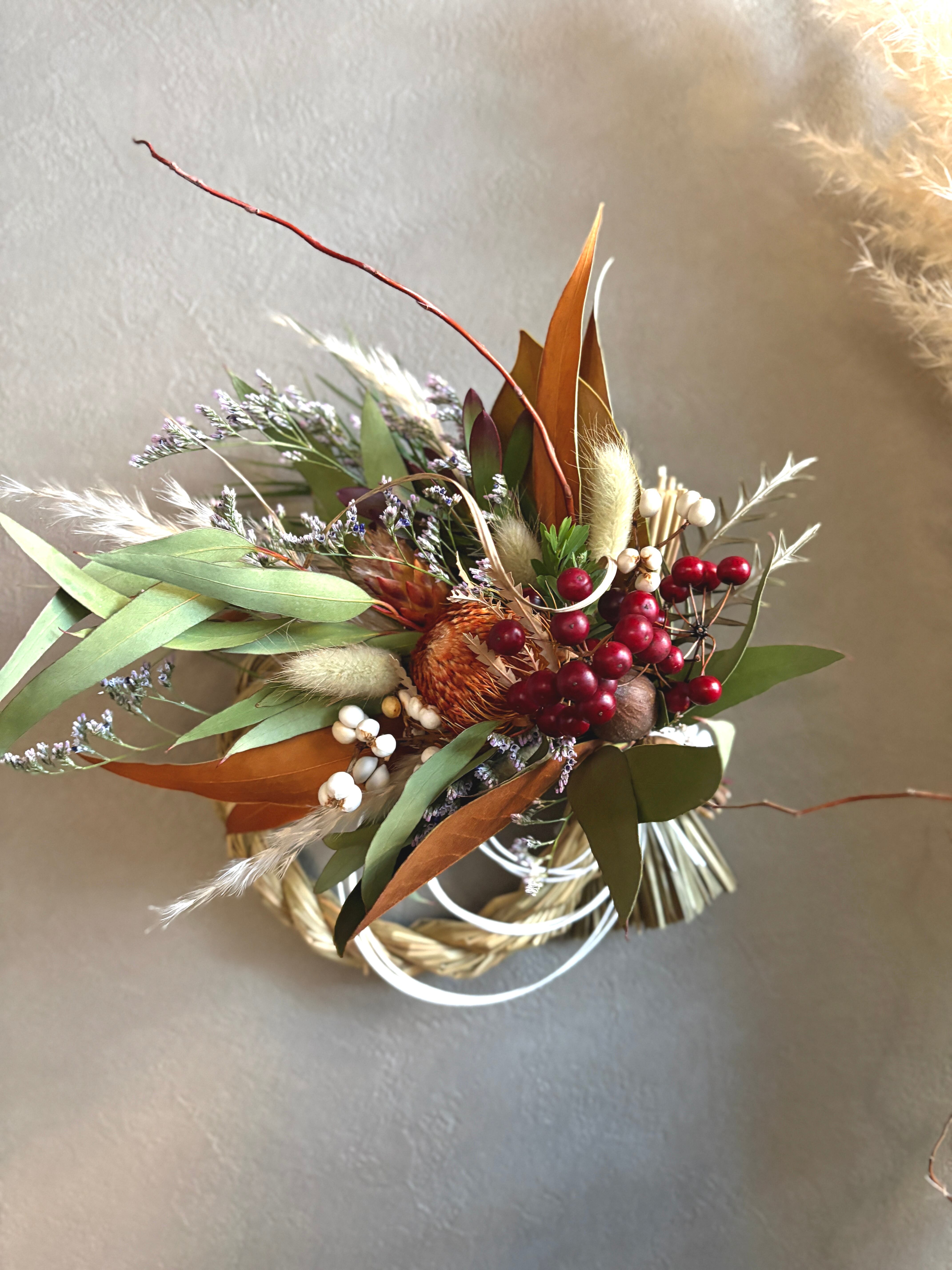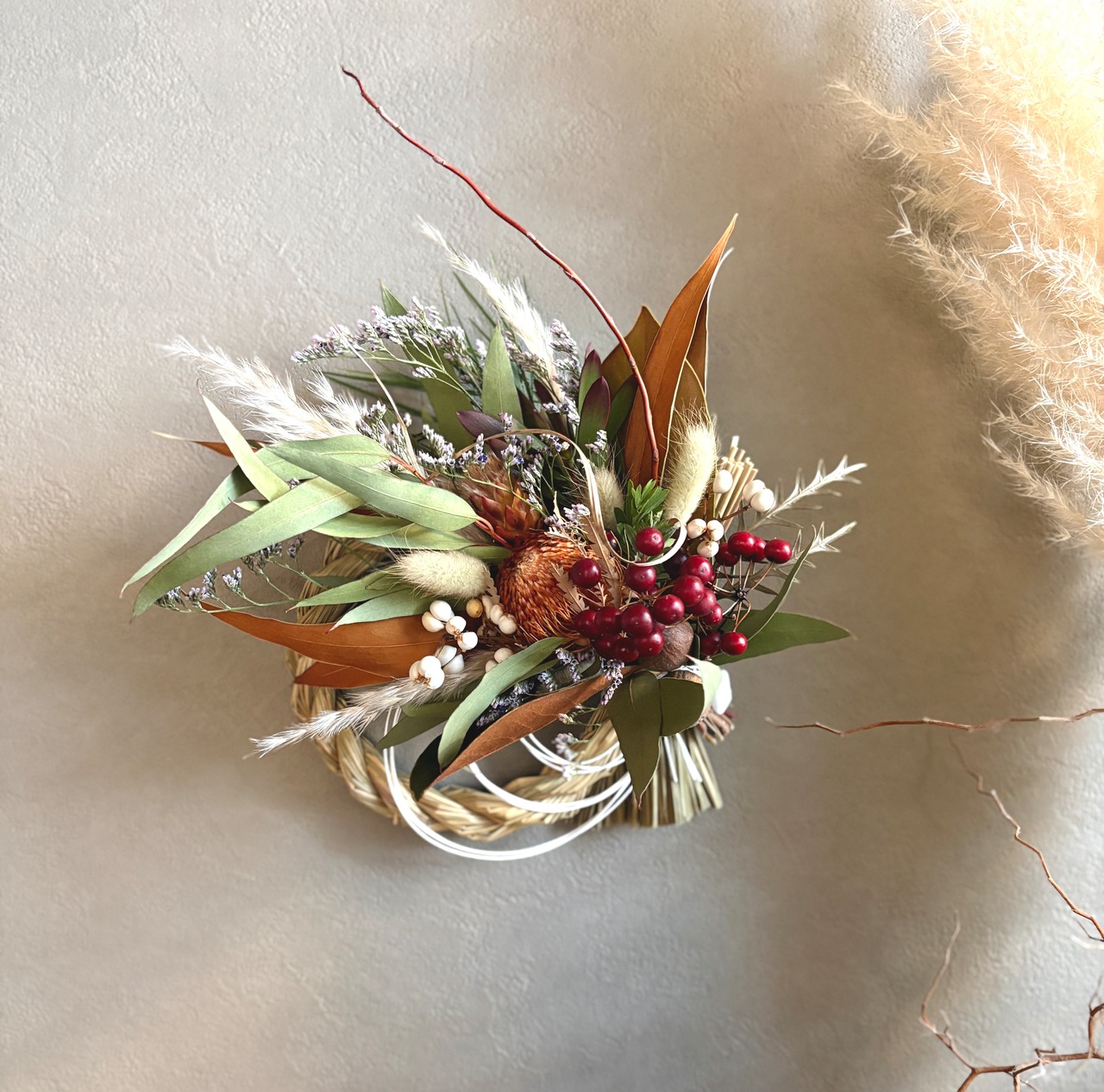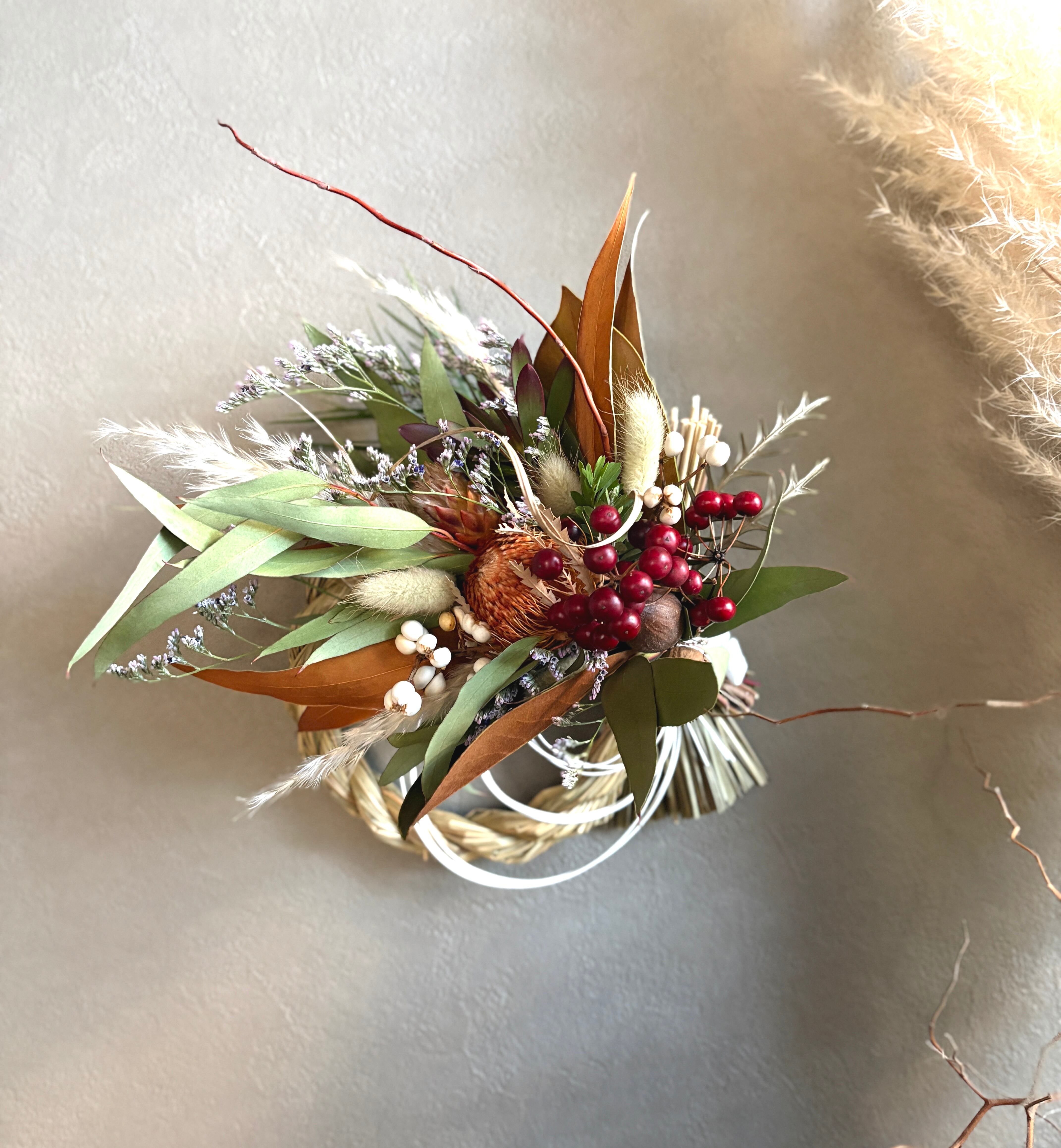 ユーカリとマグノリアをベースにフォルモーサ、リューカデンドロン、グレビリアゴールドなどネイティブプランツとサンキライ、ナンキンハゼなど季節の実を束ねた暖かみのあるしめ縄飾りです。