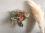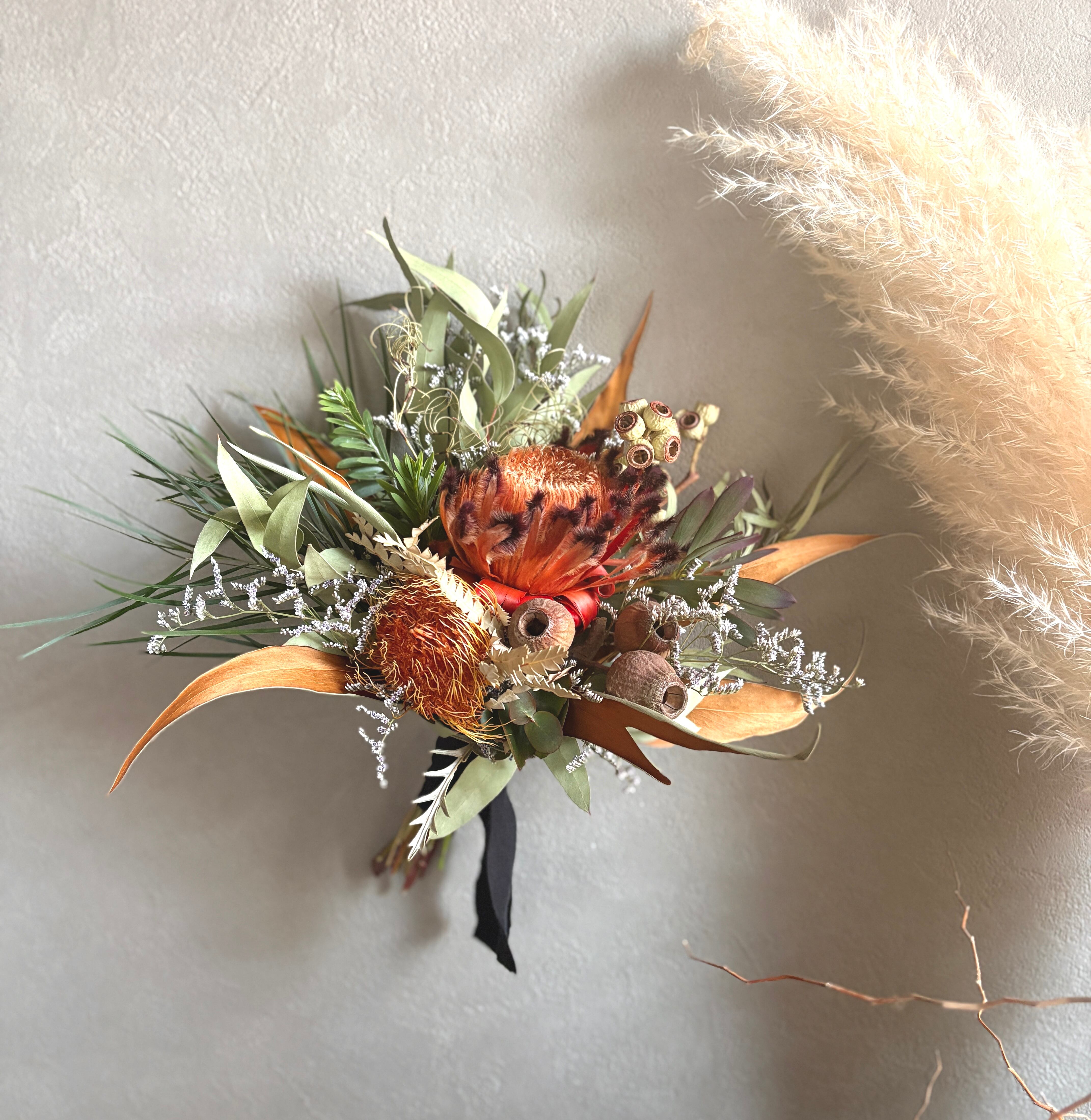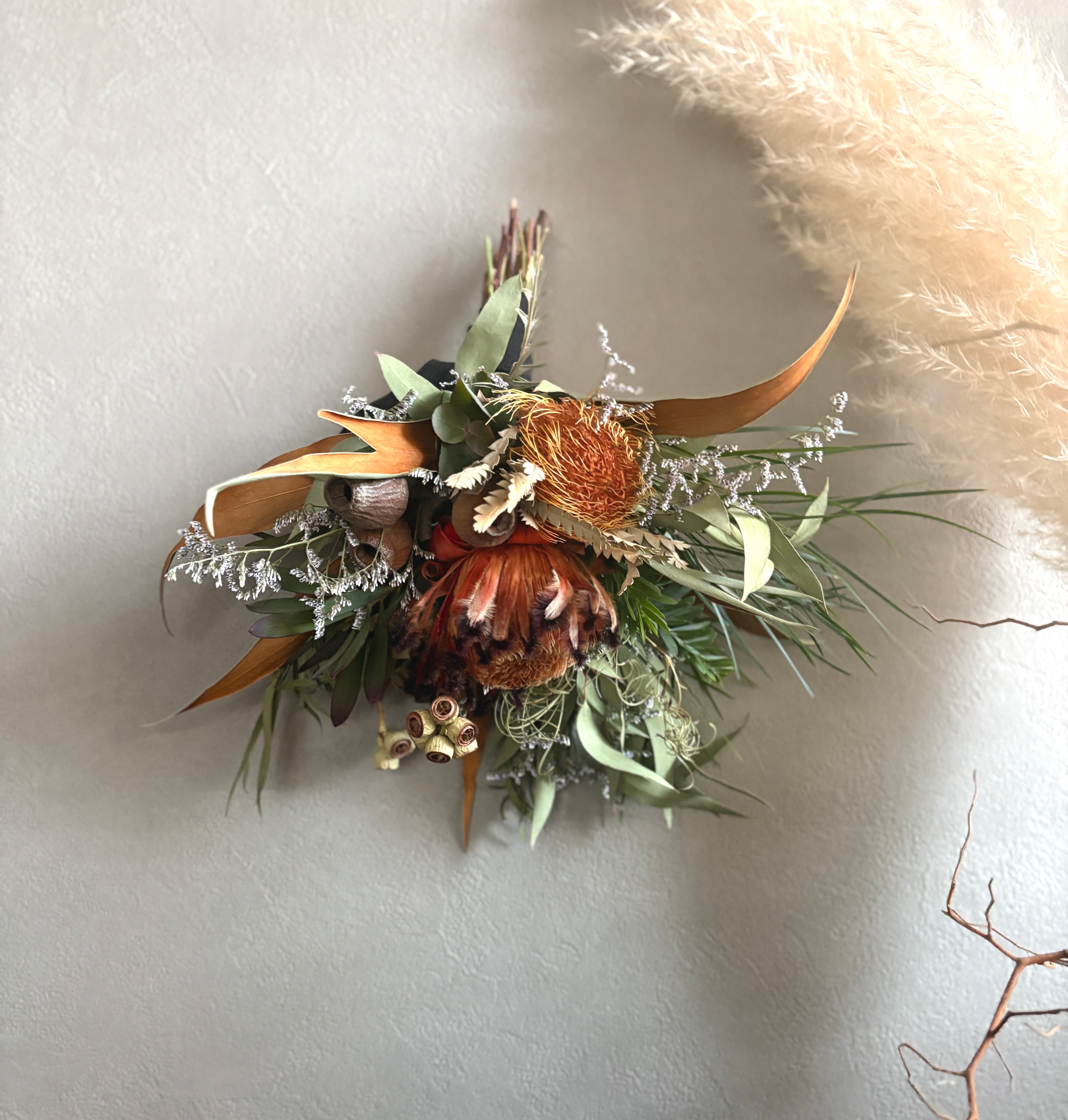 フォルモーサ、グレビレアゴールド、ベルガムナッツ、リューカデンドロンなどネイティブプランツもたっぷり束ねて、暖かみのあるスワッグに仕上げました。