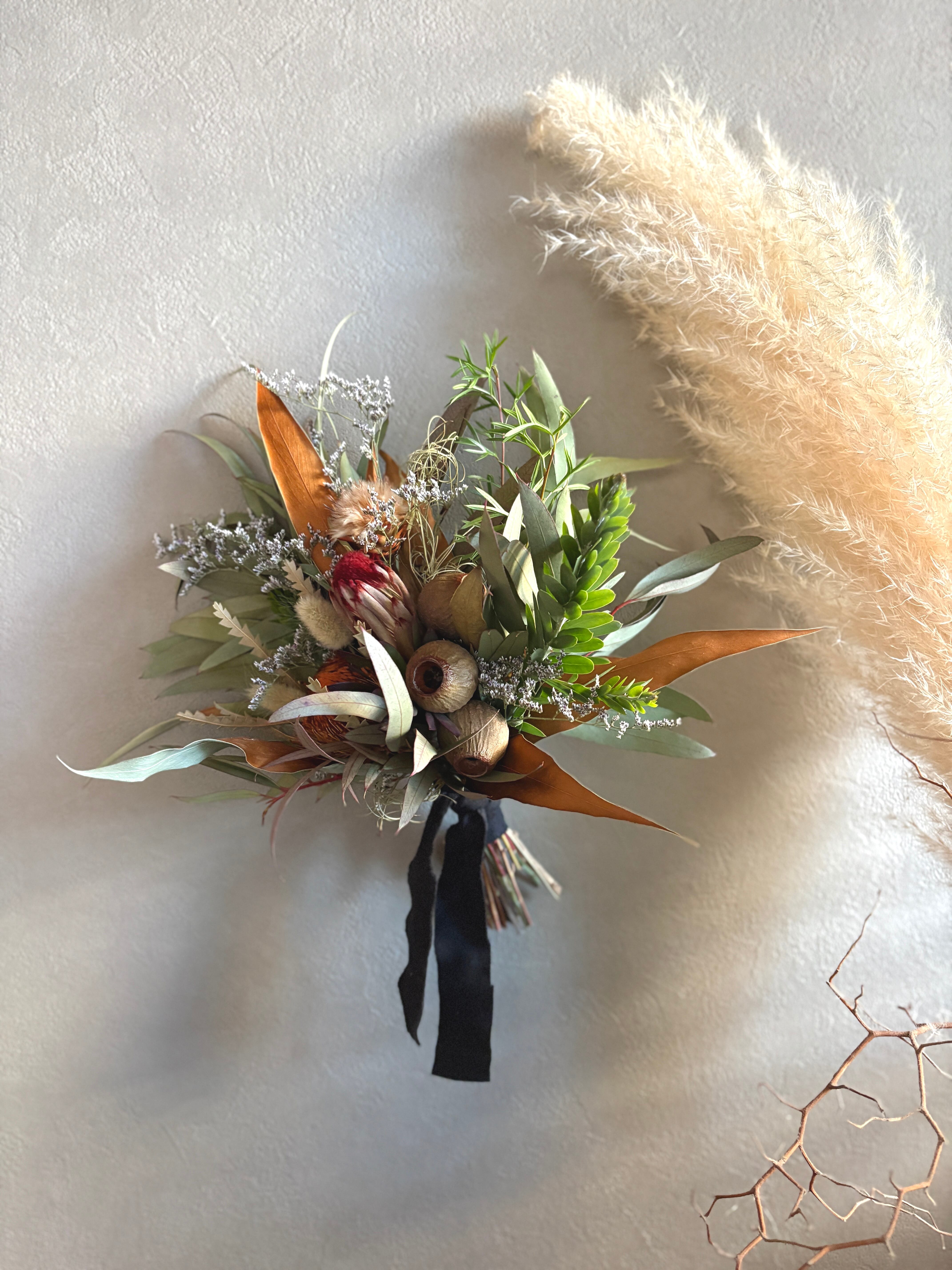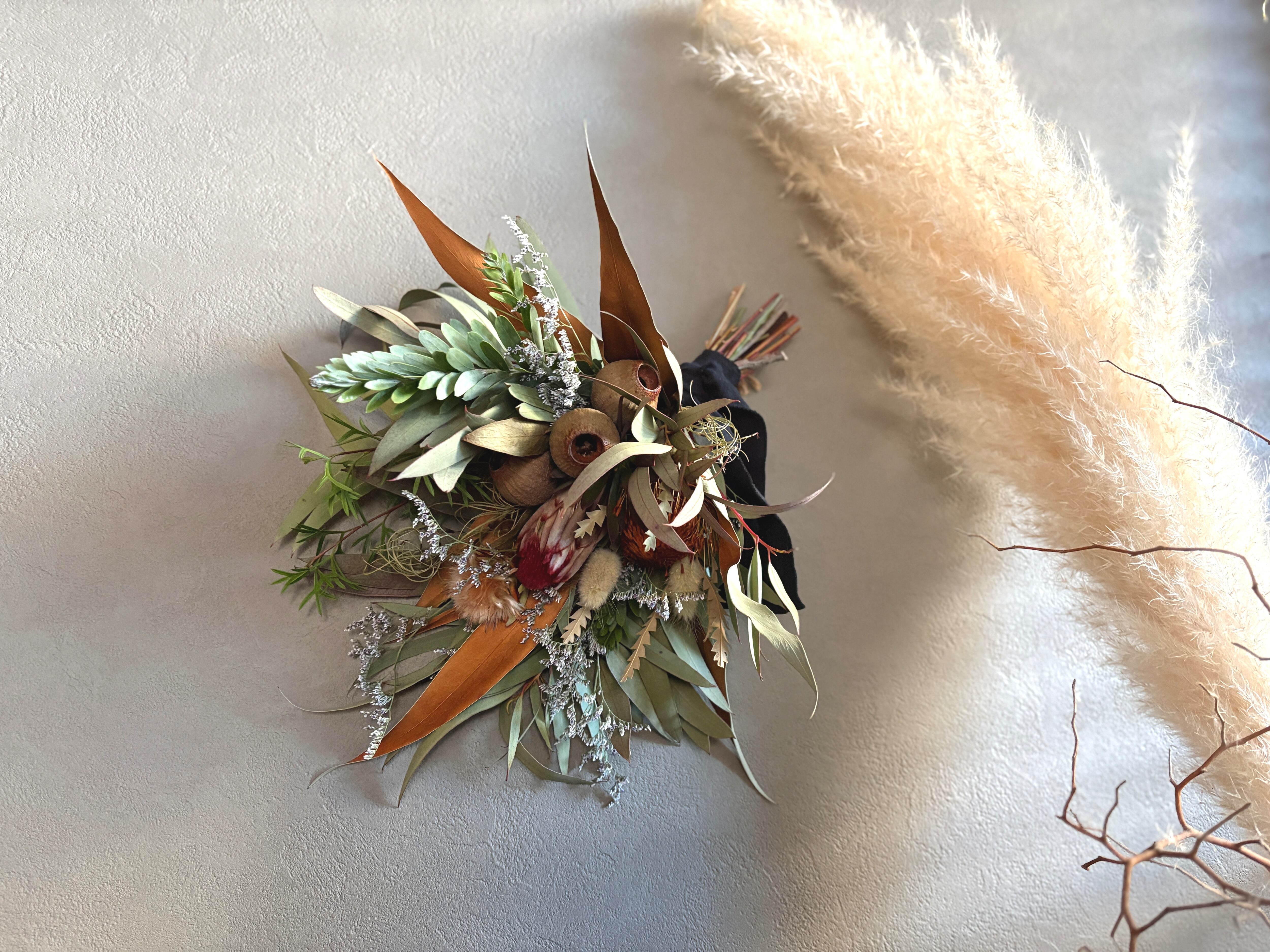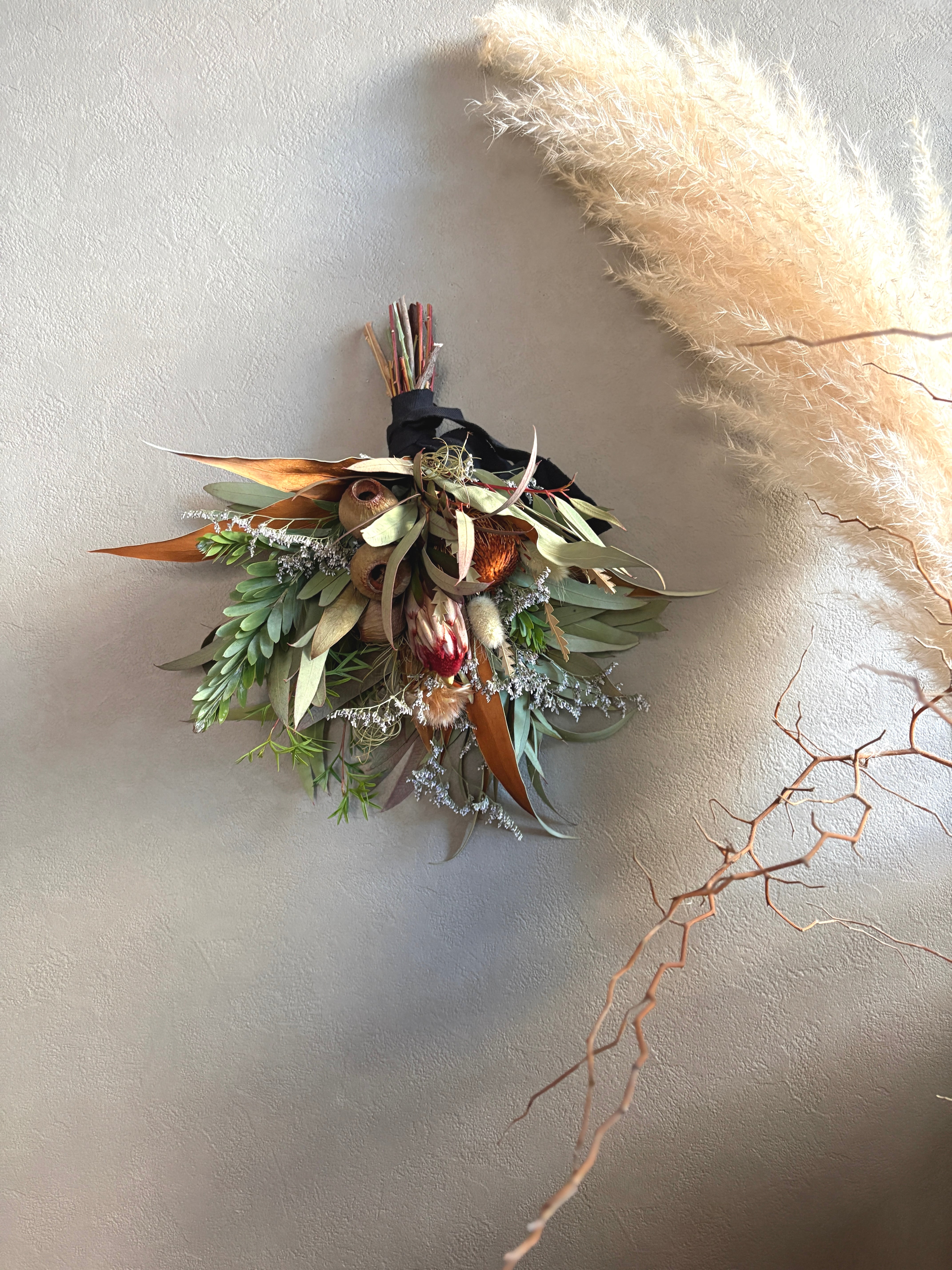 フォルモーサ、グレビレアゴールド、ベルガムナッツ、リューカデンドロンなどネイティブプランツもたっぷり束ねたスワッグに仕上げました。