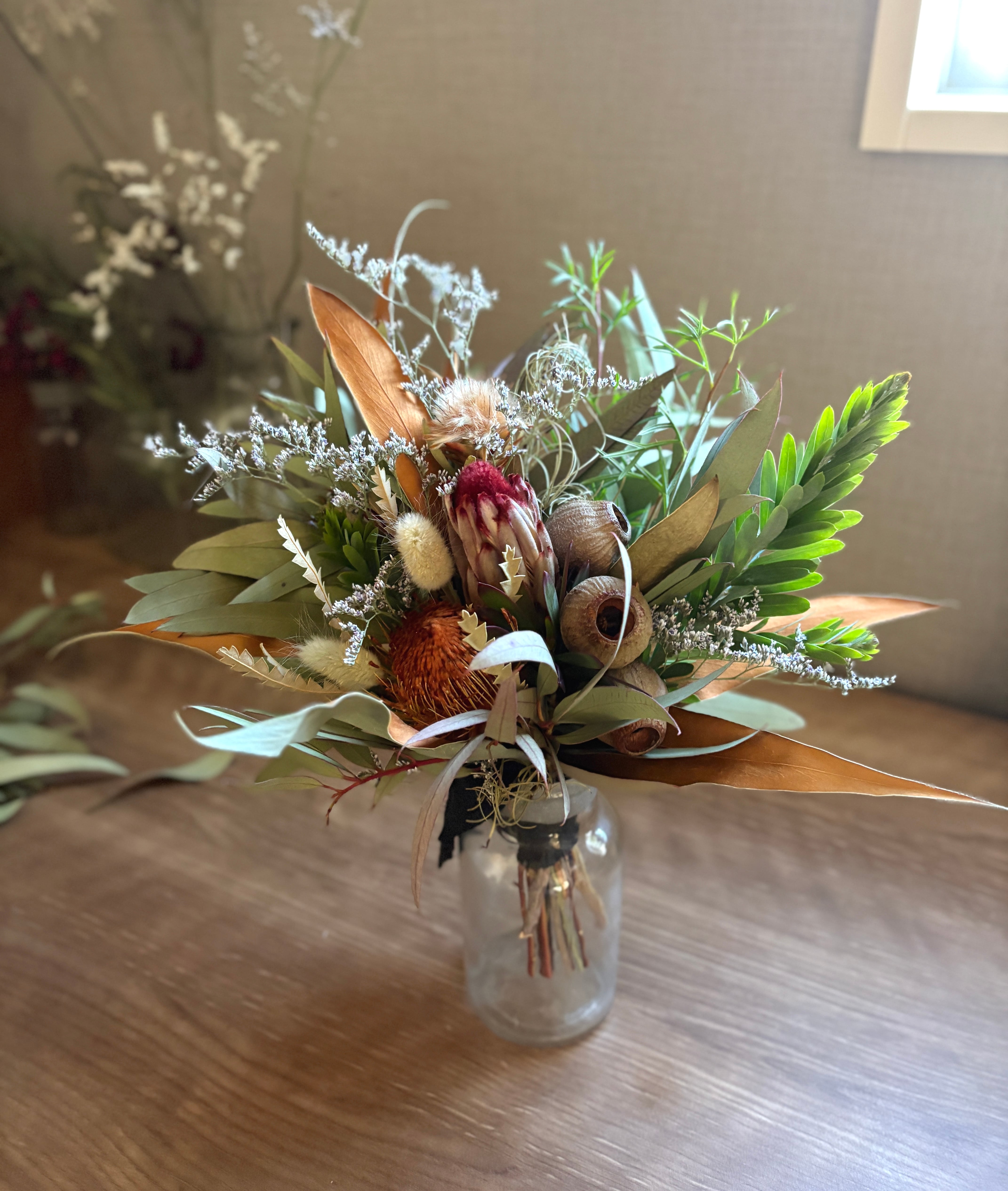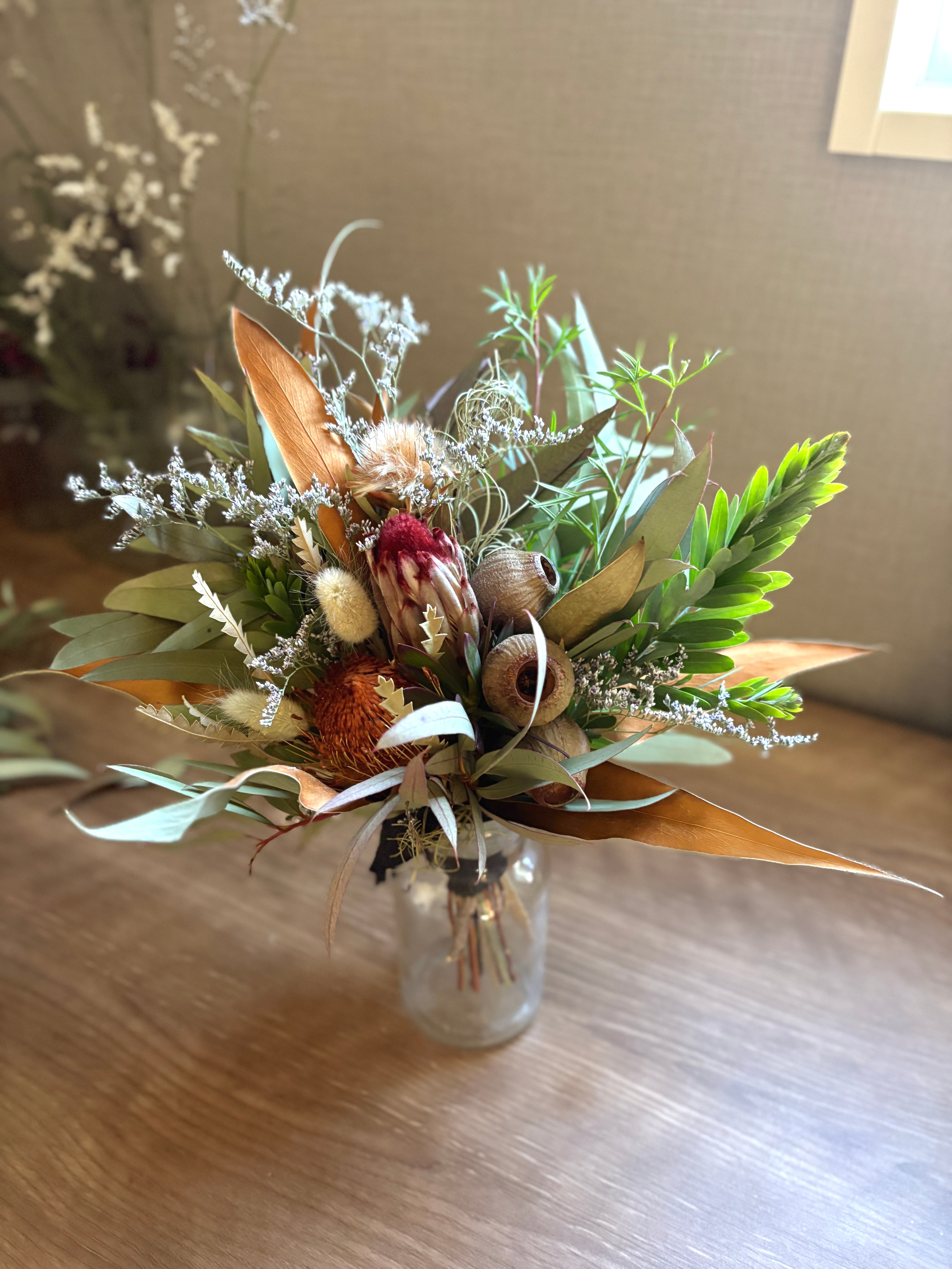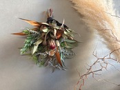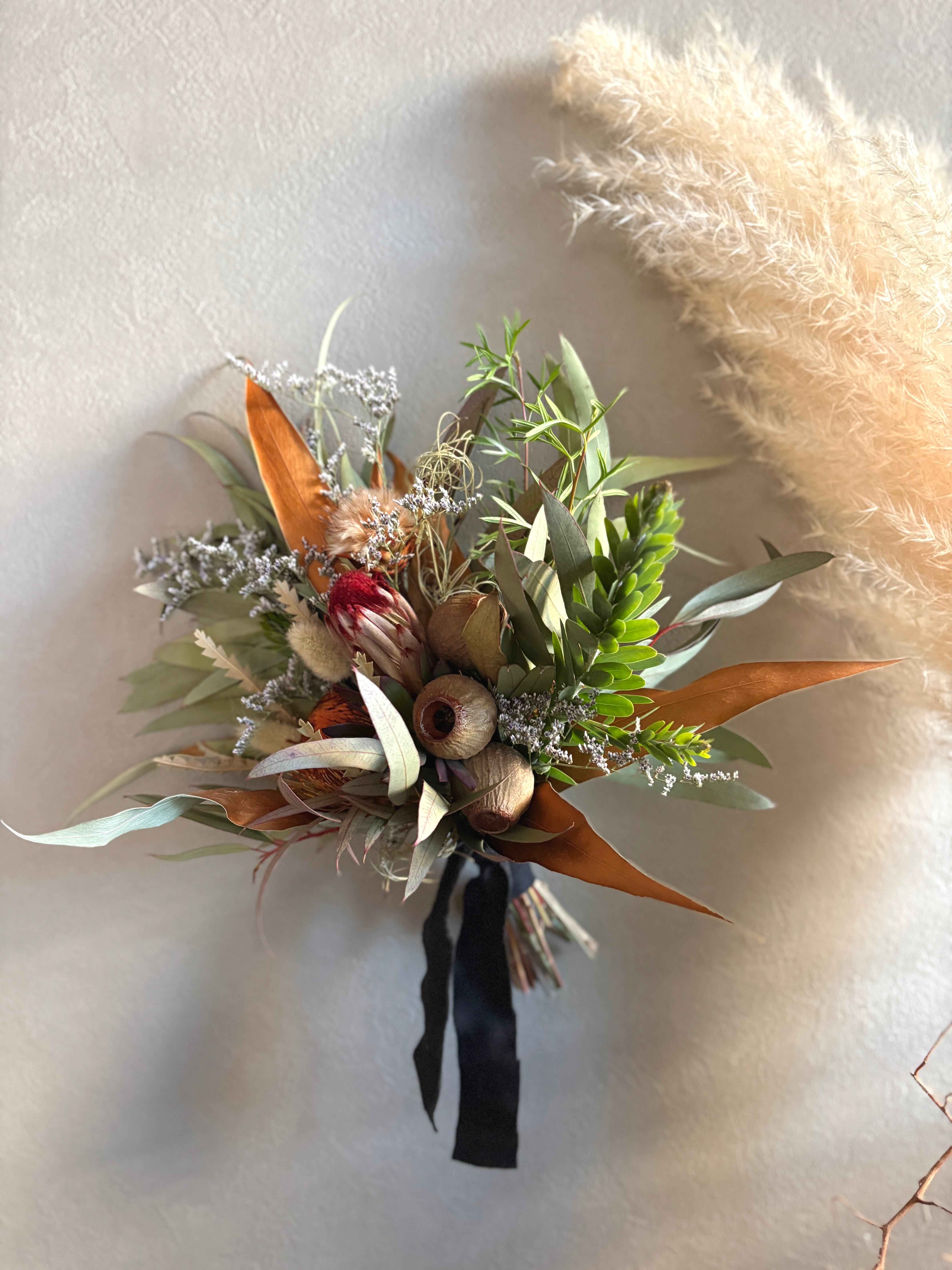 フォルモーサ、グレビレアゴールド、ベルガムナッツ、リューカデンドロンなどネイティブプランツもたっぷり束ねたスワッグに仕上げました。